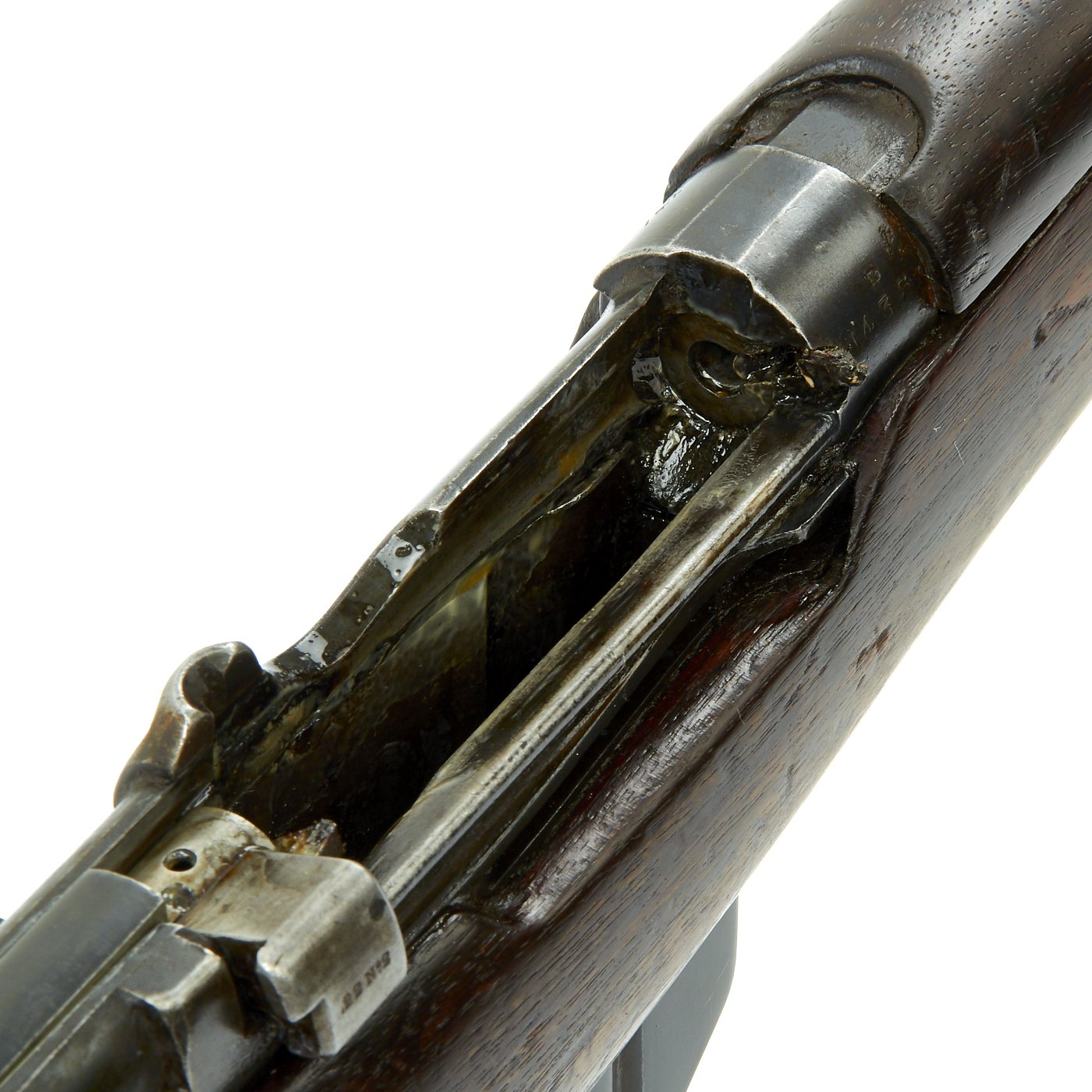 The markings on this rifle help trace the history of the refits it has gone through. On the top right of the stock cup it is marked with the original production information: