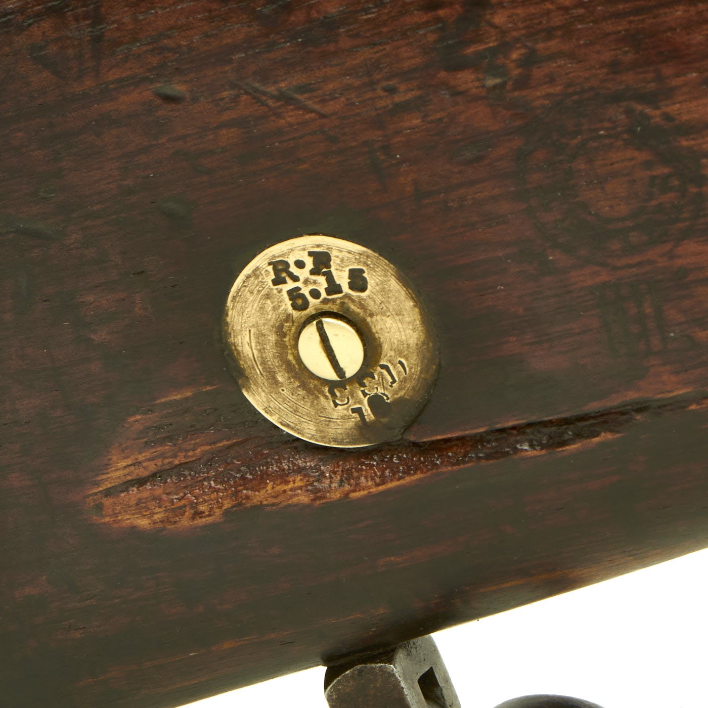 As time passed it saw extensive service, and there are numerous proofs and markings on the stock and metal, some of which are no longer completely legible. There are still regimental markings on the buttstock marking disc: R.P. / 5.15 / SS 11 / 18. There is also a very faint ENFIELD rondel stamped into the wood. It also has a crossed out serial number under a newly stamped one, 5920 / N.