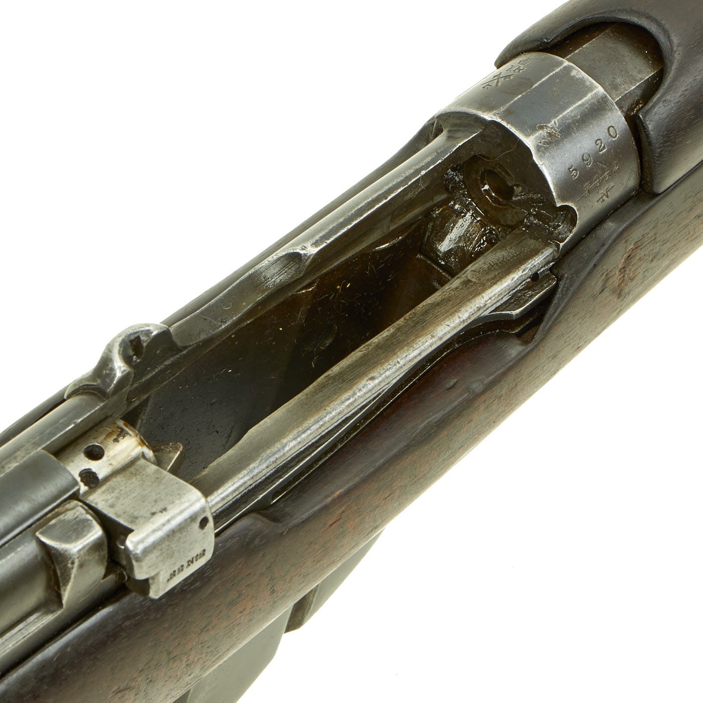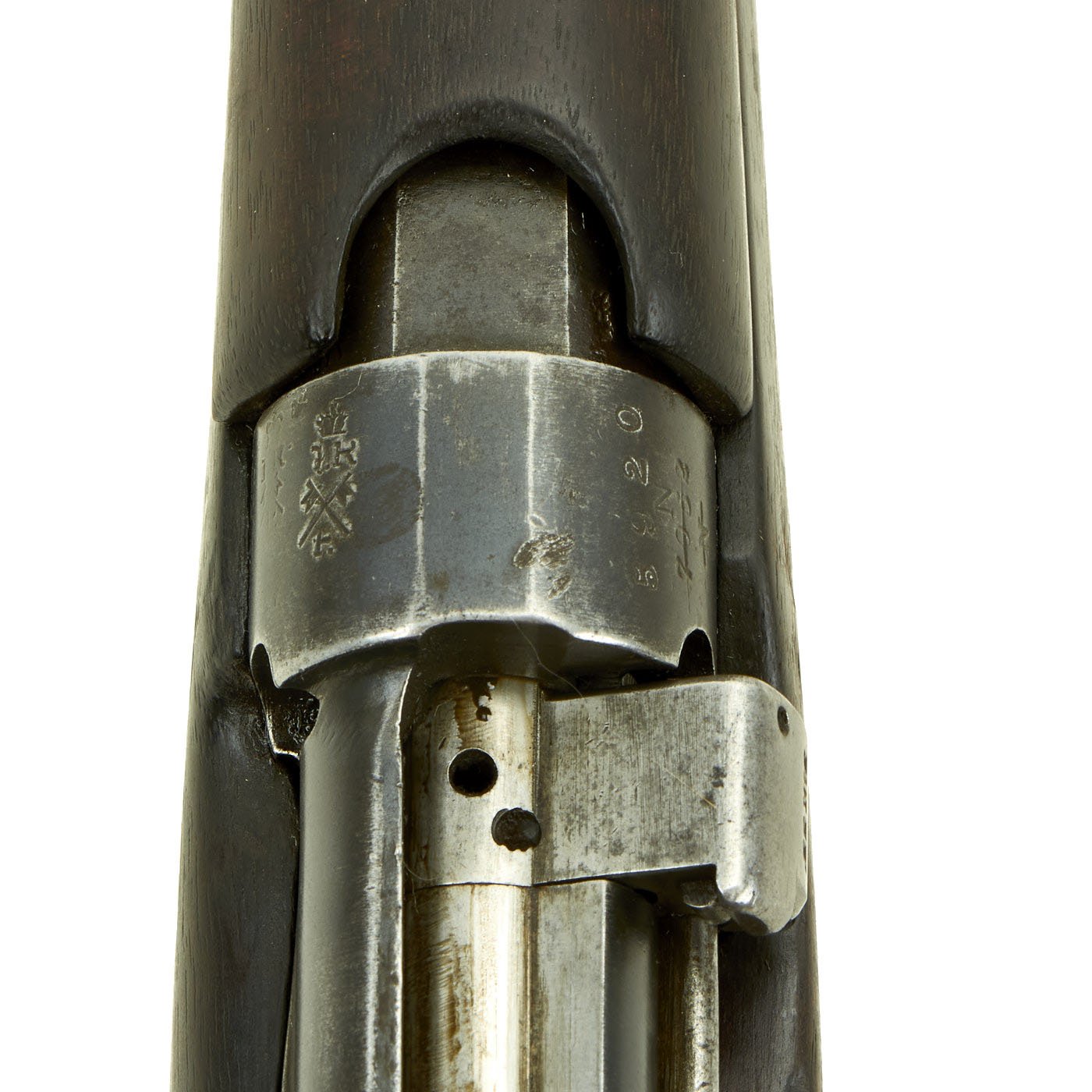 It is in fine condition and comes with it's correct "empty" .303 Caliber magazine with a closed bottom, which retains the spent cartridges. The bore is in good condition, with clear rifling, though it is a bit greasy, and we unfortunately do not have a cleaning rod small enough to clean it. It does appear to have some wear. The stock is solid, with the expected wear of age and long service. There are some repairs, as is common for a rifle that was converted not just once, but twice!