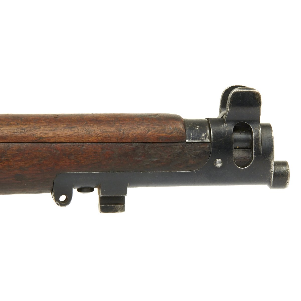 It is in fine condition and comes with it's correct "empty" .303 Caliber magazine, which conveniently retains the spent cartridges after they are ejected. The nose cap unfortunately is missing its correct stacking swivel and transverse screw. The bore is in very good condition, with clear rifling and a bright finish. The stock is solid, with the expected wear of age and lon service.