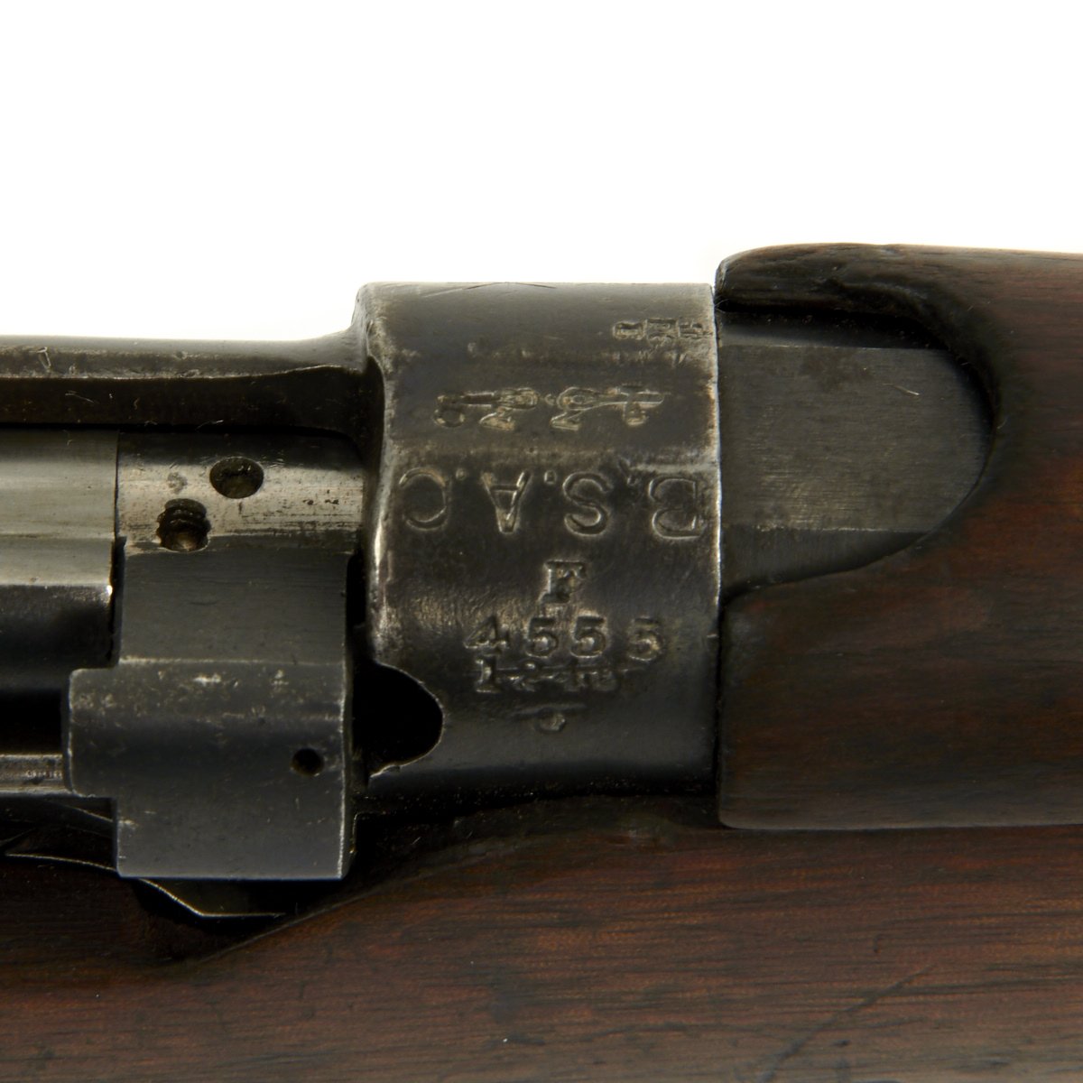The rifle is also stamped B.S.A. Co. on the left face of the butt stock. Most likely. this rifle was converted to a .22 trainer by the Birmingham Small Arms Co., in the 12th week of 1938. The original barrel was replaced with a new .22 barrel. It would have been used by soldiers learning marksmanship in the early days of WWII.