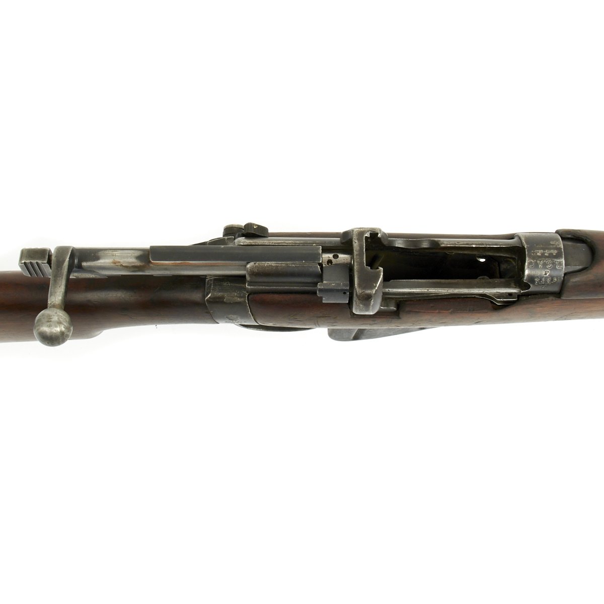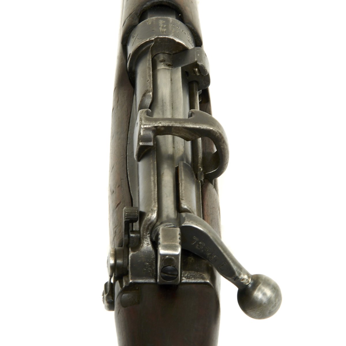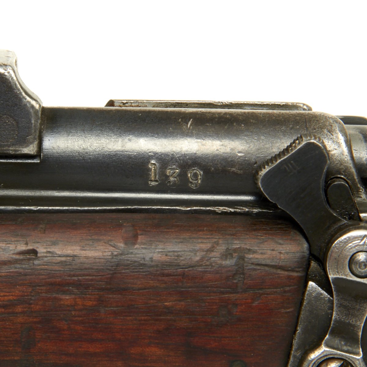 As time passed it has been updated with other changes. It bears a large stamp of 139 on the left face of the butt stock and receiver, indicating its rack number no doubt. The action is marked with many proofs, crossed out serial numbers, as well as a "sold out of service" marking. The original serial number was 1248 / O, but now is indicated as F / 4555.