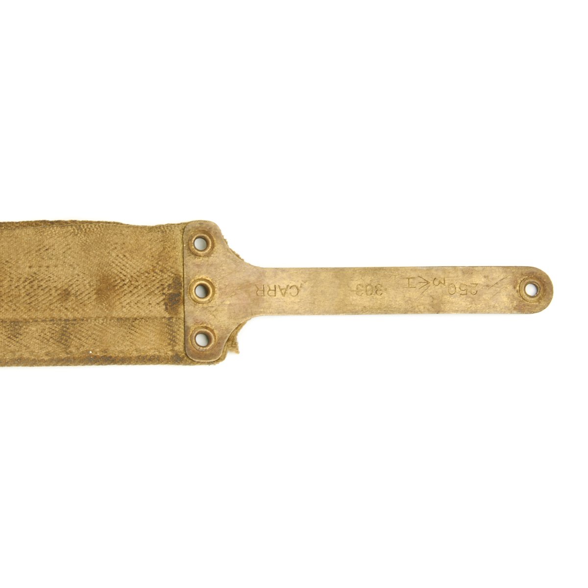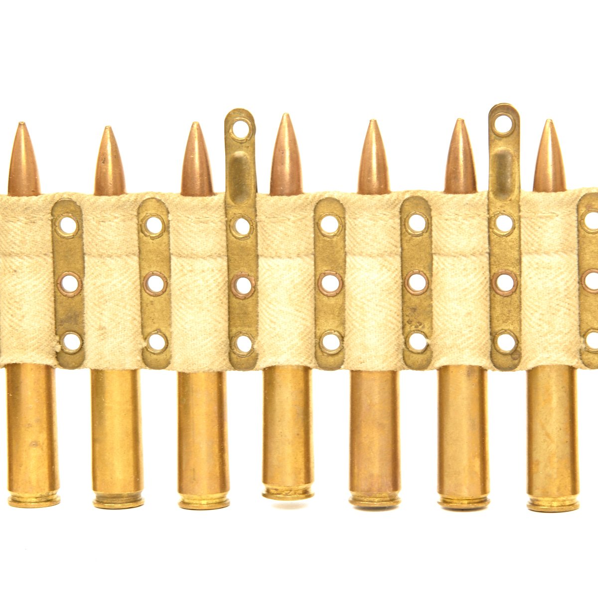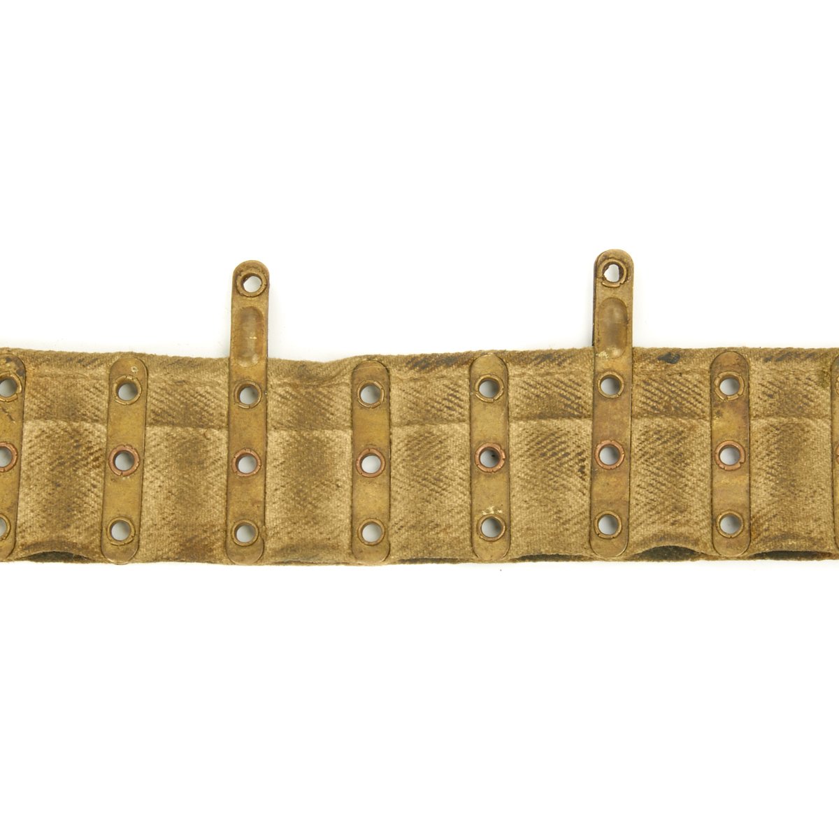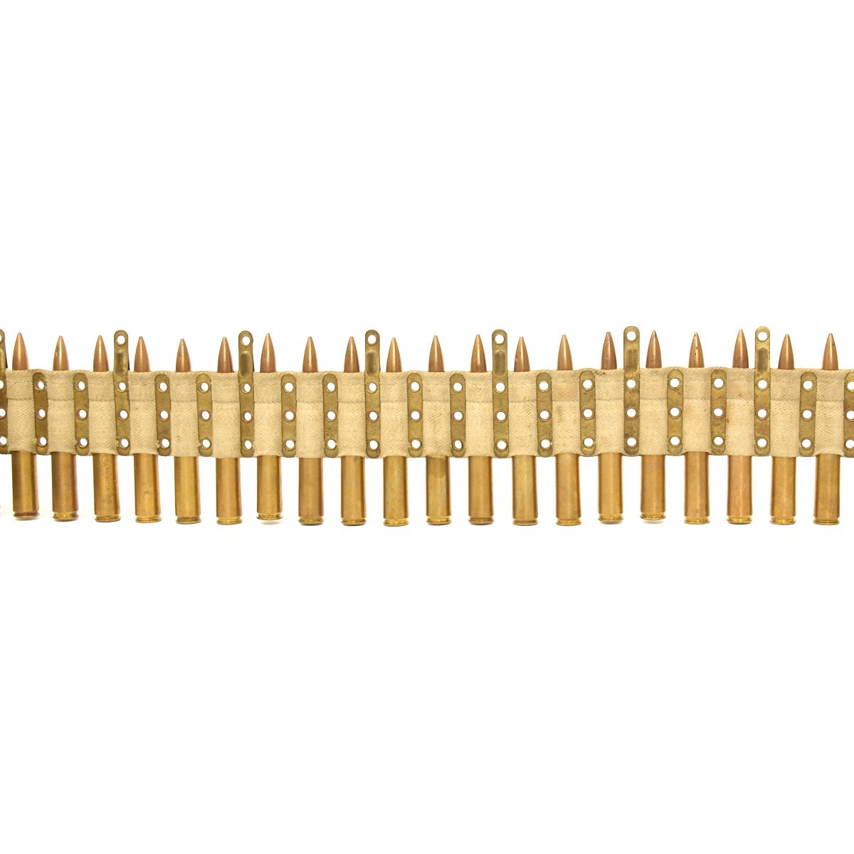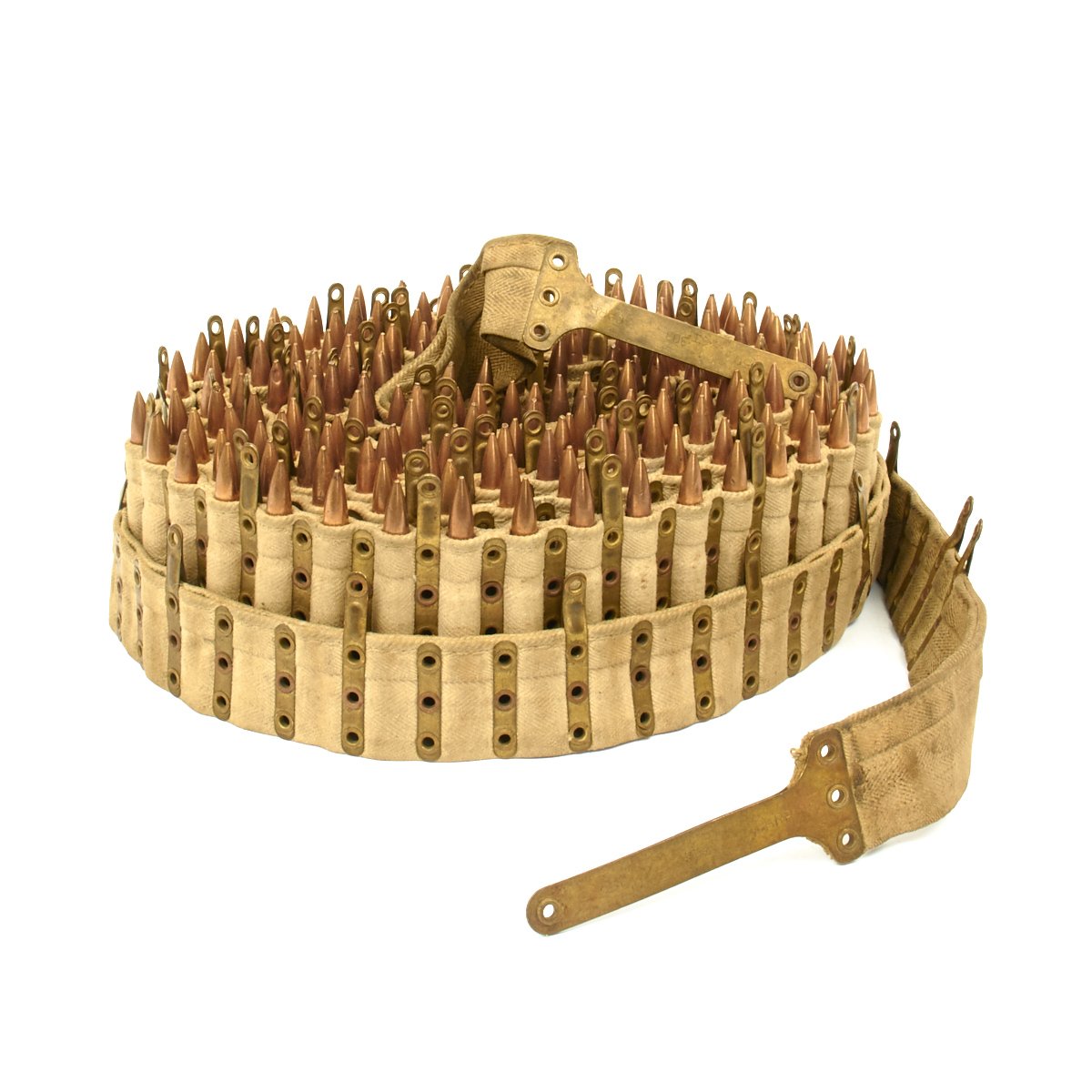 Original Item: Only One Available. Original issue Vickers Machine Gun belt from WWII dated 1941. Complete with early brass long dividers every third round. The function of the long dividers is to indicate how far the cartridge is supposed to be inserted in the belt. Each belt has a brass leader at each end, allowing the belt to be inserted from either end. The leaders are marked with the belt capacity (250 rounds), the caliber (.303), the Ordnance Broad Arrow, the manufacturers name CARR.