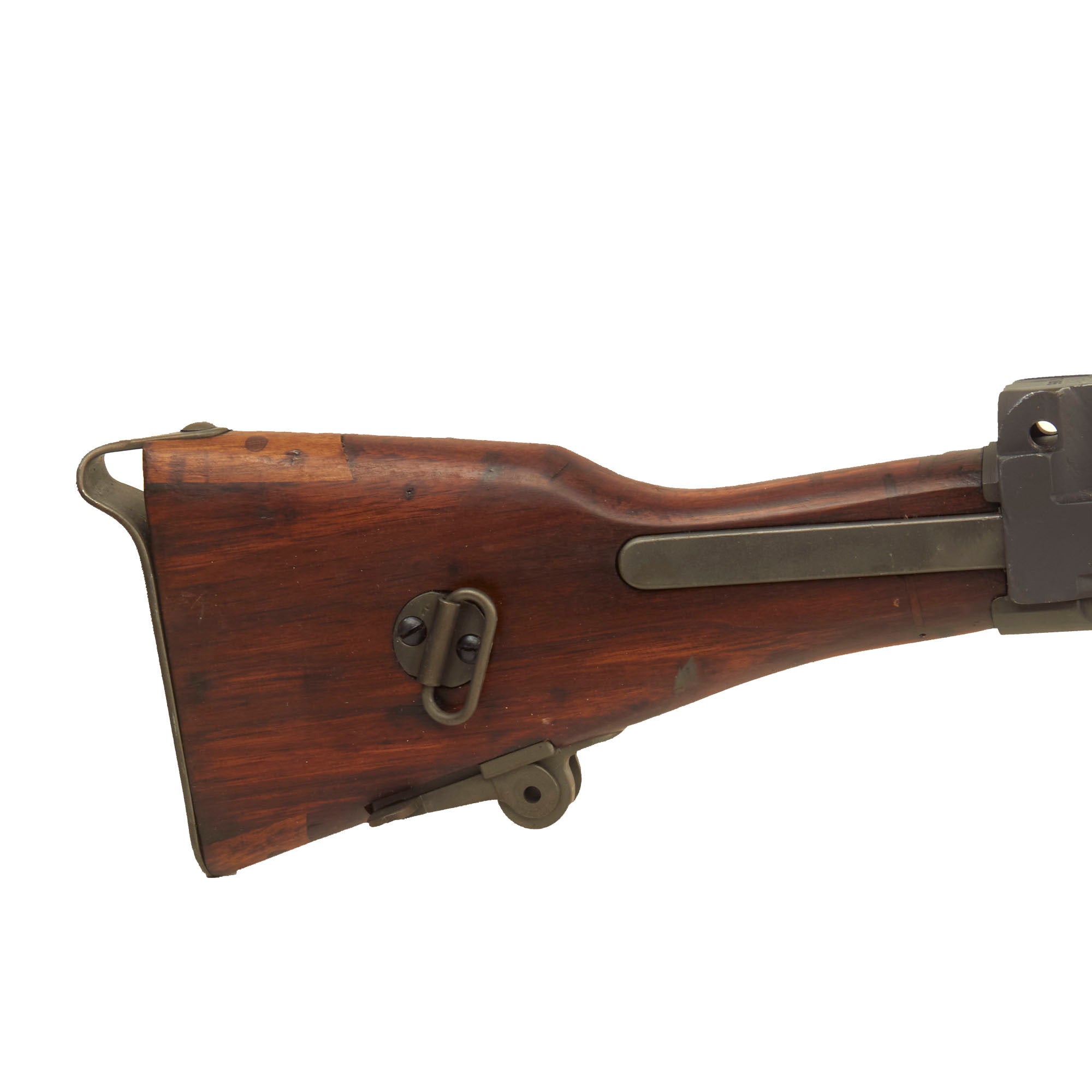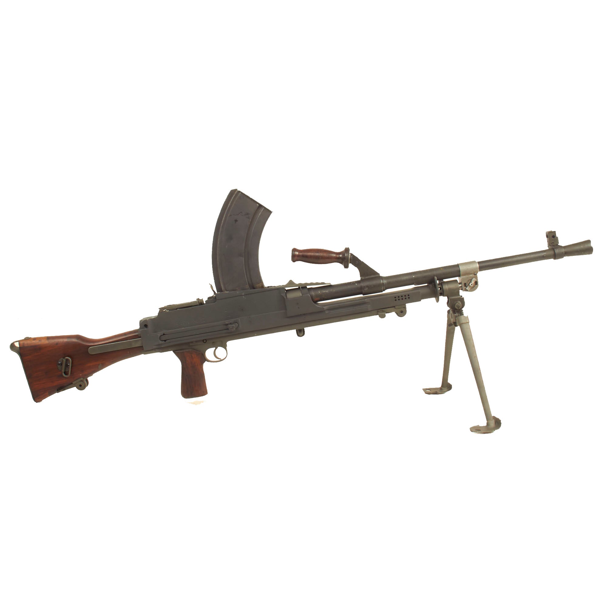 Original Item: Only One Available. Constructed from a legally demilitarized (de-milled) parts set, this is a fantastic display example of the iconic Bren Light Machine gun, as used by British forces during WWII. It is built from all original parts on an original BATF compliant non-firing display receiver, making this a 100% legal display machine gun. This receiver was created by using portions of the original torch cut receiver, including the barrel bushing, combined with some new made steel portions. It has properly had a 25% section of the total length completely replaced entirely with solid steel bar stock. Meaning a 1/4 length section of the display receiver is solid steel, making this totally legal to own without a license of any kind.