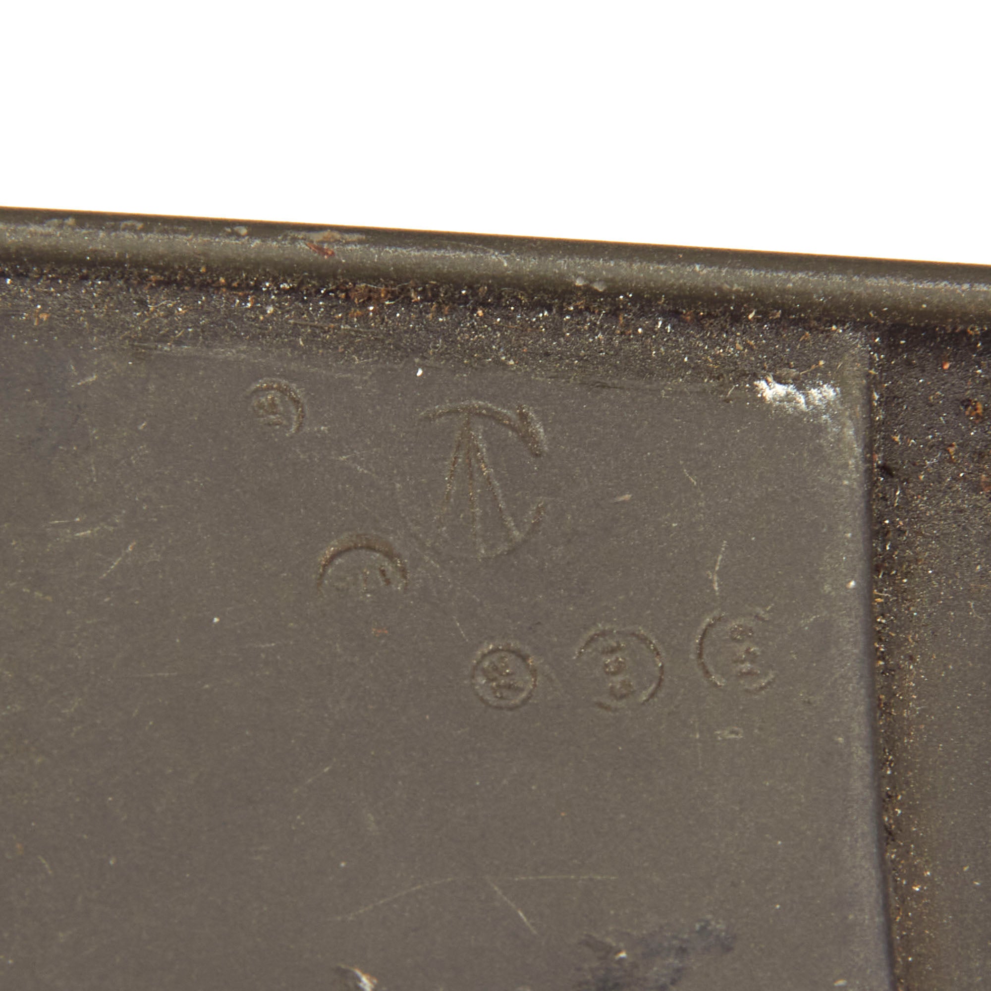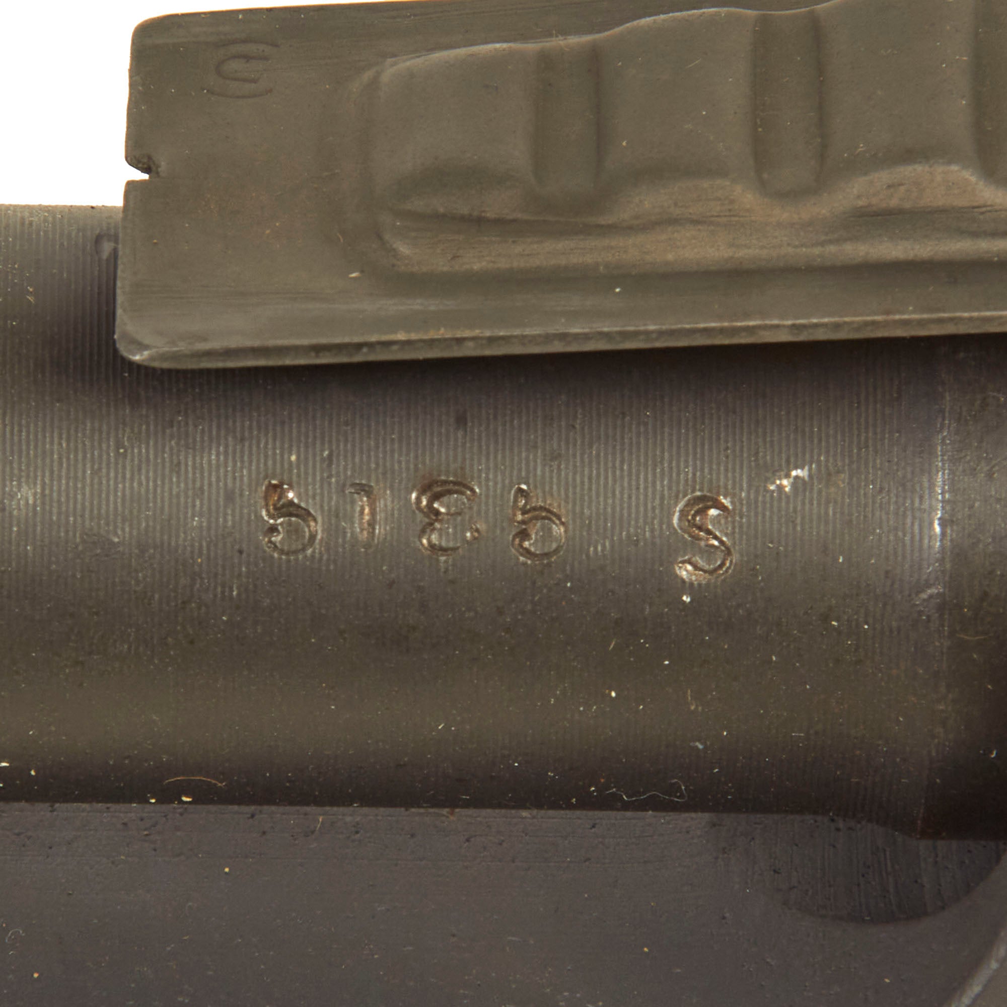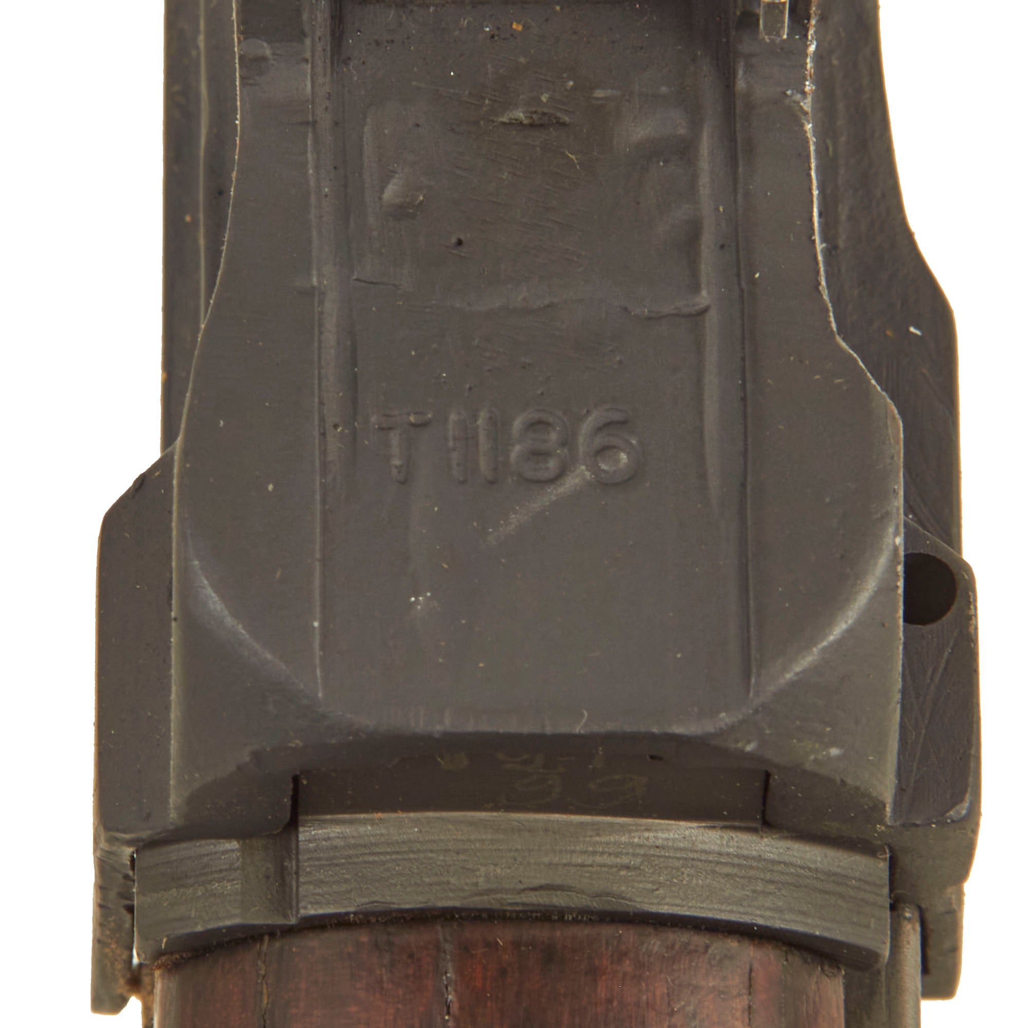 Overall the display gun is in excellent condition, as the receiver any many parts were fully refinished during the construction process. The rear sight is fully intact, and functions well. Pistol grip and butt stock are in solid shape, with a great color and grain. The butt stock does have some repairs to it, which were very common during service, especially the one on the top rear, caused when the gun was dropped onto the "lip" of the butt plate. Later examples would have a totally flat butt plate.