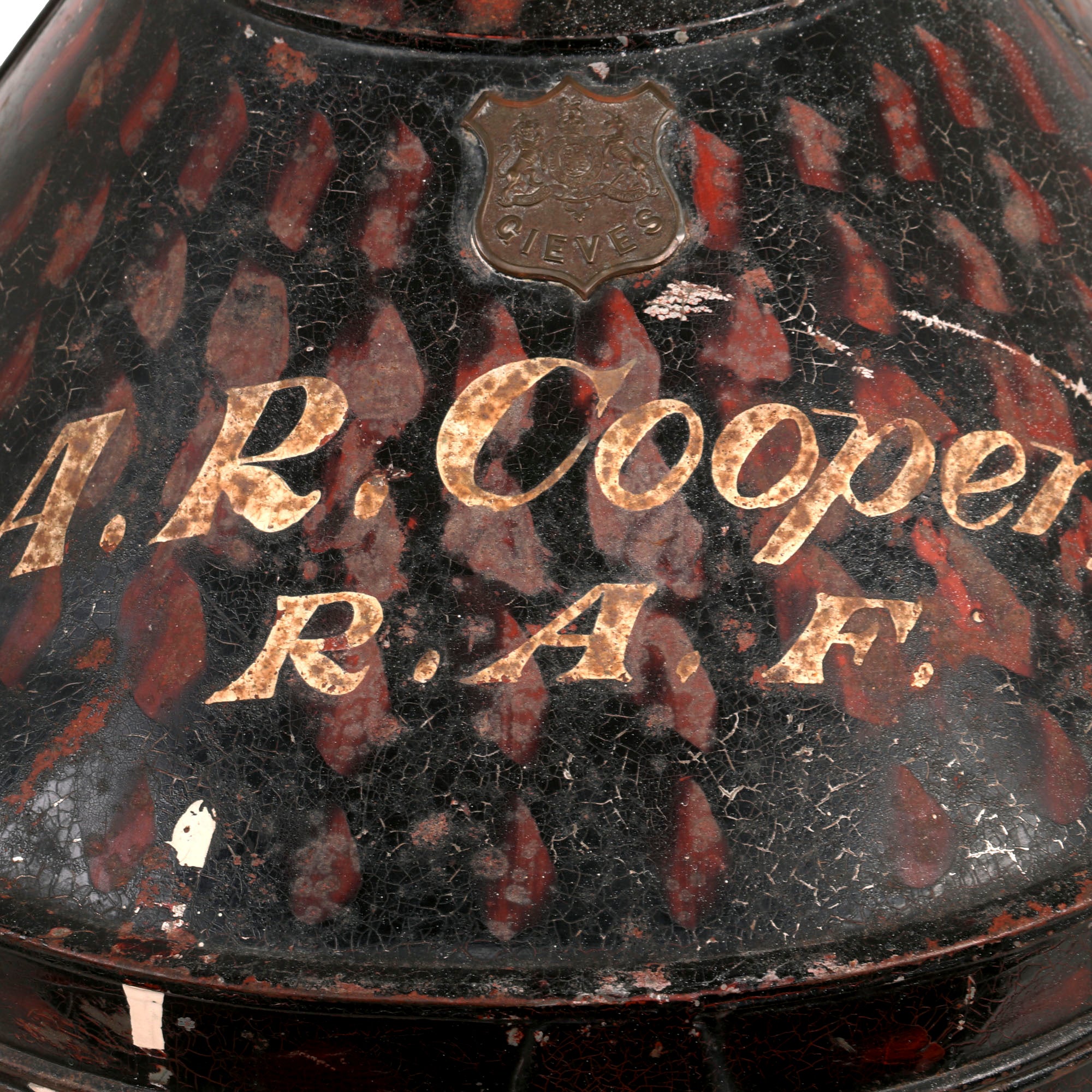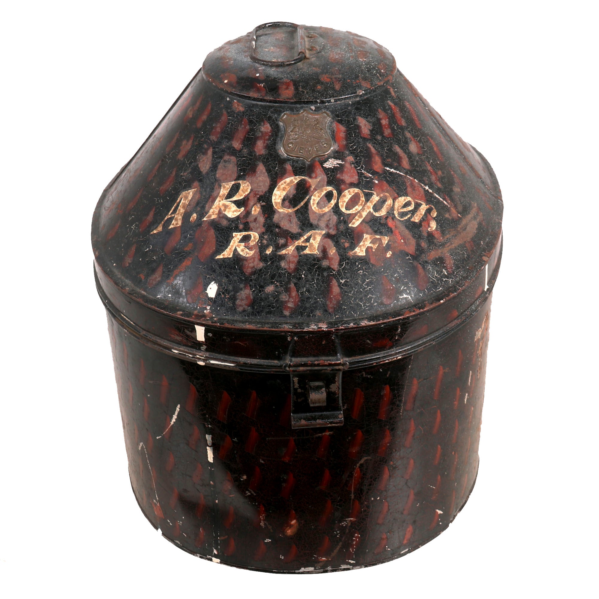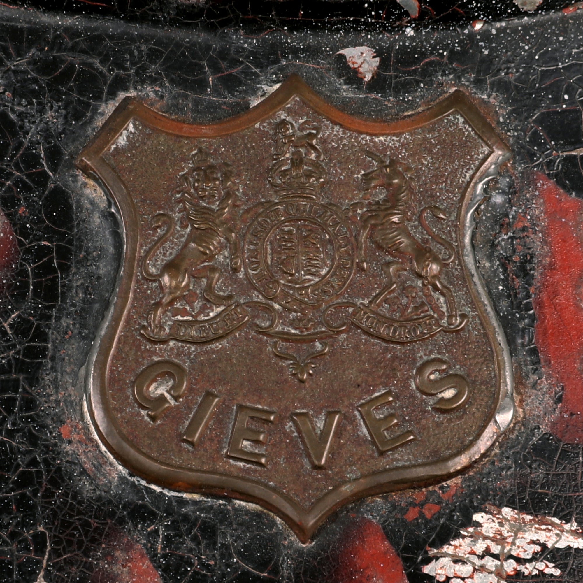 The transit tin has a brass shield near the top, which bears the name of known Army & Navy Outfitter GIEVES Limited of London, and below this it is named to the original owner: