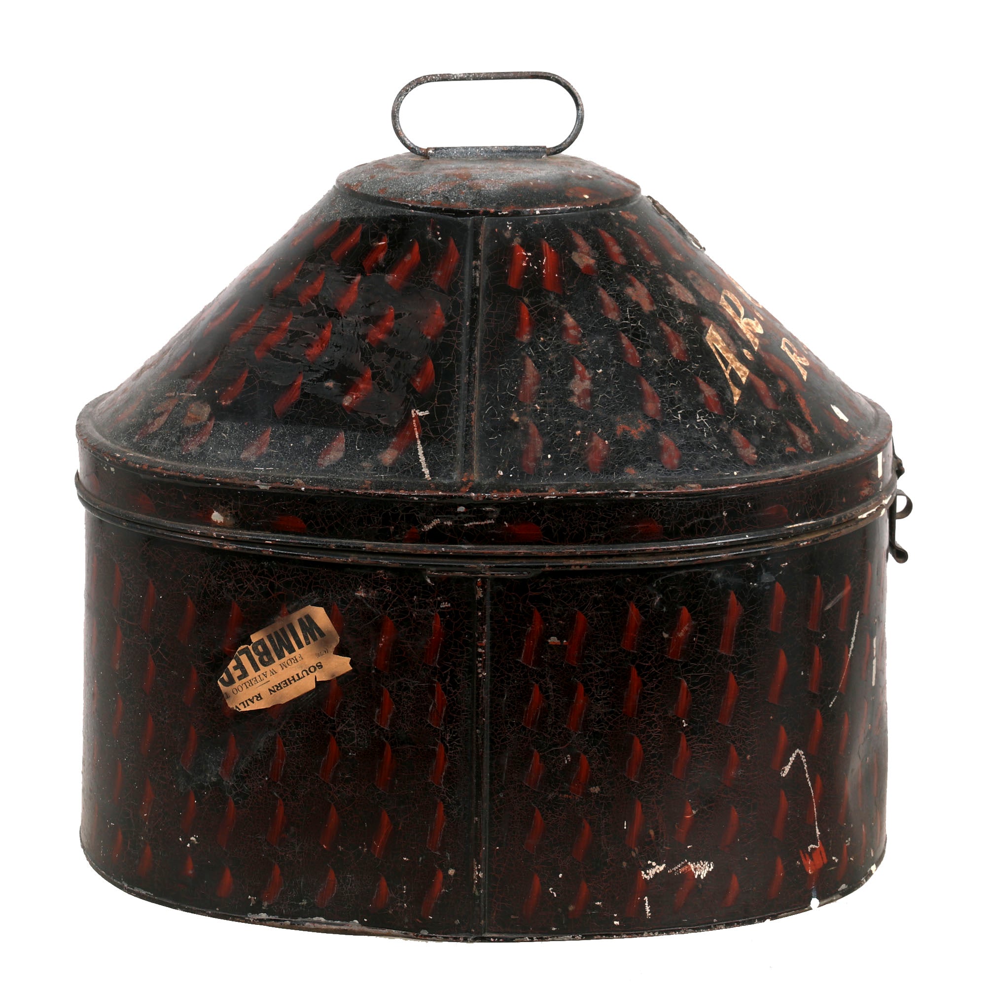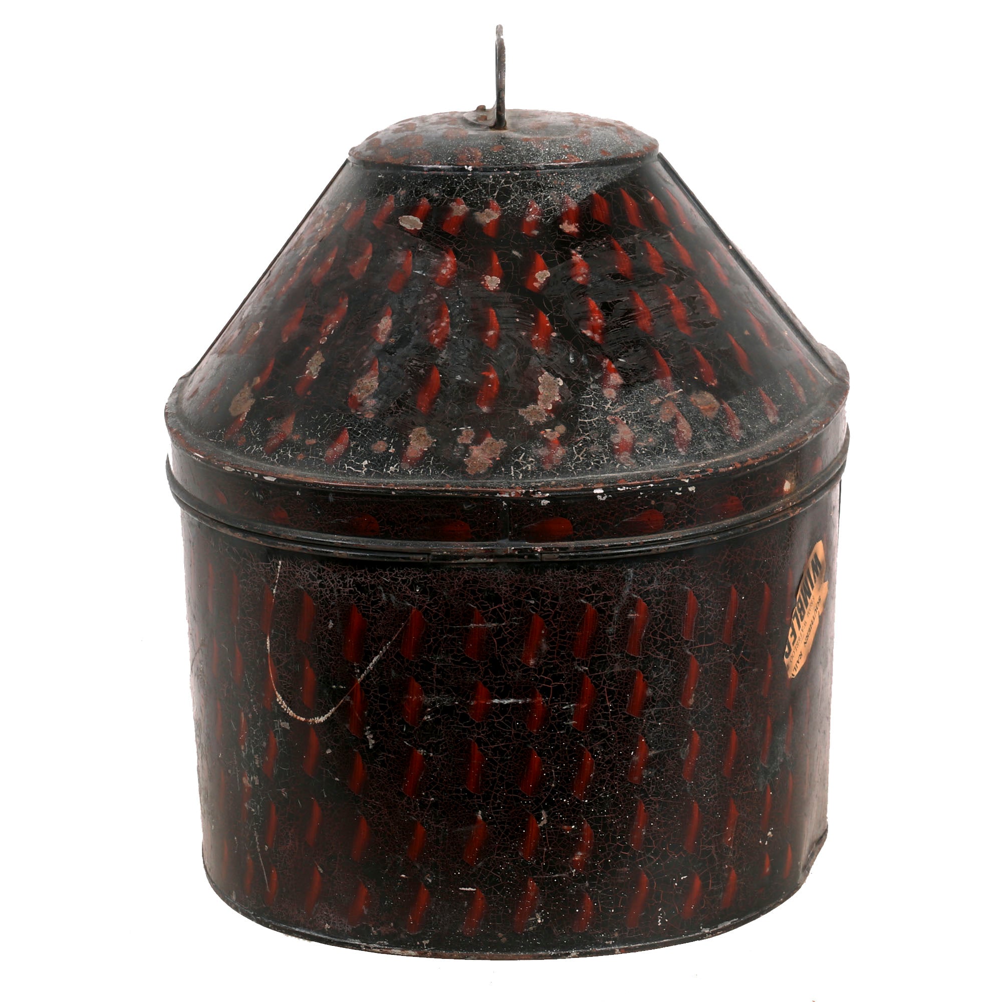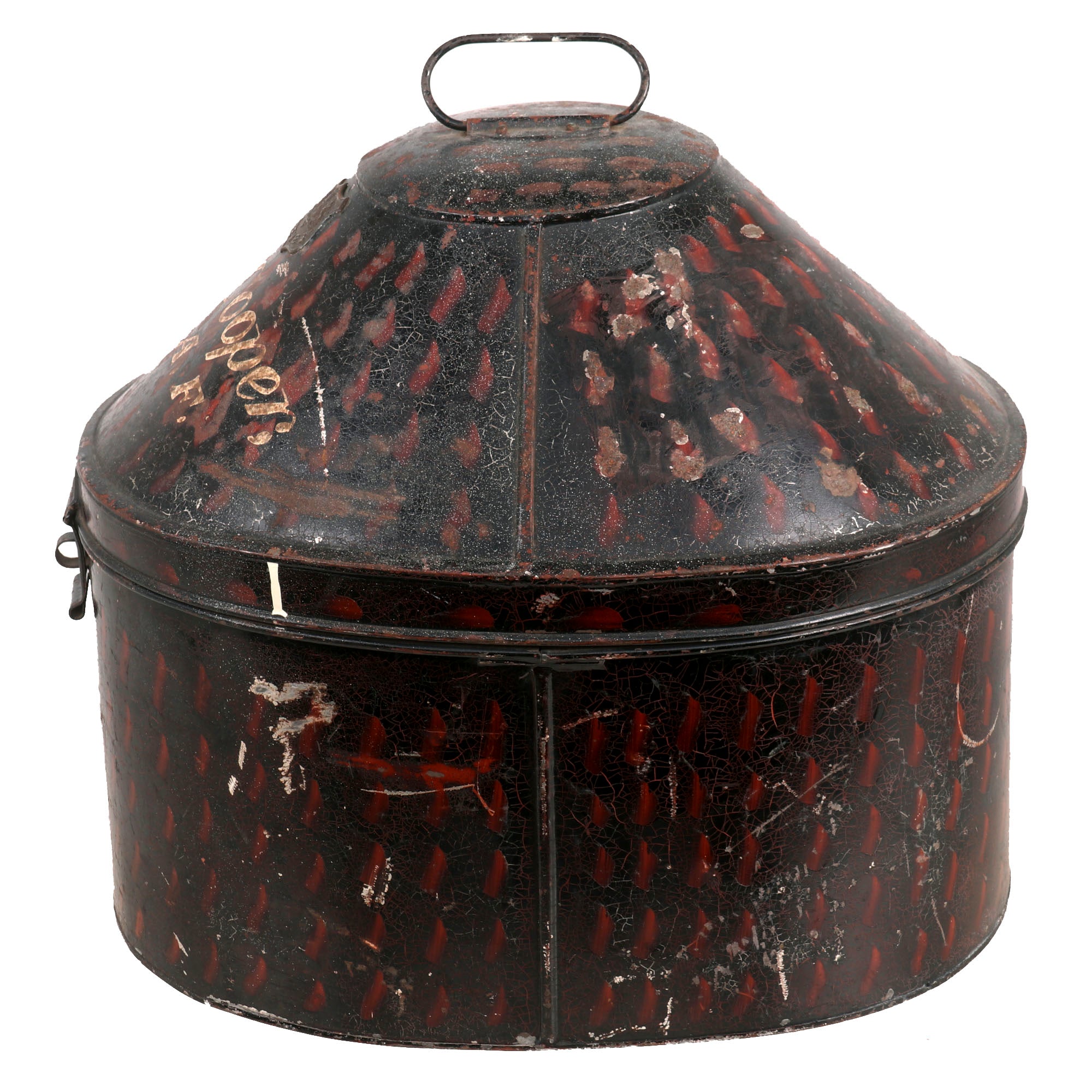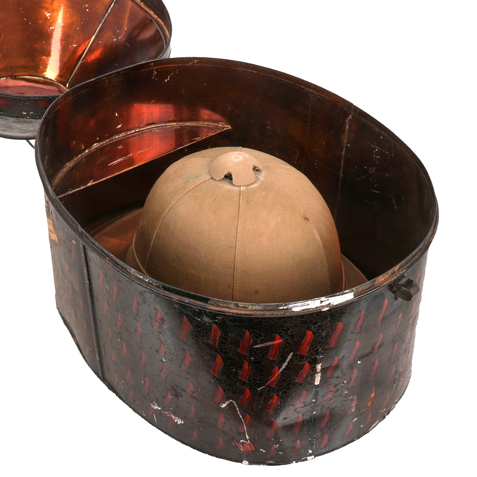 The tin is in very good condition, with the classic black enamel paint with red stippling on the outside, and the inside still has great brown orange lacquer preventing oxidation of the metal. It fits the helmet quite nicely, and measures approximately 16"L x 12"W x 14"H, with an intact closure latch.