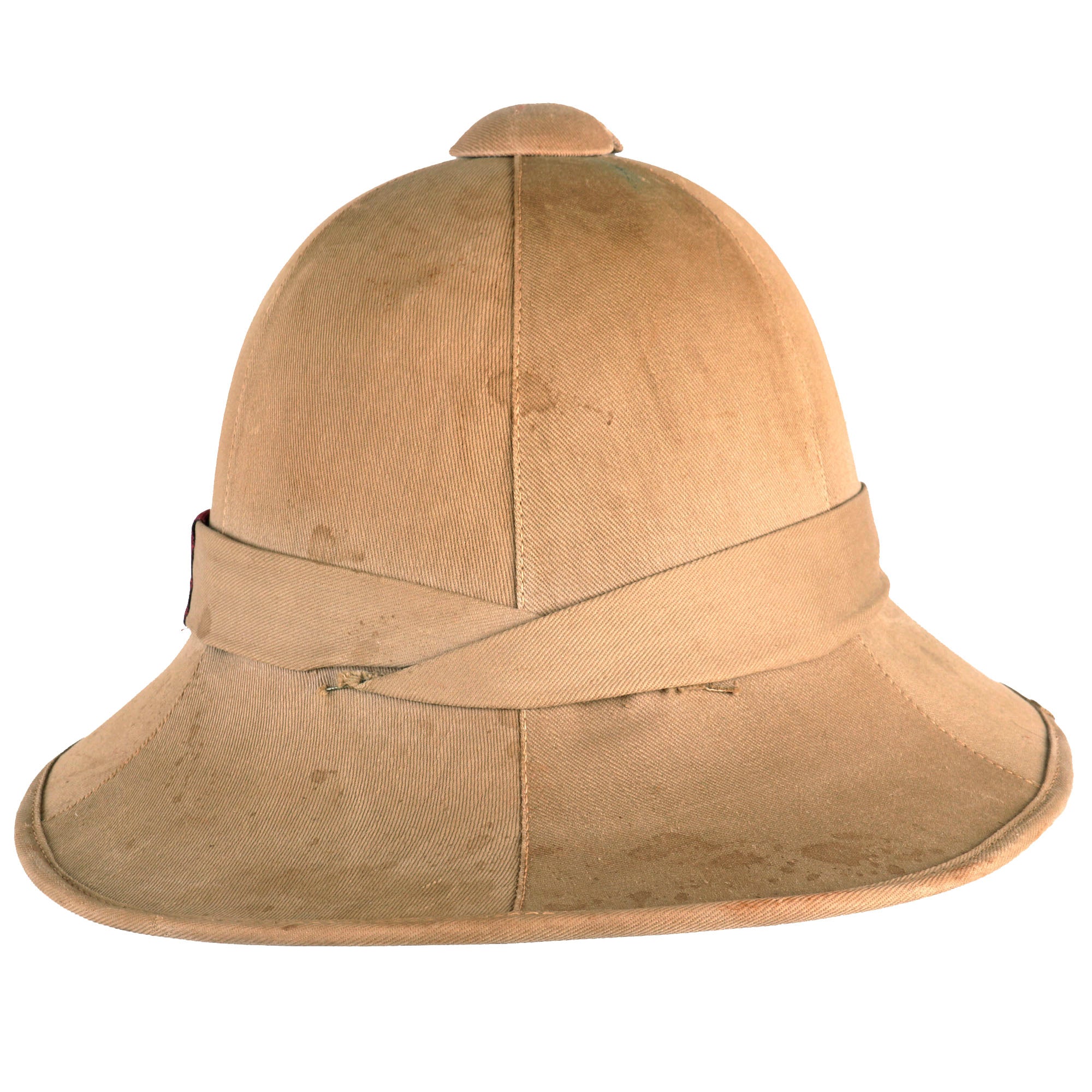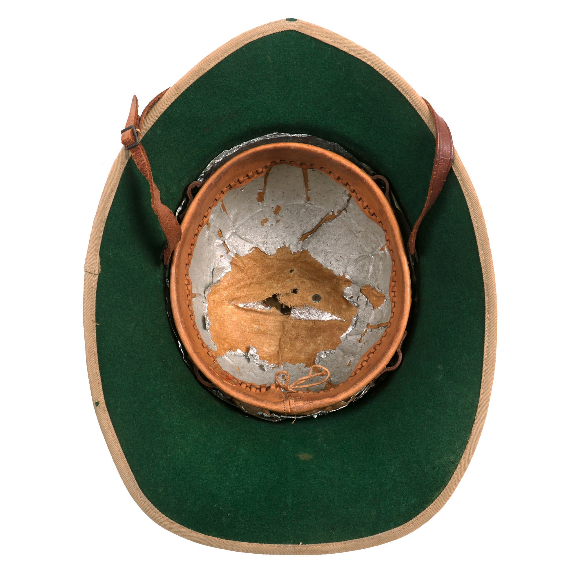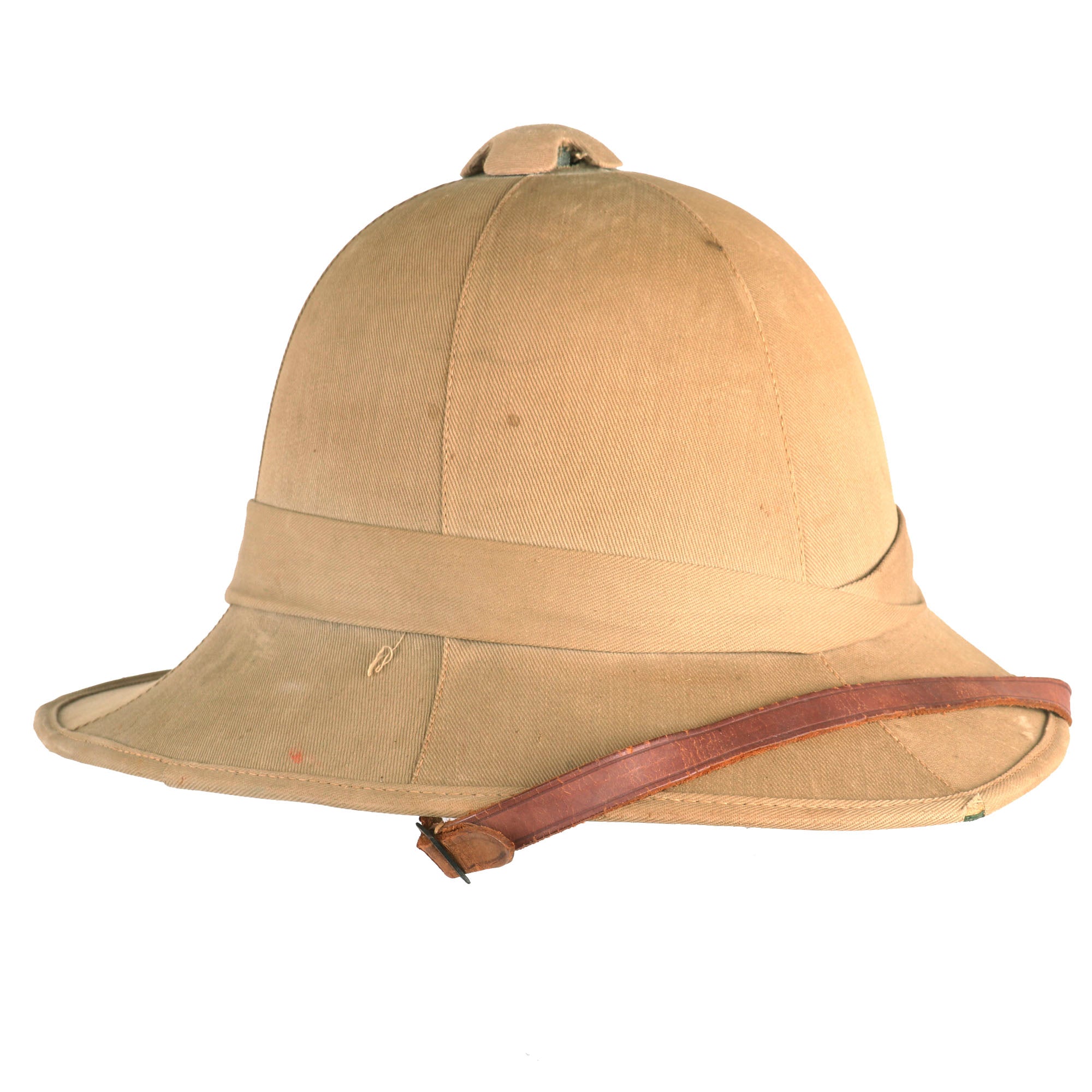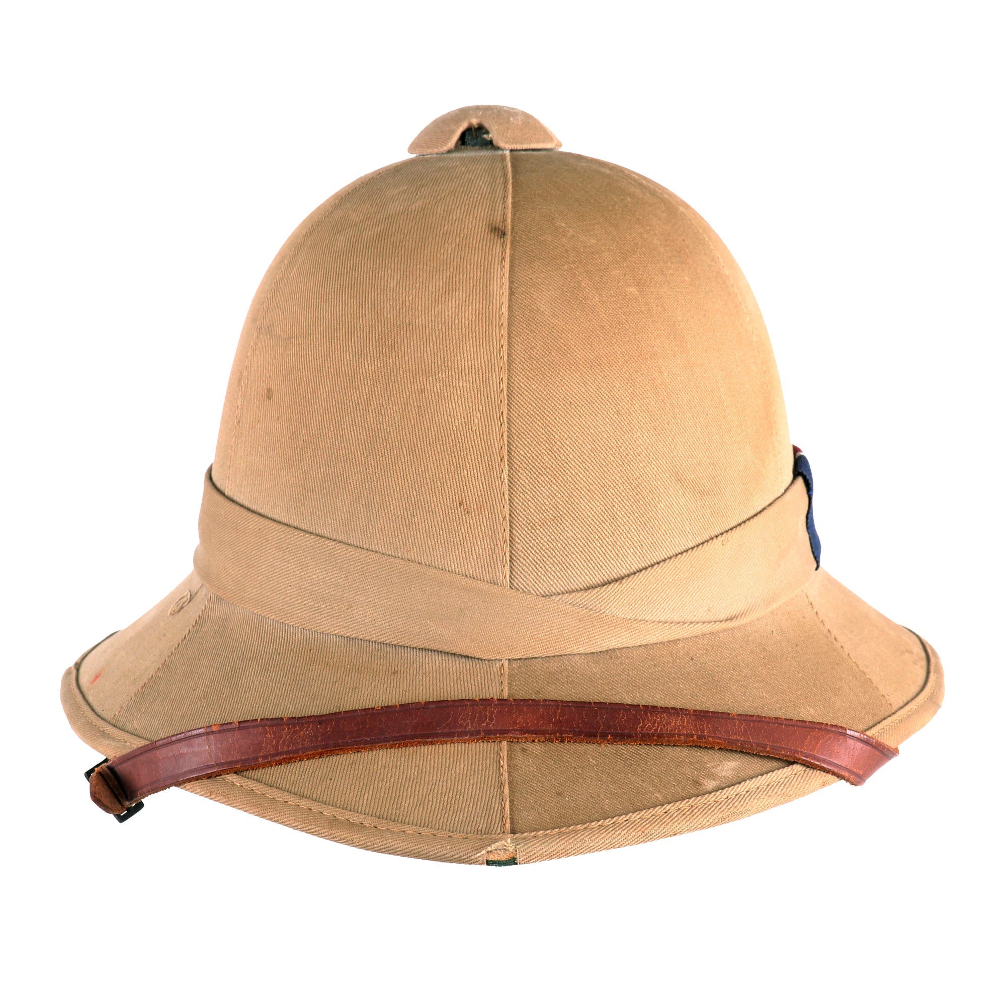 The Wolseley pattern khaki pith helmet has it all: complete with leather sweatband and chinstrap, it still retains a simple cloth pugaree wrap above the brim, which still bears its unit's color flash to the left side. The unit flash is made up of three vertical bands of Dark Blue/Grey/Maroon indicating use by the Royal Air Force. The inside of the helmet is in very good service used condition, and the leather sweatband bears a maker and size label near the back, which reads 6 ¾ / Helmets Ltd. / Wheathampstead / 1942. There is also a W (Arrow) D War Department markings stamped on the underside of the, as well as the name P/O J. L. HULL 146542. The aluminum foil and fabric lining on the inside of the helmet dome is in good condition, though worn.