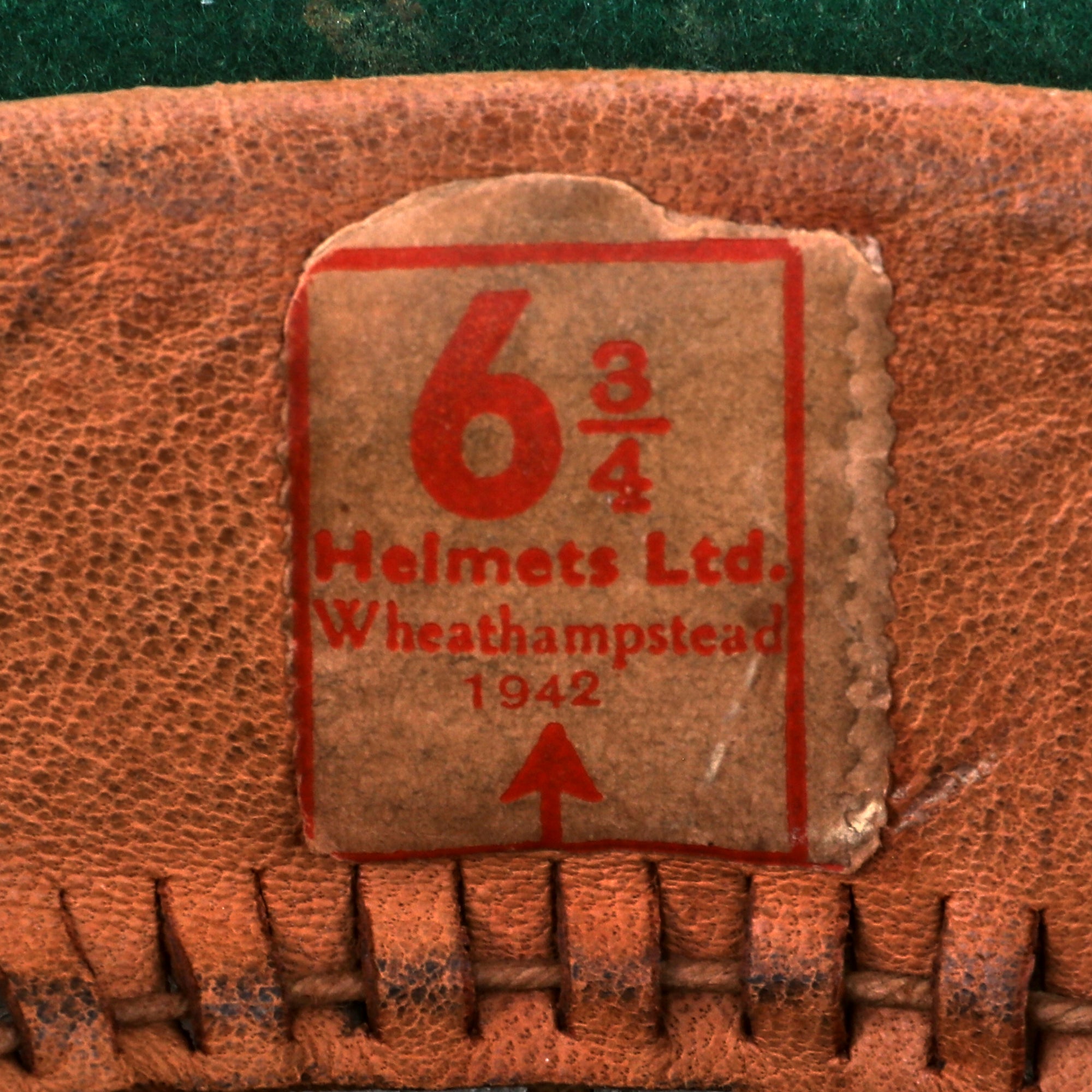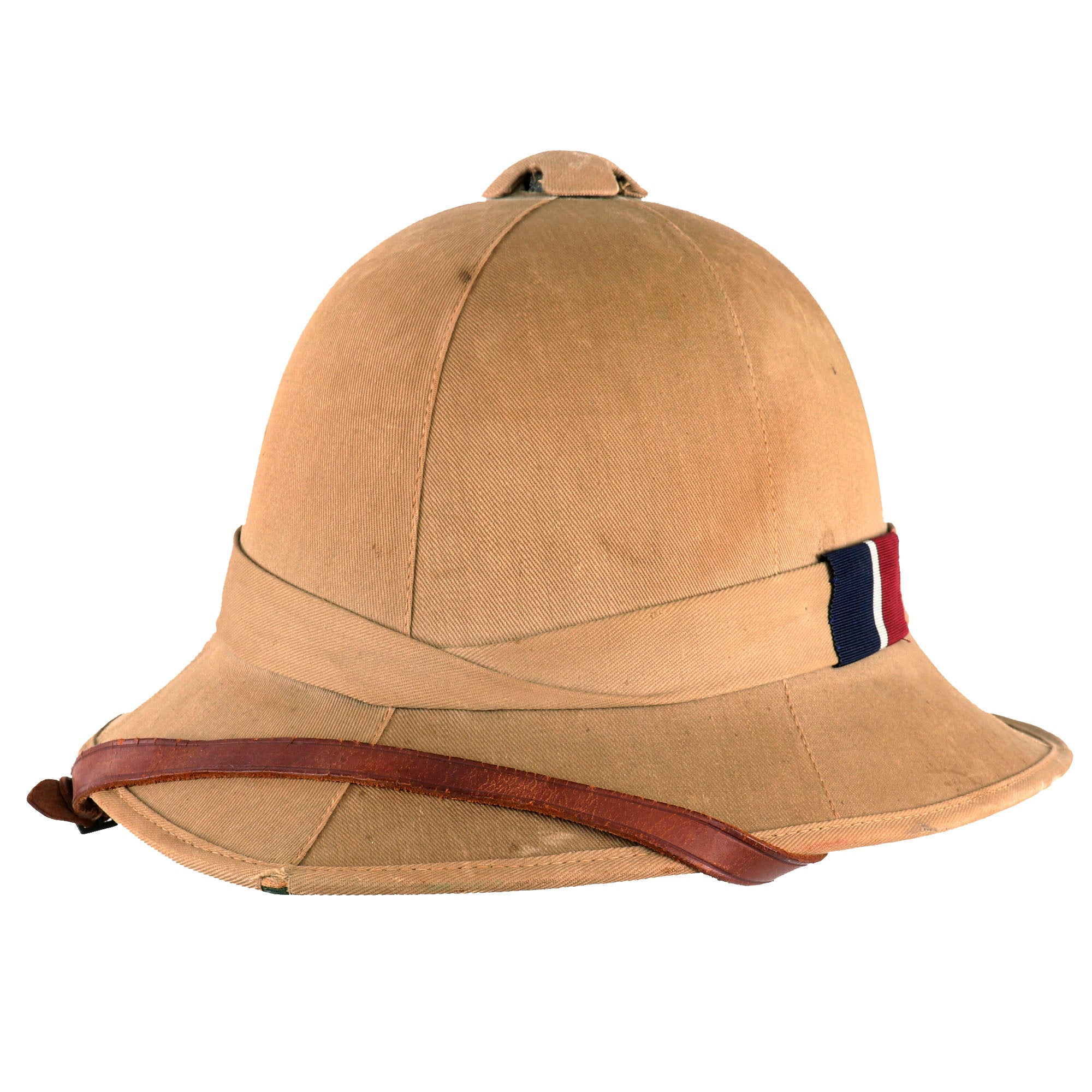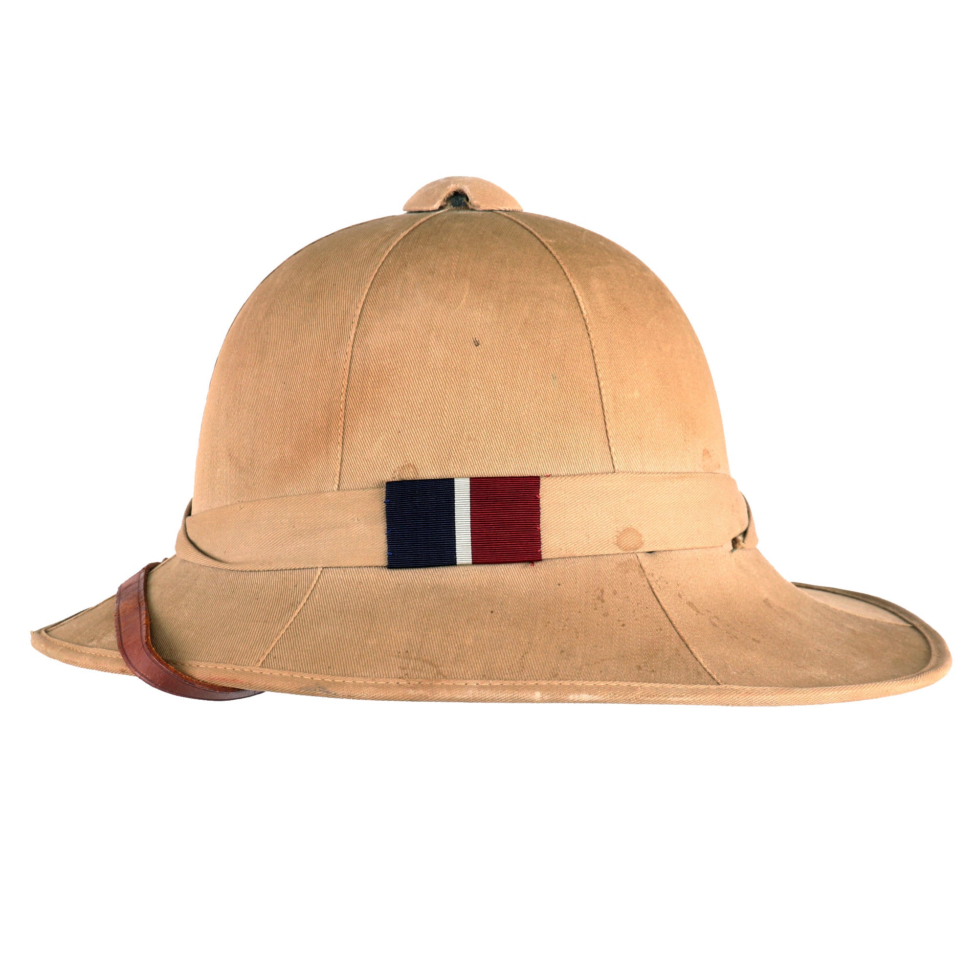 The Wolseley pattern khaki pith helmet has it all: complete with leather sweatband and chinstrap, it still retains a simple cloth pugaree wrap above the brim, which still bears its unit's color flash to the left side. The unit flash is made up of three vertical bands of Dark Blue/Grey/Maroon indicating use by the Royal Air Force. The inside of the helmet is in very good service used condition, and the leather sweatband bears a maker and size label near the back, which reads 6 ¾ / Helmets Ltd. / Wheathampstead / 1942. There is also a W (Arrow) D War Department markings stamped on the underside of the, as well as the name P/O J. L. HULL 146542. The aluminum foil and fabric lining on the inside of the helmet dome is in good condition, though worn.
