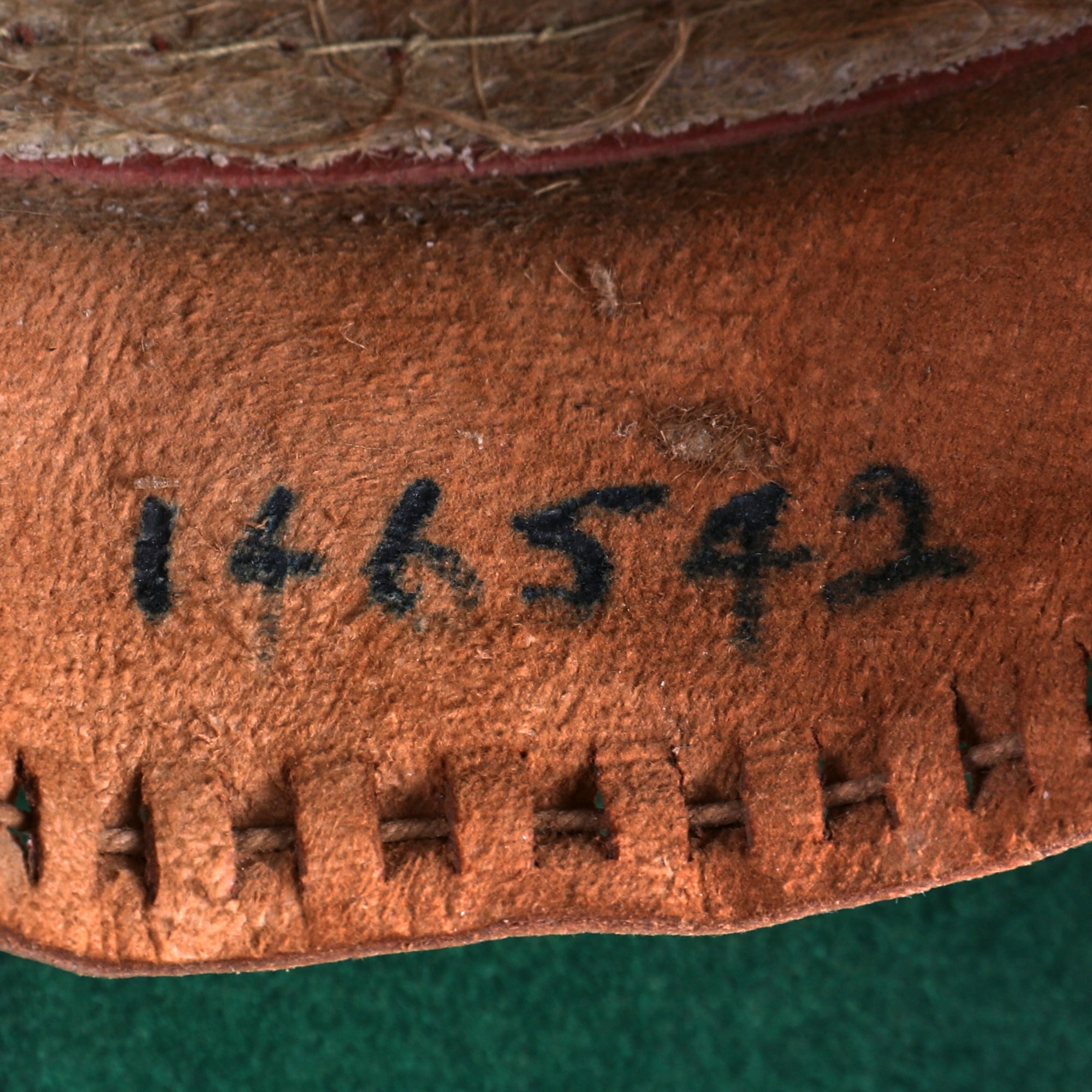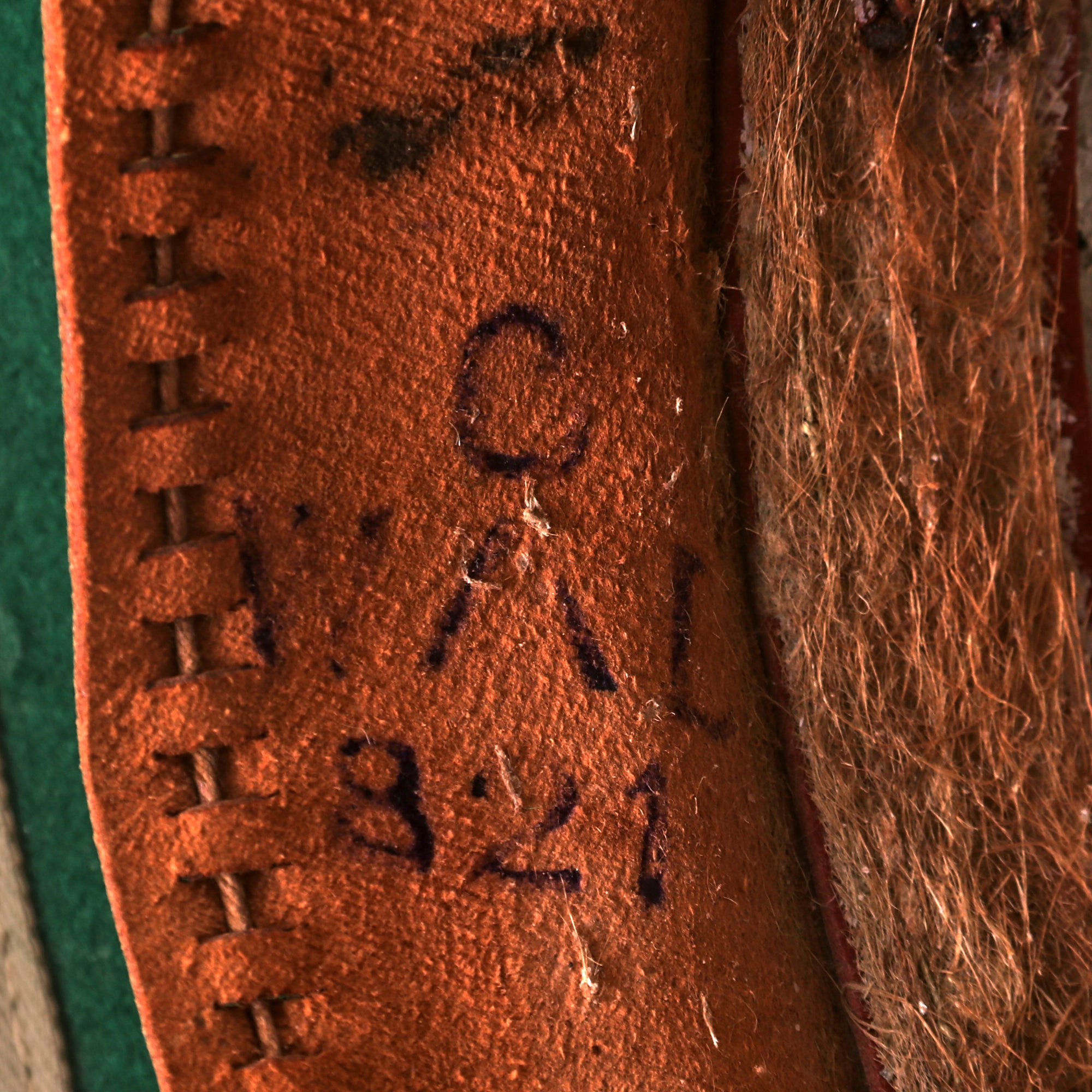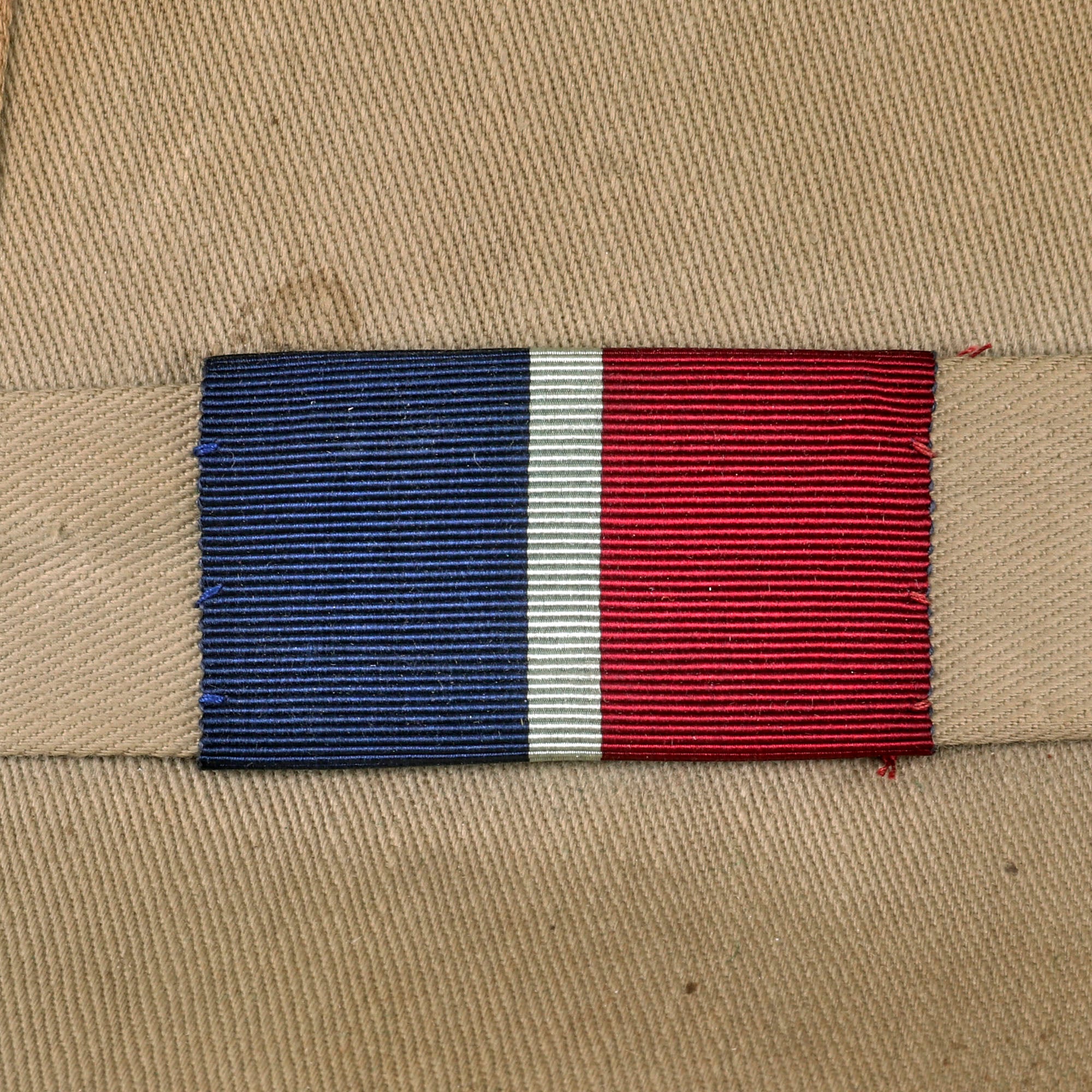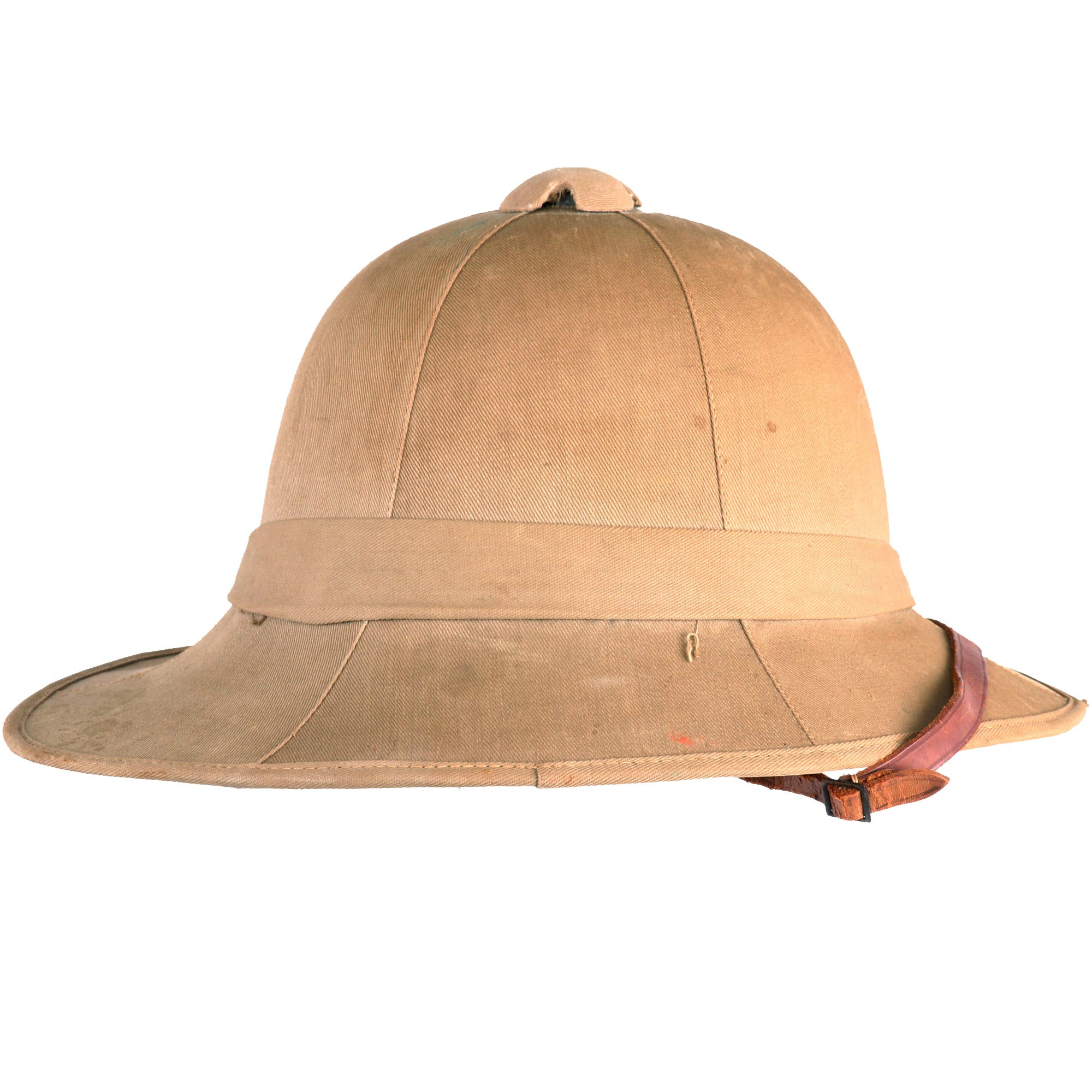 The Wolseley pattern khaki pith helmet has it all: complete with leather sweatband and chinstrap, it still retains a simple cloth pugaree wrap above the brim, which still bears its unit's color flash to the left side. The unit flash is made up of three vertical bands of Dark Blue/Grey/Maroon indicating use by the Royal Air Force. The inside of the helmet is in very good service used condition, and the leather sweatband bears a maker and size label near the back, which reads 6 ¾ / Helmets Ltd. / Wheathampstead / 1942. There is also a W (Arrow) D War Department markings stamped on the underside of the, as well as the name P/O J. L. HULL 146542. The aluminum foil and fabric lining on the inside of the helmet dome is in good condition, though worn.