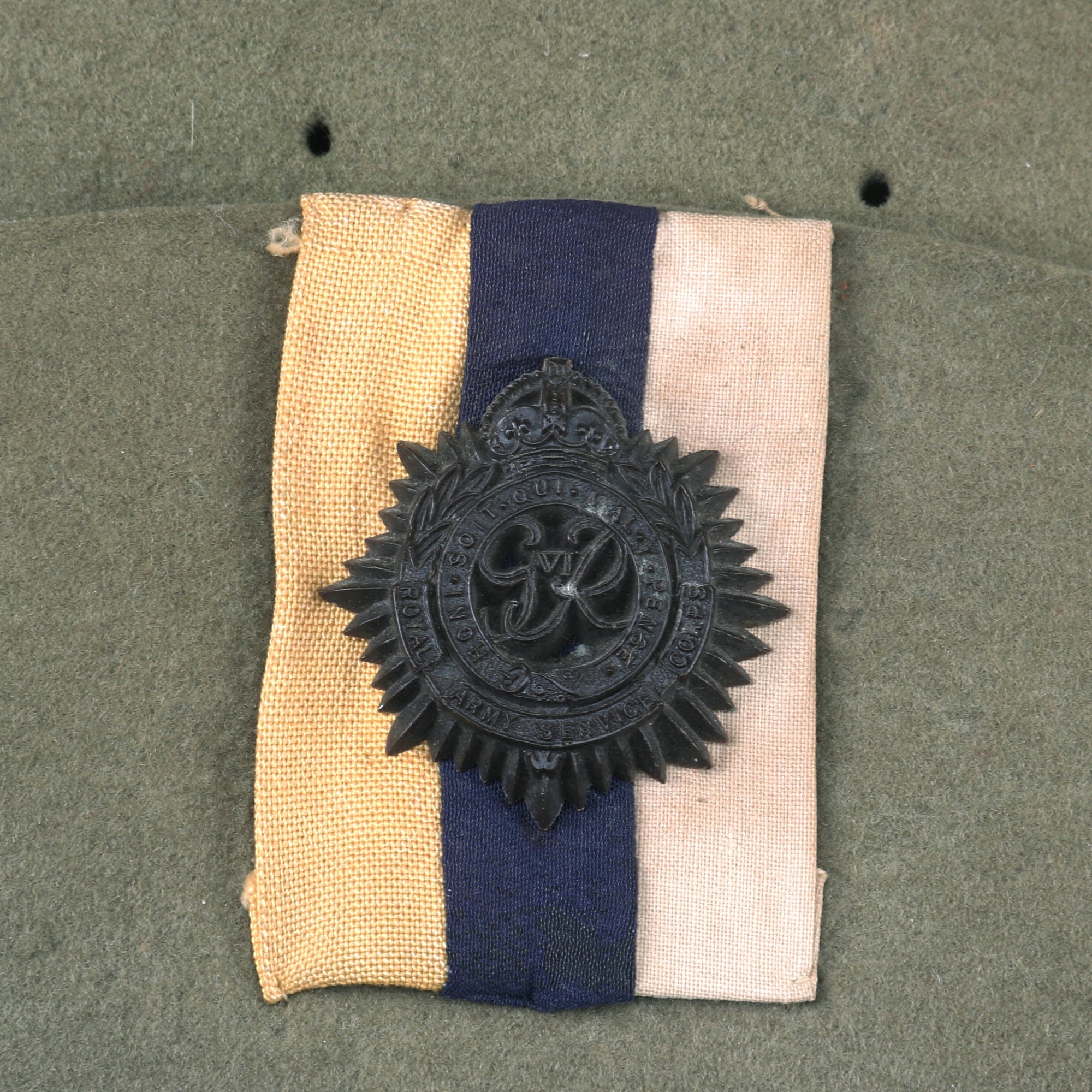 This is a gorgeous 1942-dated example of a British slouch hat with a badge & ribbon for the Royal Army Service Corps. The left side of the hat has a lovely metal Royal Army Service Corps badge, with the corresponding “Flash” ribbon behind it.