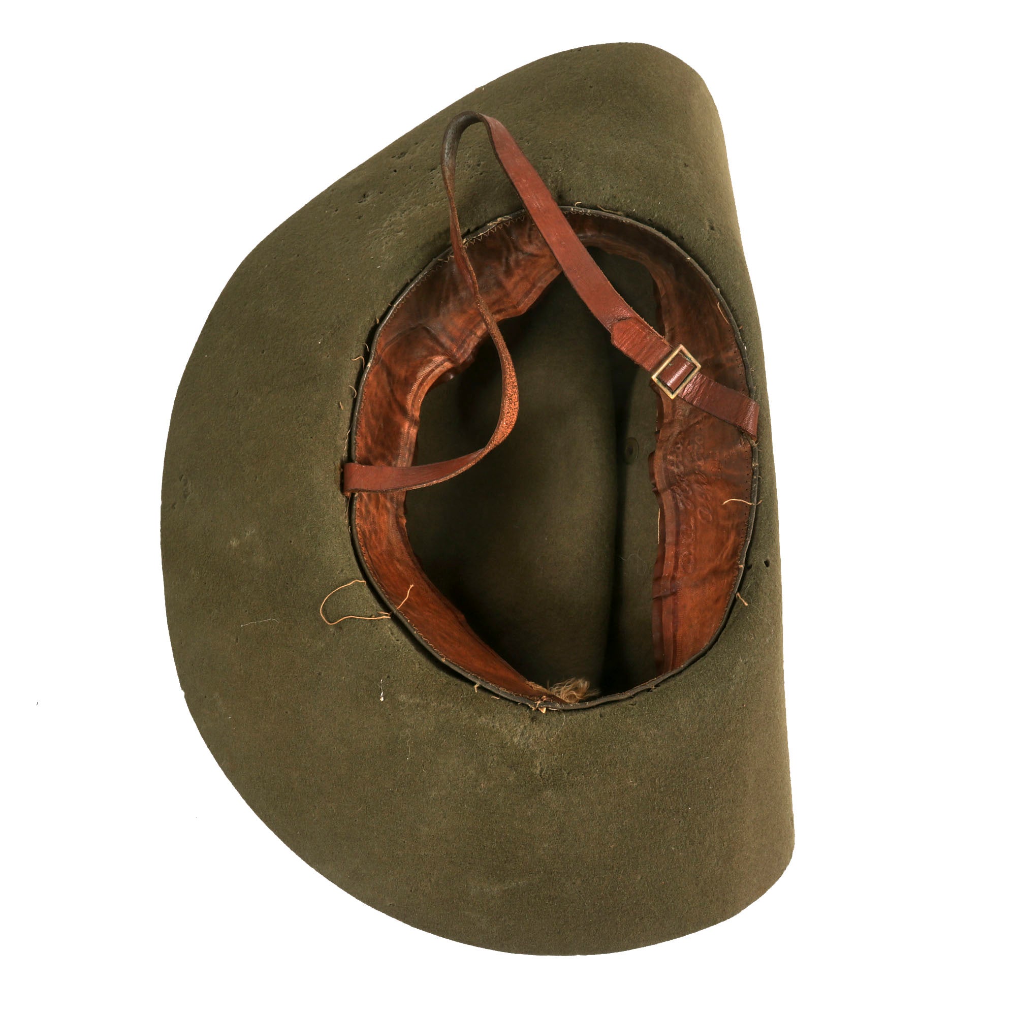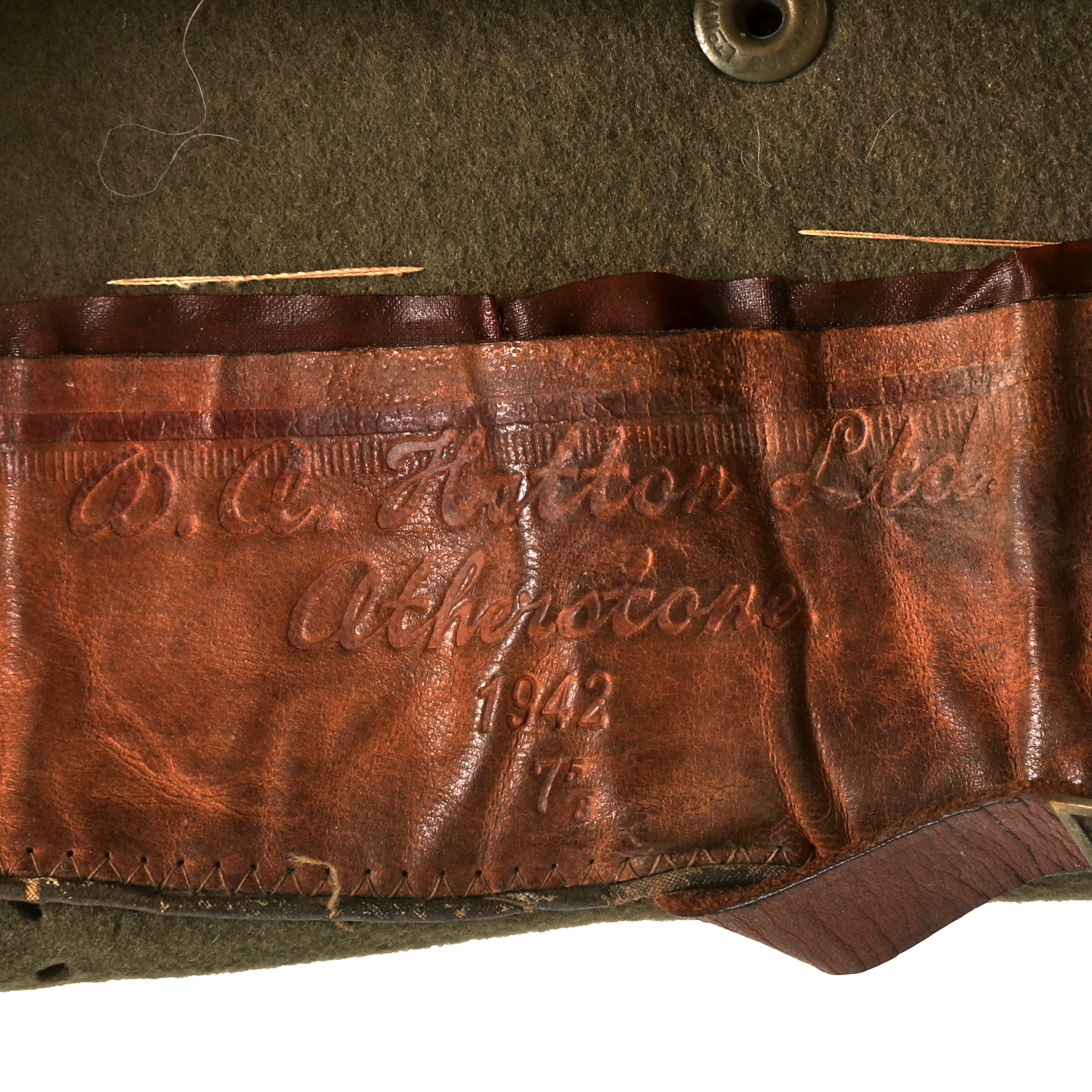 The Slouch Hat itself is in very nice condition, and still has the original khaki cloth headband around the circumference of the hat, which is topped with the same colors of the flash. It has original ventilation holes on both sides at the edge of the crown. The hat has its original leather sweatband which is clearly stamped: