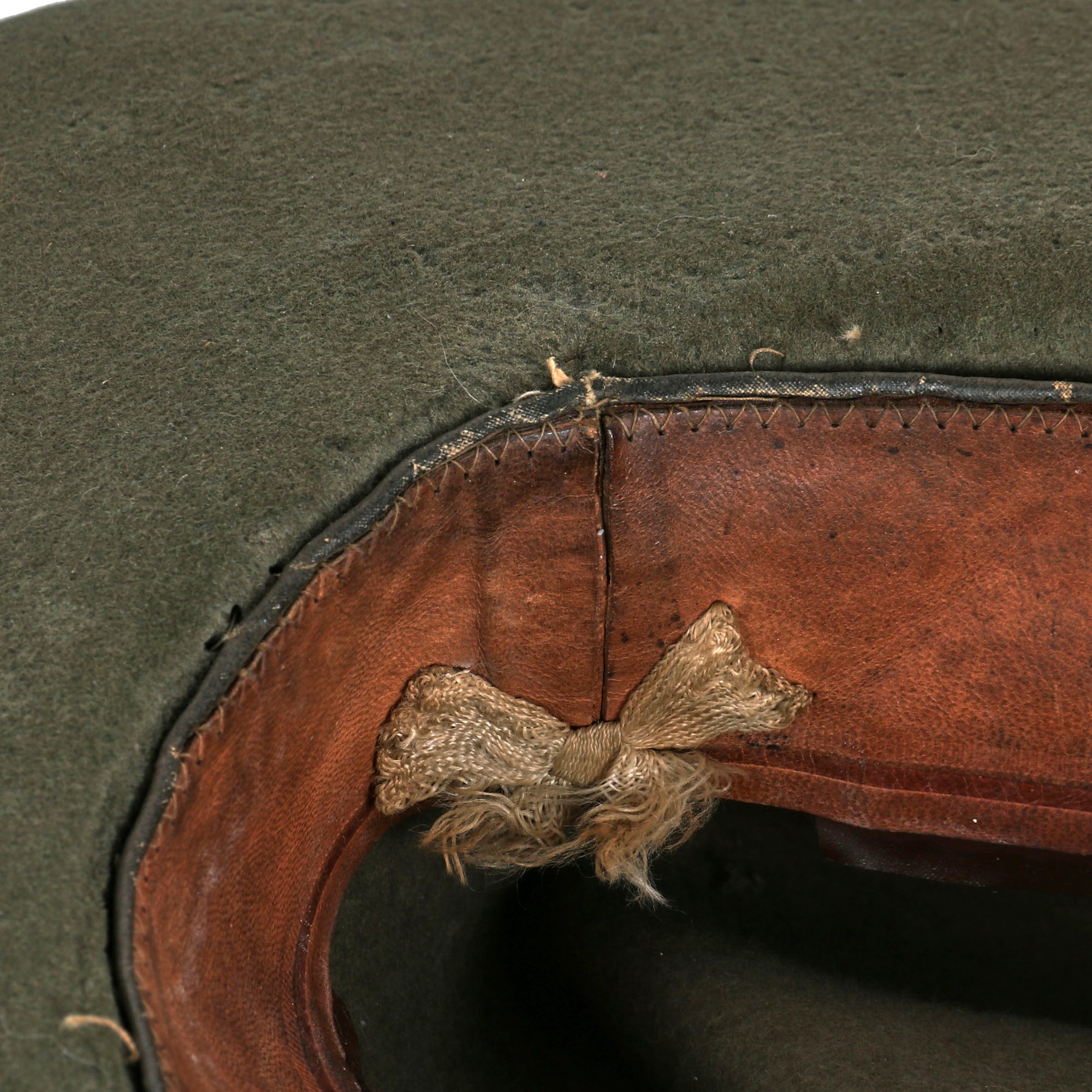The sweatband is losing some of its stitching so it is rather fragile. The chinstrap is also well-retained, something we almost never see. The cap definitely does show use, but is still in solid condition. There is a good bit of mothing on the top just under the trim band and the crown, and the leather liner definitely shows staining and use.