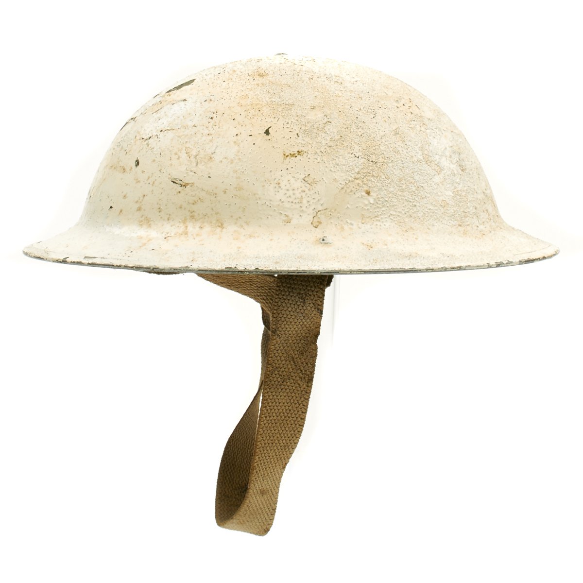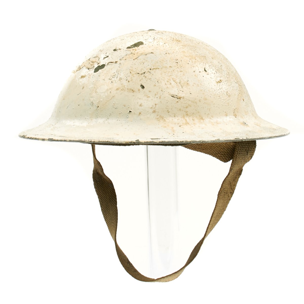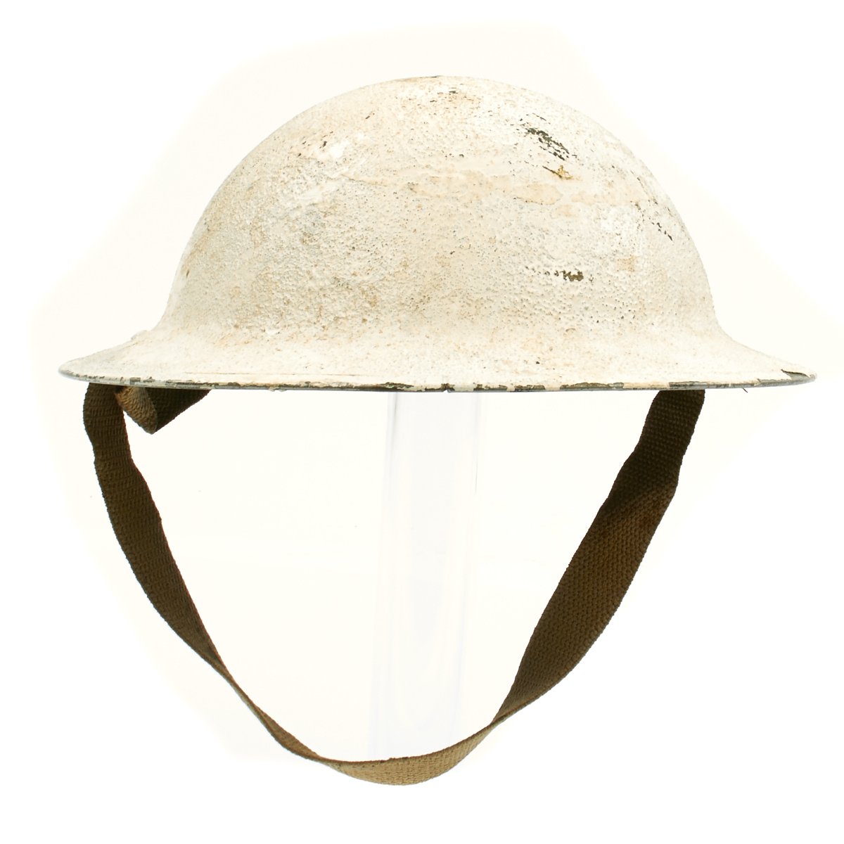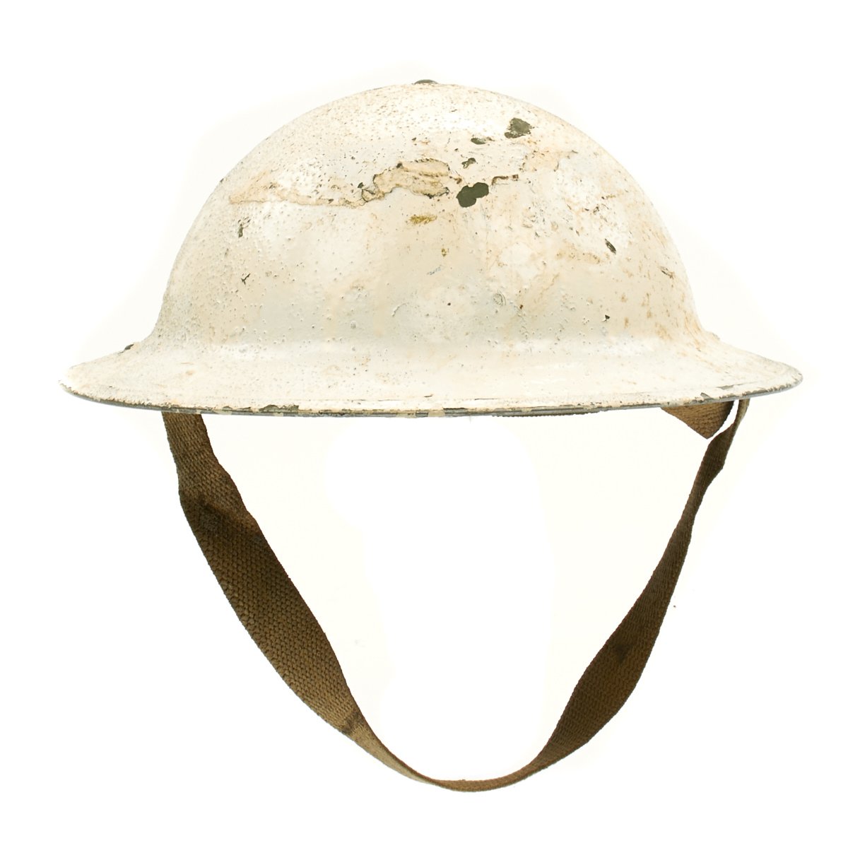 Original Item: Only One Available. This is a rare example of a genuine British - Brodie Mark II steel helmet that is dated 1944 on the liner. The white paint on the shell appears to be in very good condition and it looks to have been field painted. Shell is overall in great shape with no major issues. The original liner is in good condition and is marked on one of the main supports: