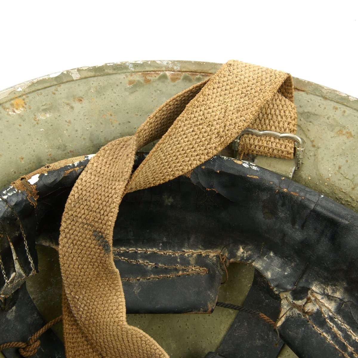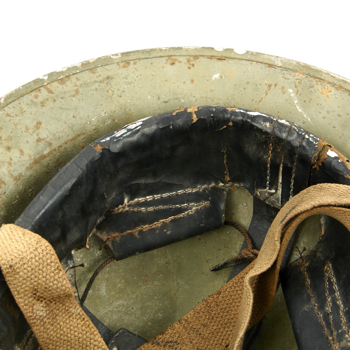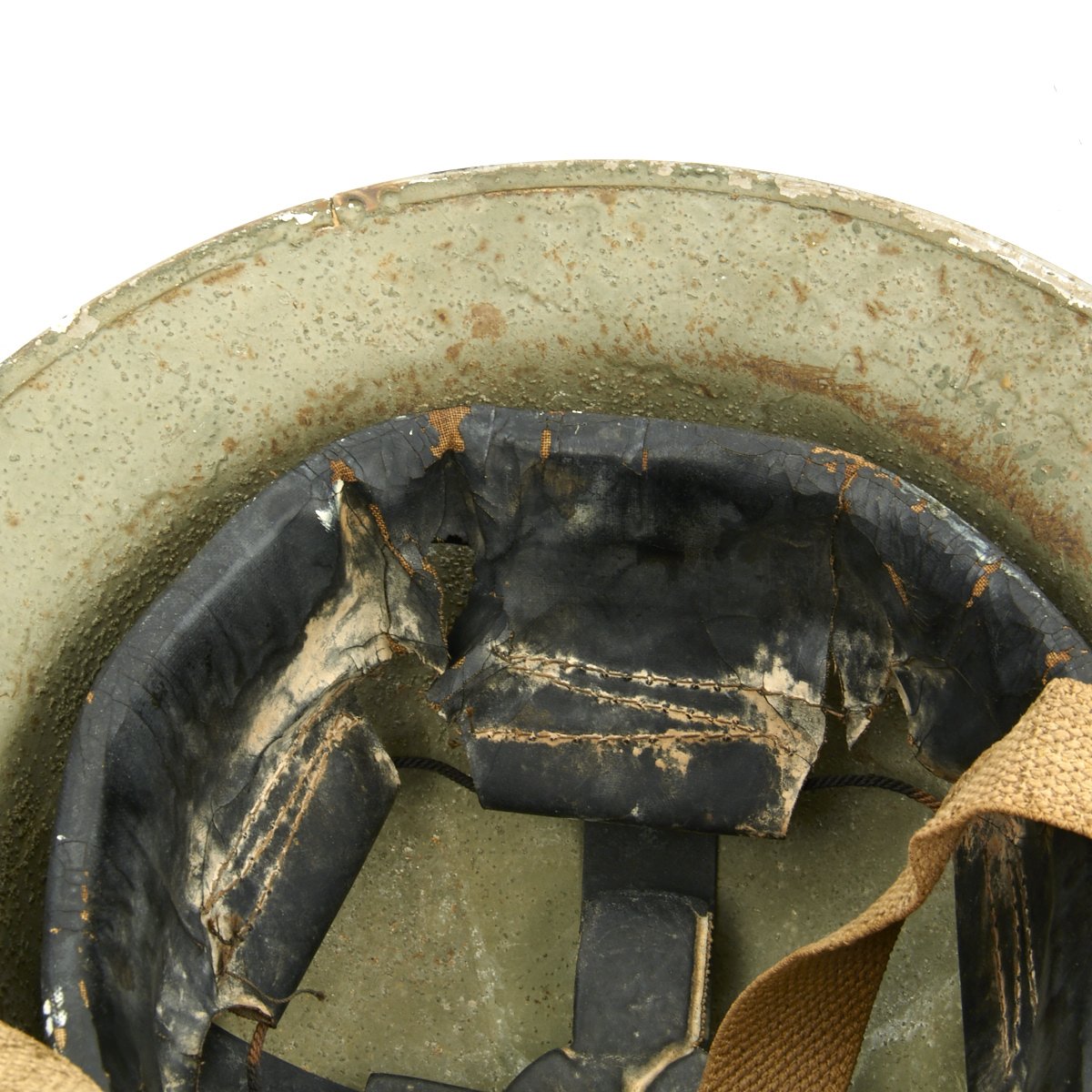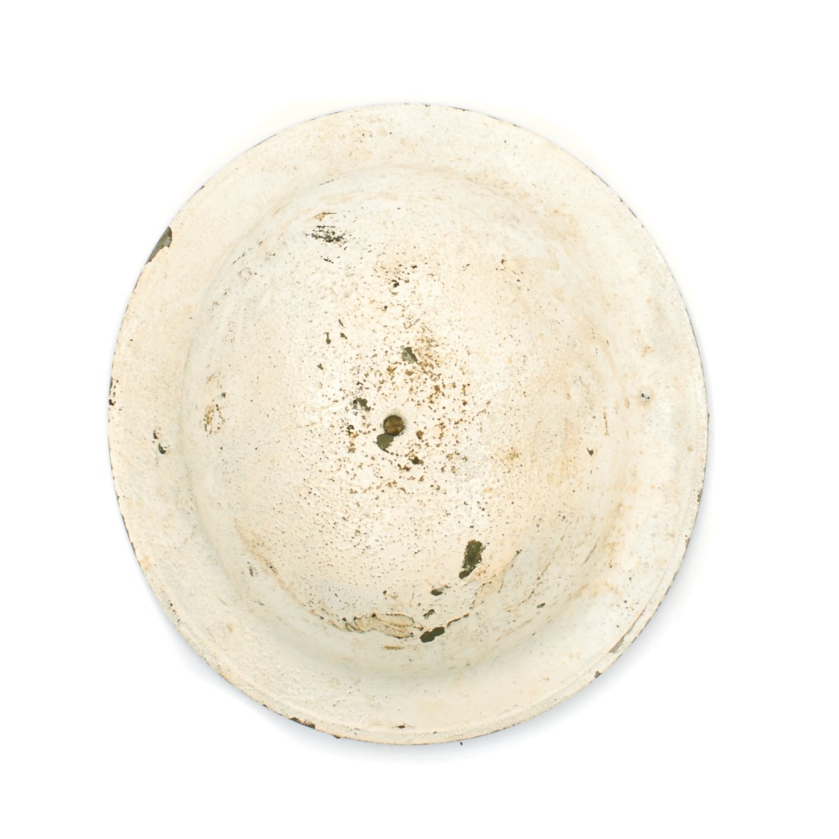 Original Item: Only One Available. This is a rare example of a genuine British - Brodie Mark II steel helmet that is dated 1944 on the liner. The white paint on the shell appears to be in very good condition and it looks to have been field painted. Shell is overall in great shape with no major issues. The original liner is in good condition and is marked on one of the main supports: