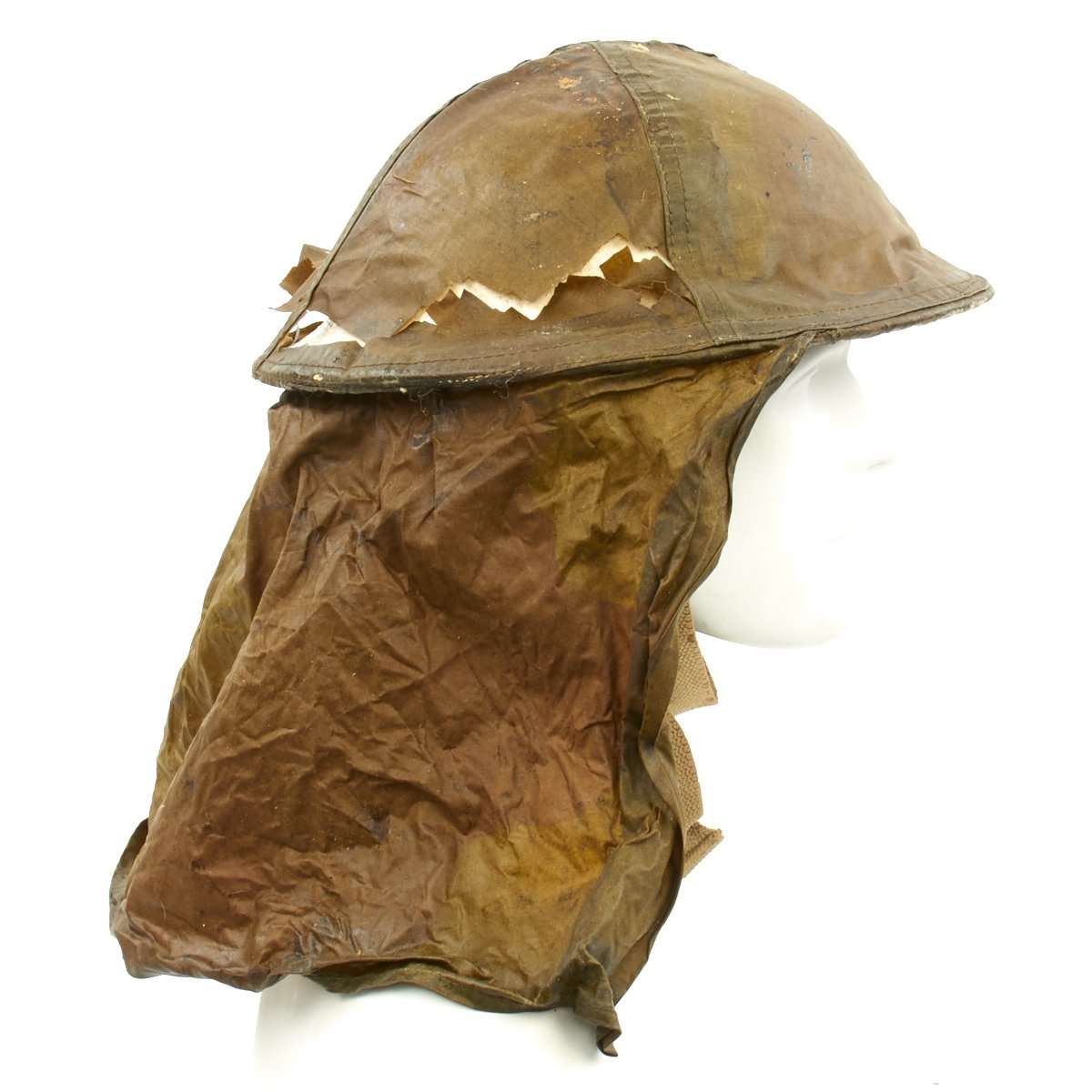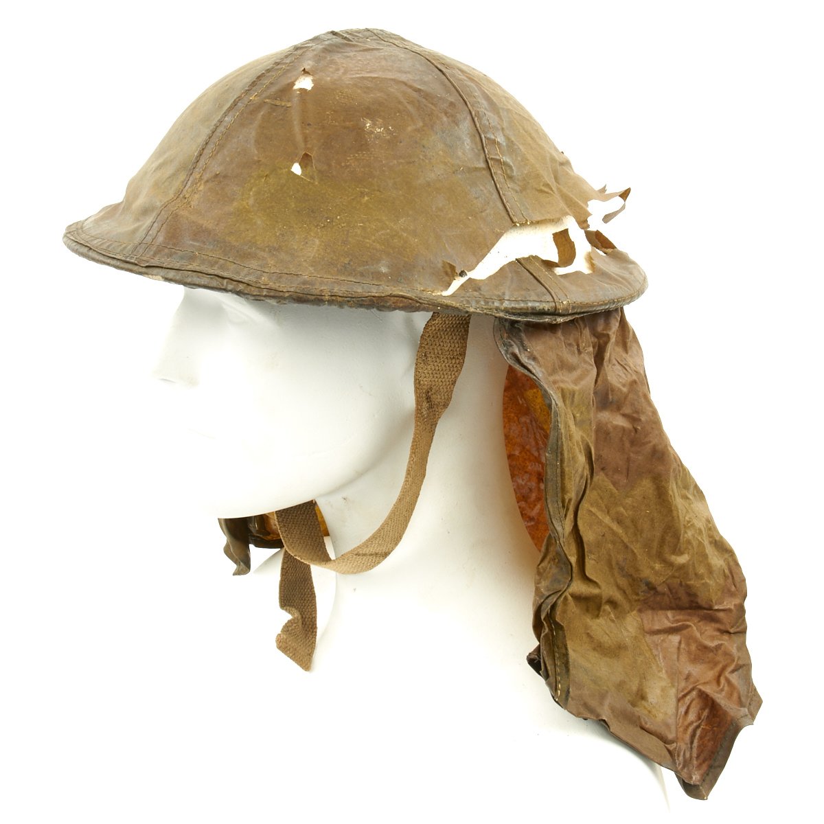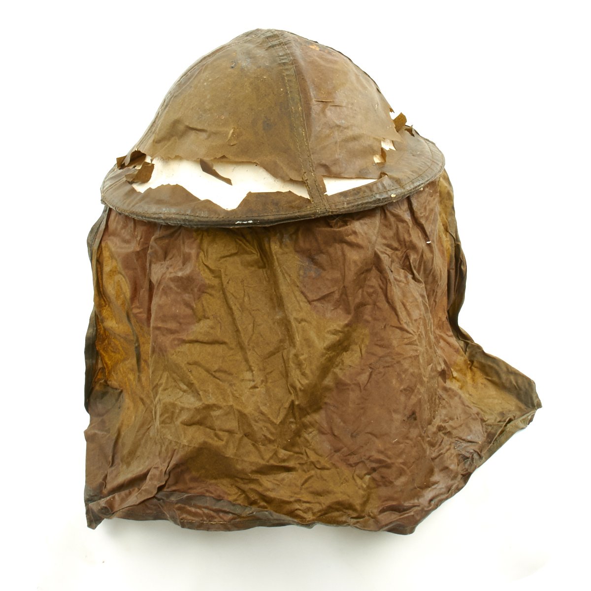 In addition to the winter camouflage paint the helmet comes with a waxed gas cape which is dated 1942 and is complete with maker logo. The gas cape is usable but does have damage. Winter painted helmets from WW2 are some of the hardest to find on the market today and this is one of the few British versions we have ever encountered!