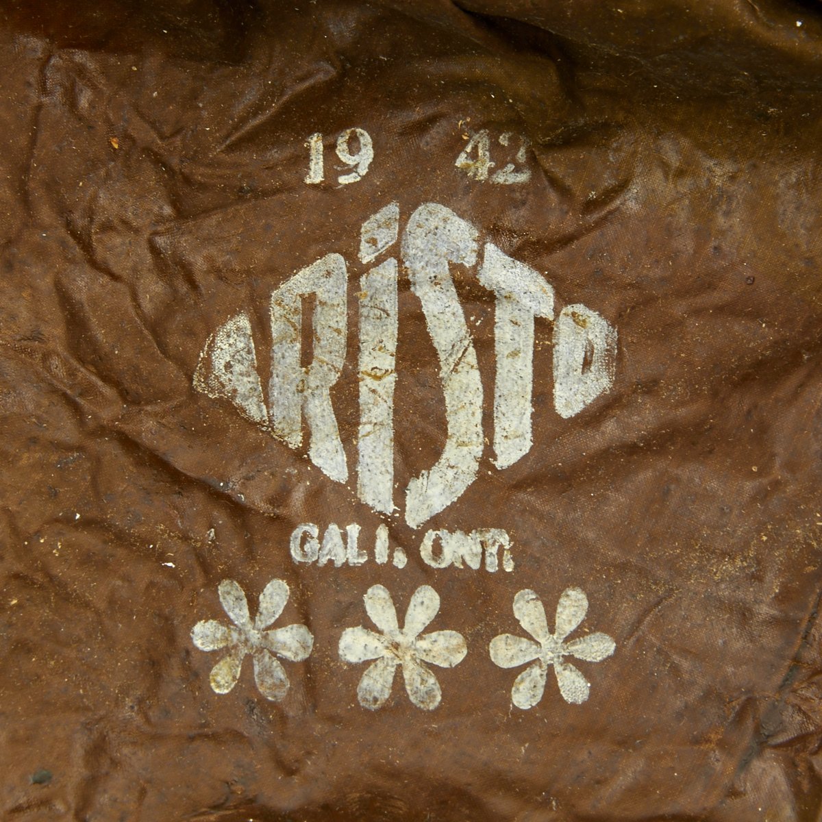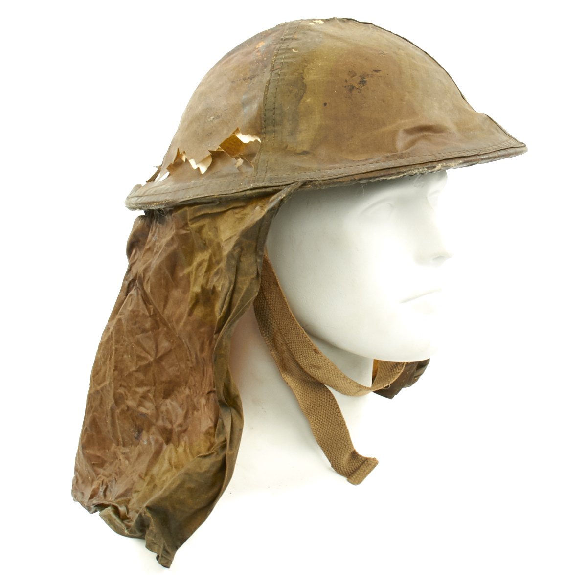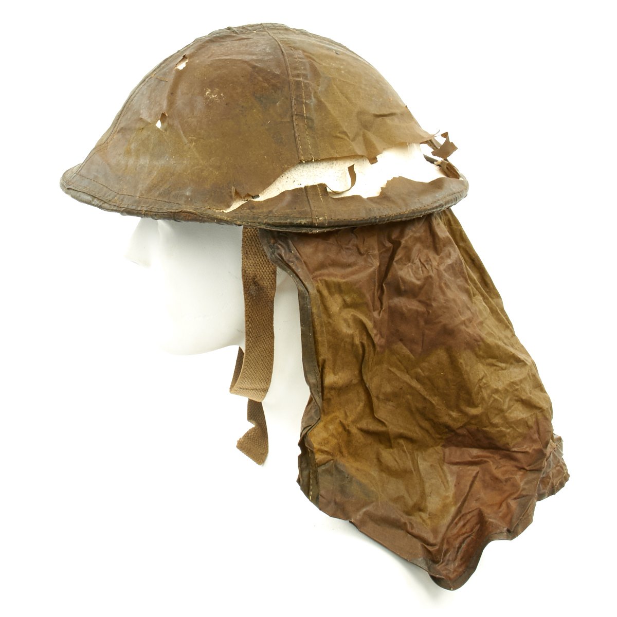In addition to the winter camouflage paint the helmet comes with a waxed gas cape which is dated 1942 and is complete with maker logo. The gas cape is usable but does have damage. Winter painted helmets from WW2 are some of the hardest to find on the market today and this is one of the few British versions we have ever encountered!
