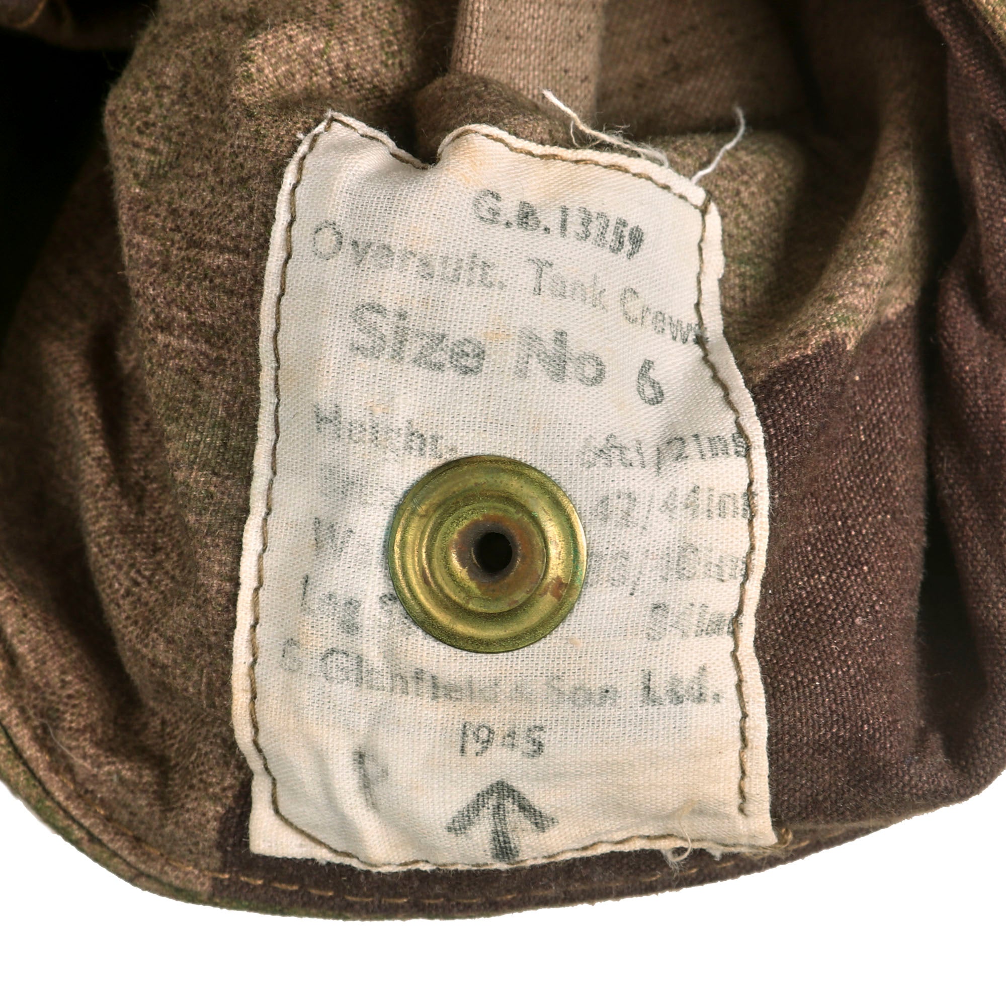 Original Item: Only One Available. This is an genuine 1945 Dated WWII British Tankers set of camouflage coveralls. This suit is in unbelievable condition and is 100% complete and without damage. It would appear that the suit was never even issued out. The left inside cuff has a data label with maker name (G. Glansfield & Sons), broad arrow and 1945 date. Size 6.