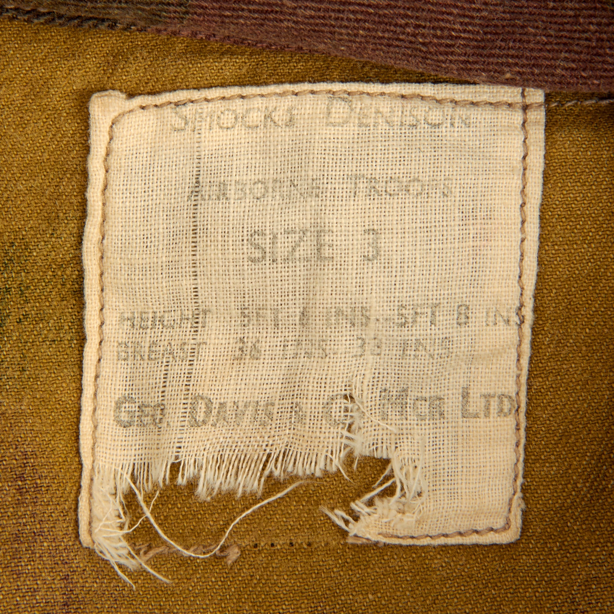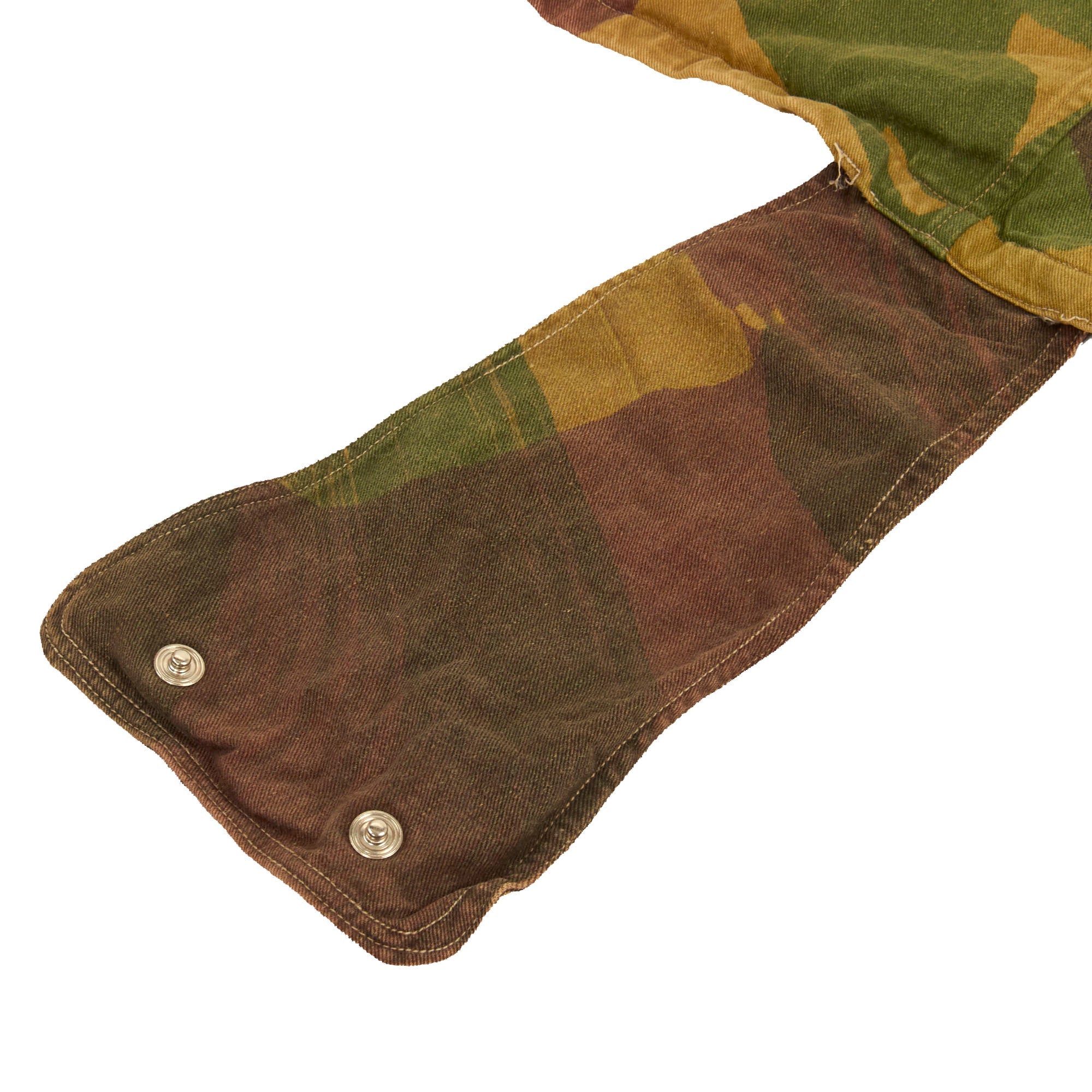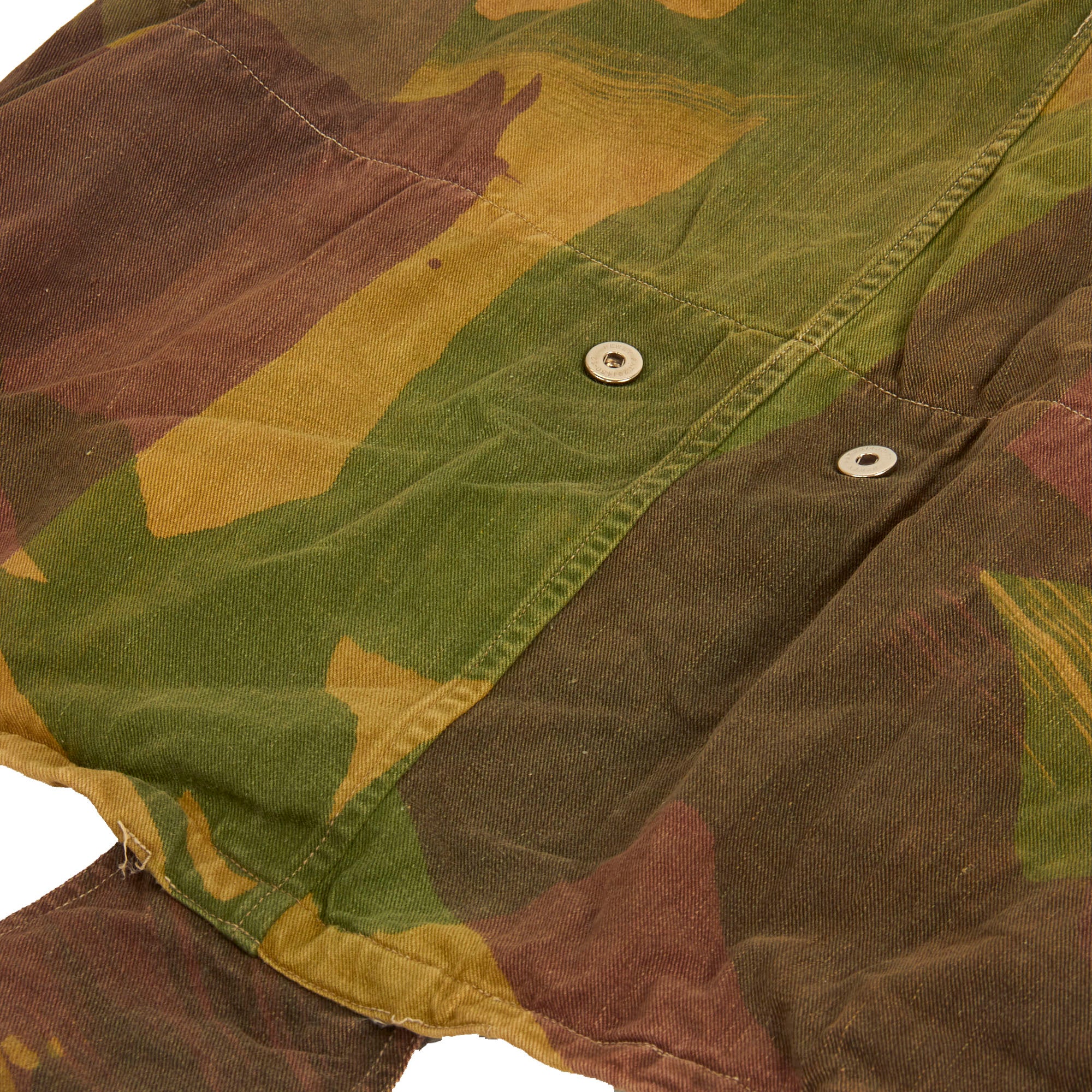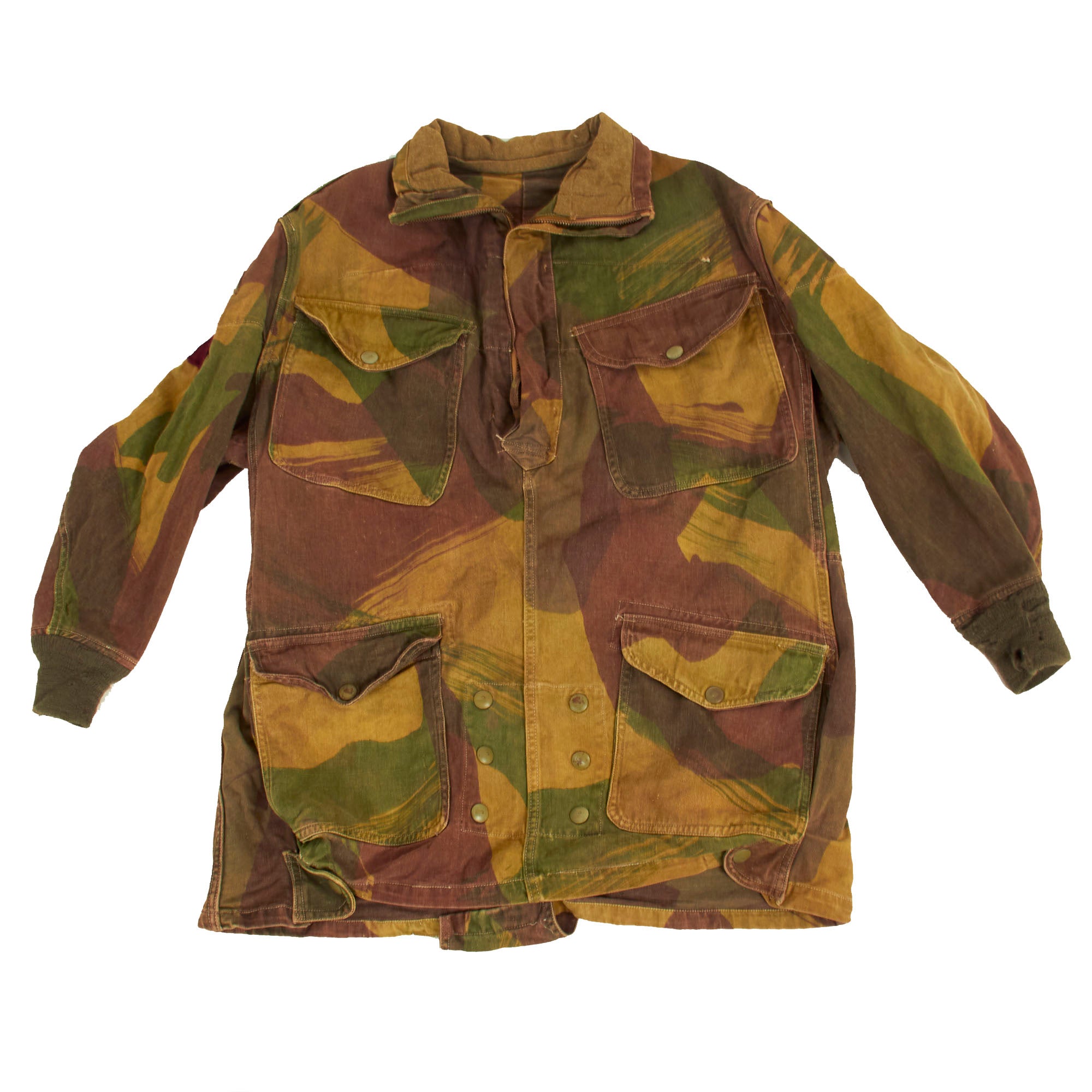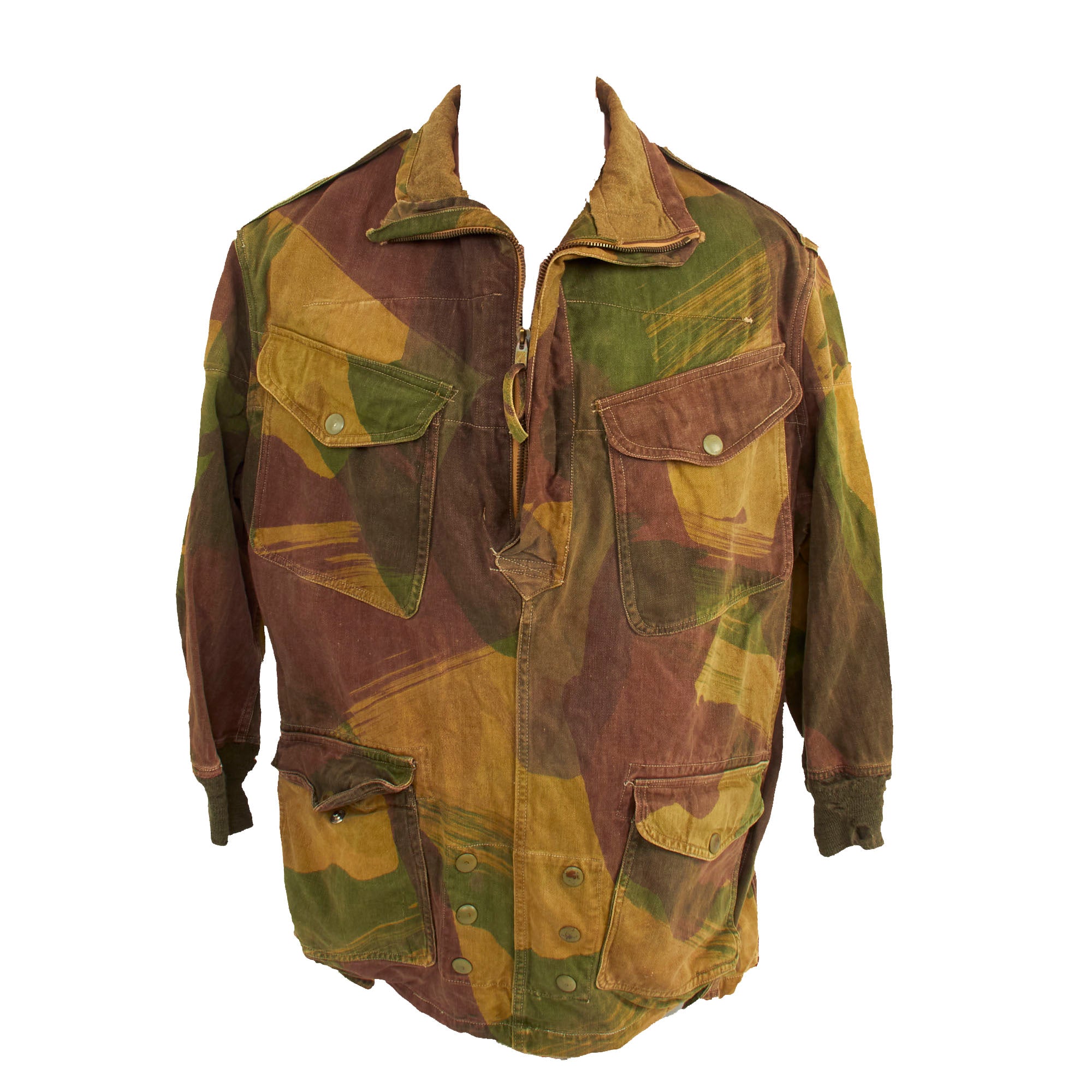 The 1st pattern smock was made from loose-fitting, yellowish-sand colored, heavyweight twill material, allegedly hand-painted with broad, mop like brushes using non-colorfast dyes in broad pea green and dark brown stripes, or "brush-strokes". With use the base color faded to a sandy buff, and the overlaid shades gained a blended appearance. The colors of the 1st pattern smock were thought to best suit the wearer to the North African and Italian theatres. It had a half length zip fastener made of steel, knitted woollen cuffs, four external pockets that secured with brass snaps (two on the chest and two below the waist), two internal pockets on the chest, and epaulettes that secured with plastic battle dress buttons. The inside of the collar was lined with soft khaki flannel (or in senior officer's smocks, Angora wool). A “beaver tail” fastened beneath the crotch from the back to the front of the smock - which kept it from riding up during a parachute descent. When not used, the tail would hang down behind the wearer's knees, hence the nickname "men with tails", given by the Arabs in North Africa in 1942. The smock was styled as a very loose garment, since it would be worn over Battle Dress, but it could be adjusted to some extent with tightening tabs on both sides of the lower part of the smock.