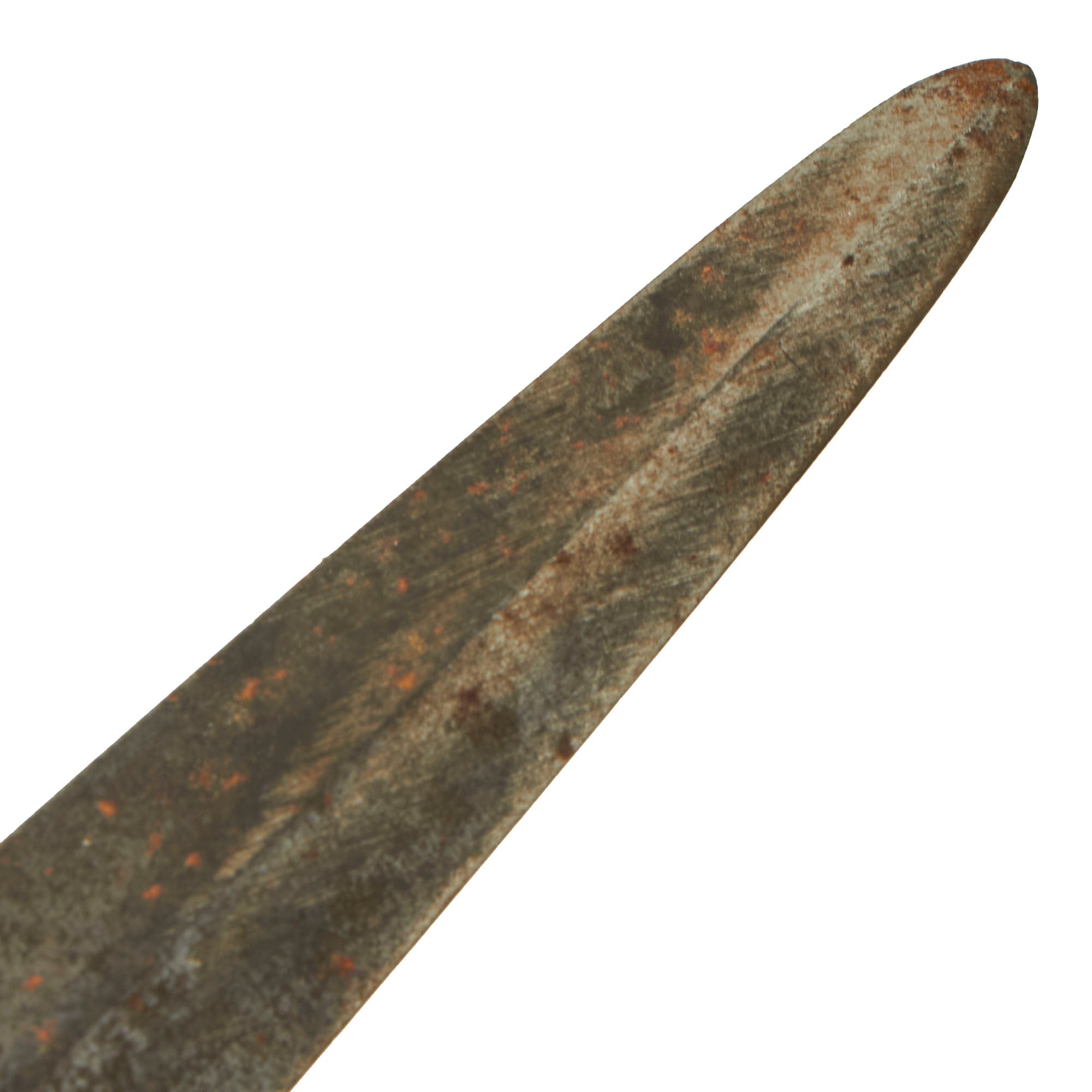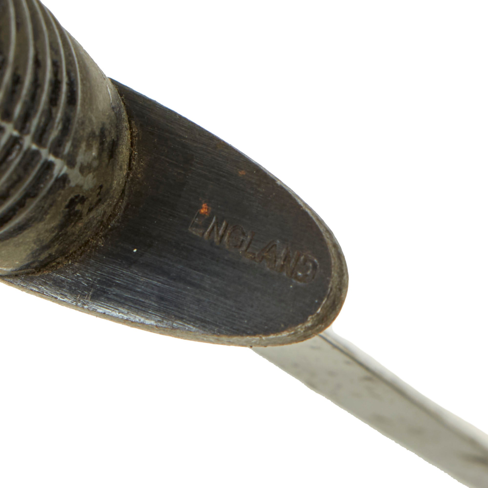 This F-S Knife is missing the scabbard & has a good bit of rust peppering and pitting, with some of the original finish rubbed off near the tip but the majority of the blue is remaining. It is stamped ENGLAND under the cross guard.