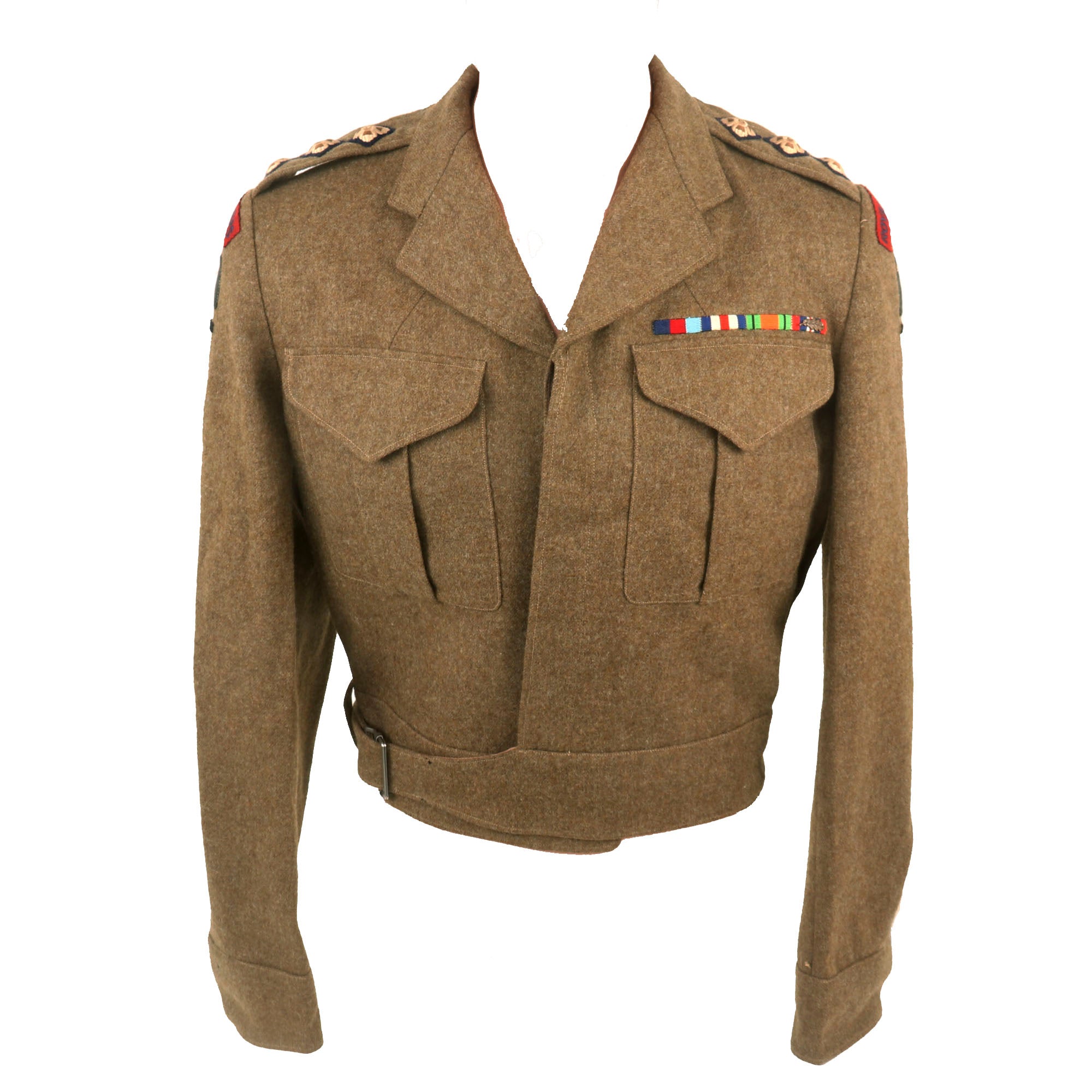 The uniform has a four-place ribbon bar, with the 1939-1945 Star, the France/German Star, the Defence Medal (United Kingdom), and the War Medal 1939-1945 with a Palm device, which signifies a mention in despatches or a King's Commendation for Brave Conduct. So this Captain certainly saw a heavy amount of service with the 49th Division.