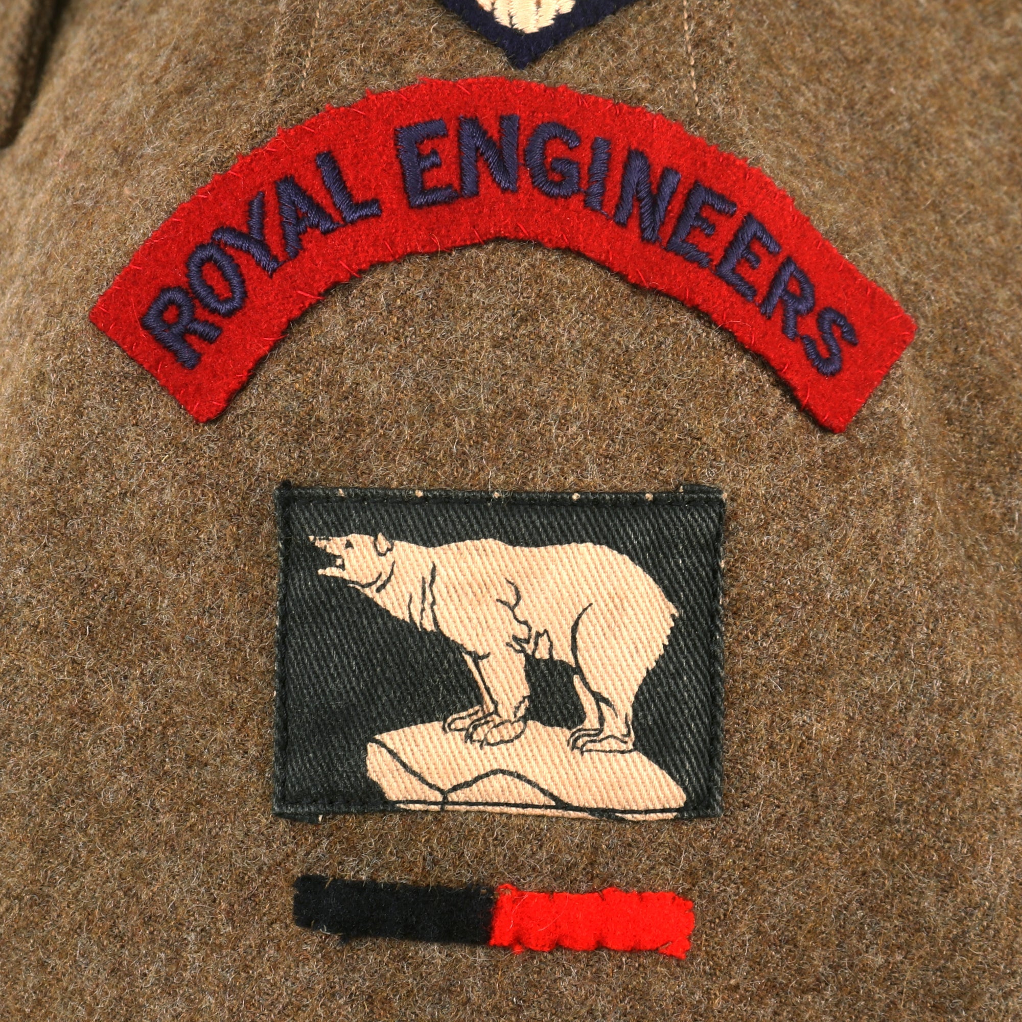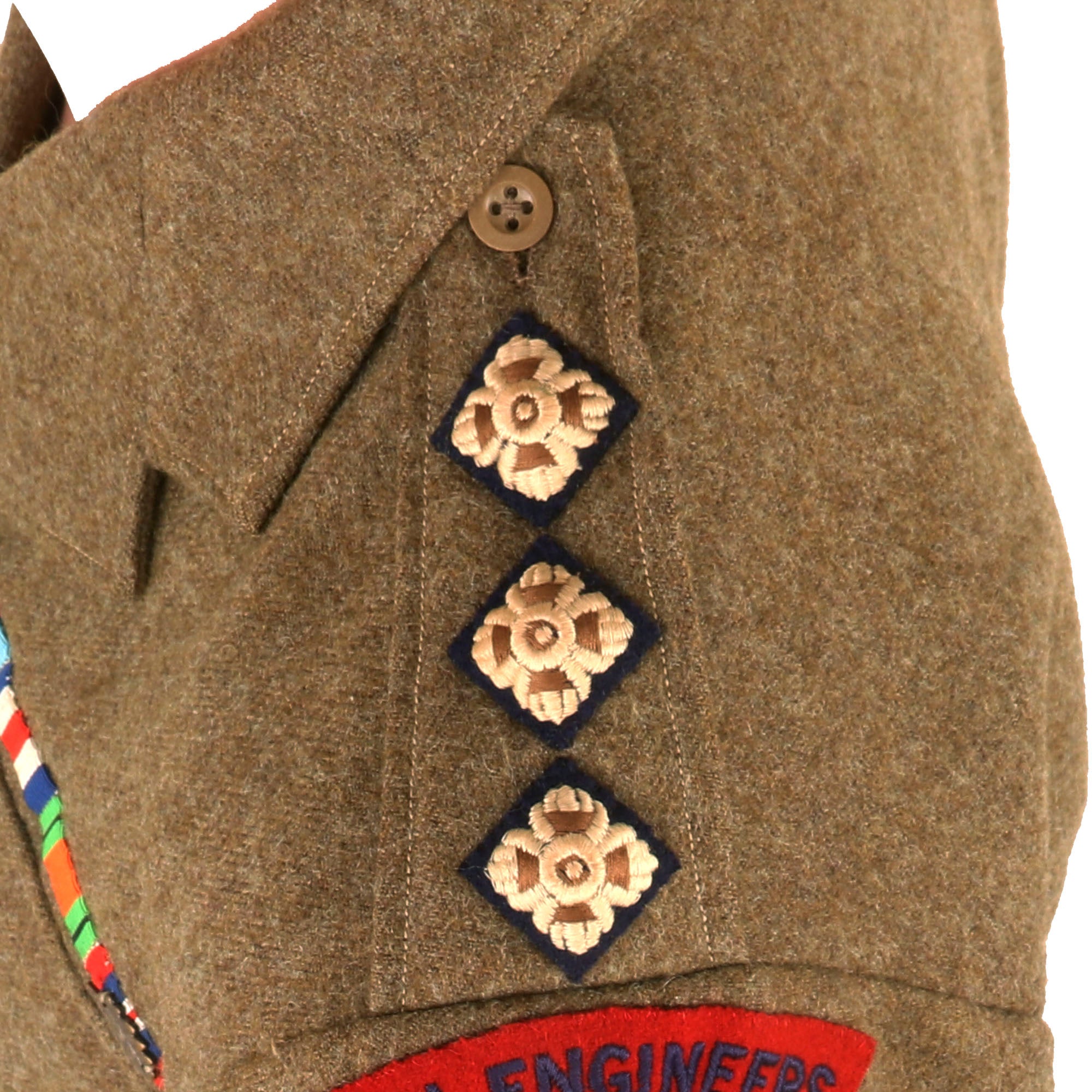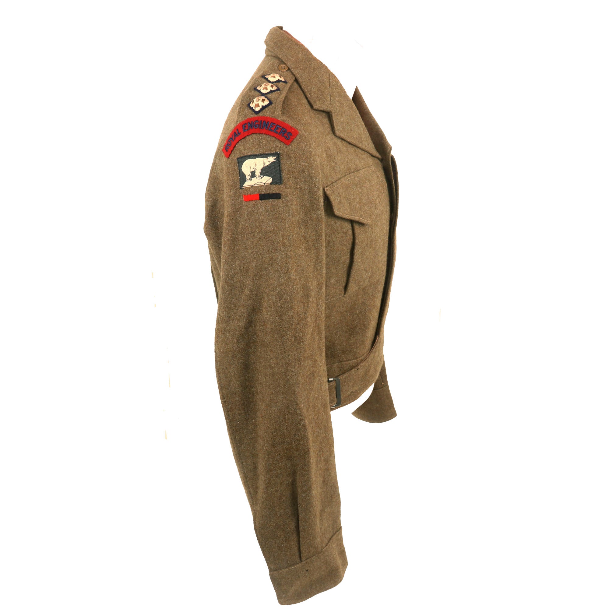 The uniform has unit scrolls on both shoulders reading ROYAL ENGINEERS with the Polar Bear patch of the 49th (West Riding) Infantry Division, with a black & red stripe under it, indicating Royal Engineers of this Division. There are three pips on each shoulder board, indicating the rank of Captain, who would be second in command of a company of men.