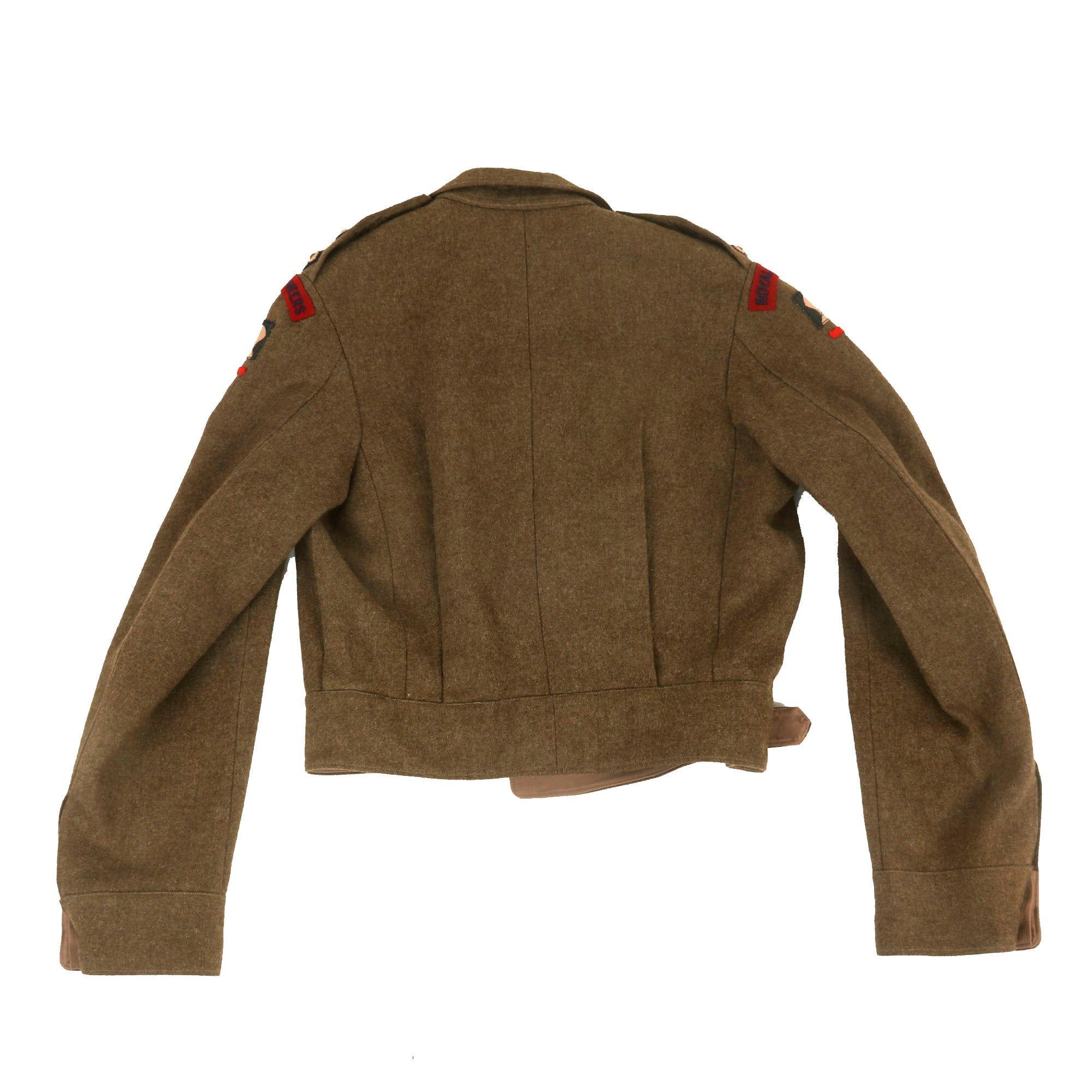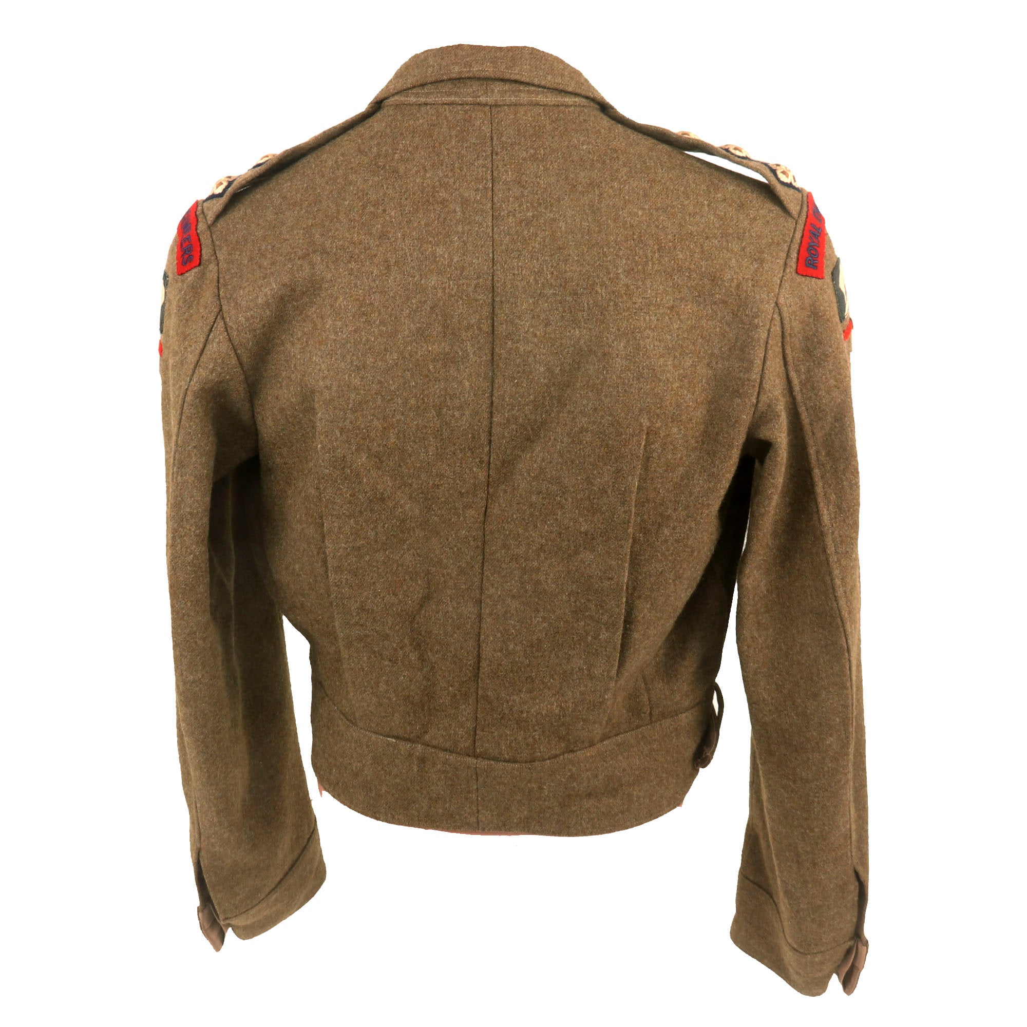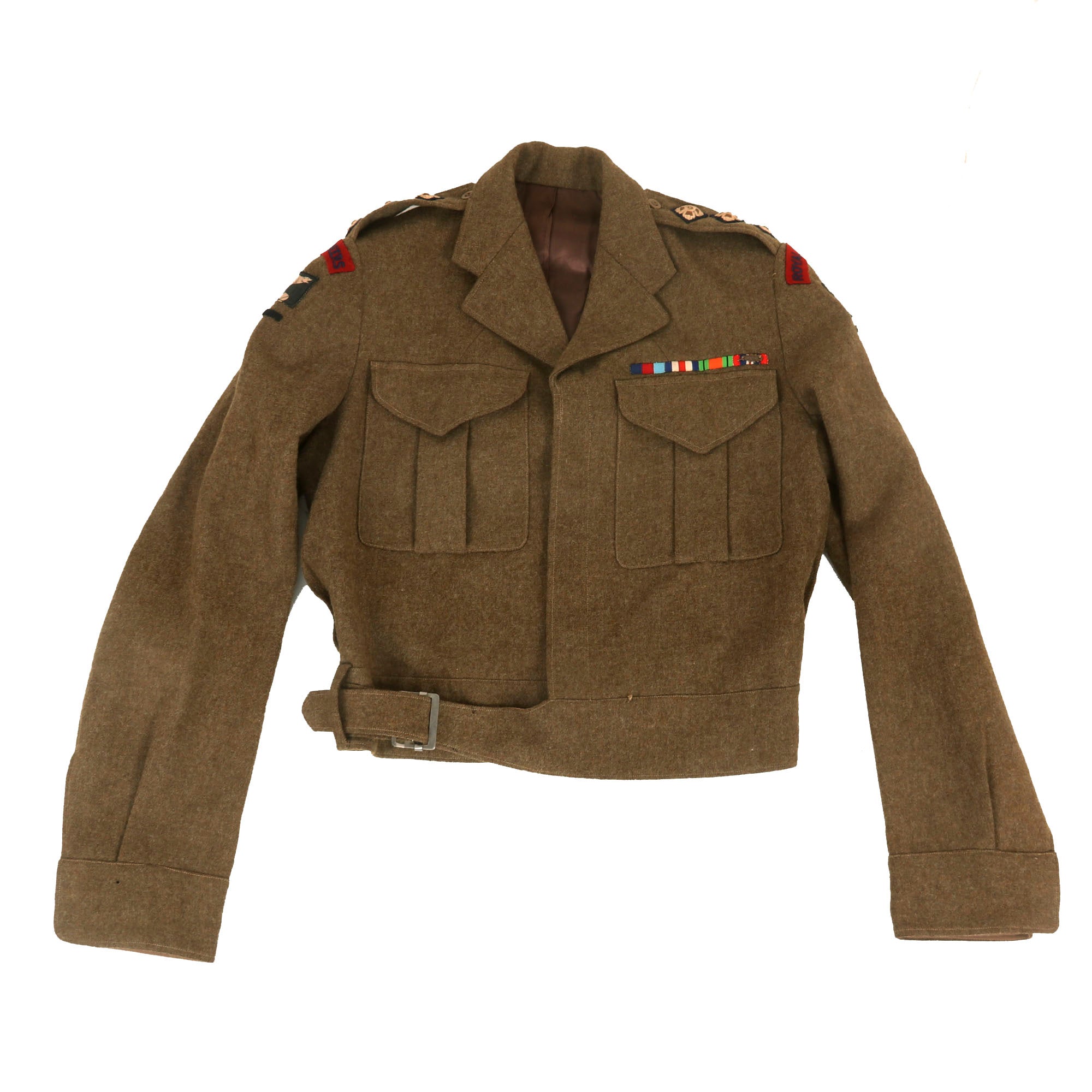 The uniform has unit scrolls on both shoulders reading ROYAL ENGINEERS with the Polar Bear patch of the 49th (West Riding) Infantry Division, with a black & red stripe under it, indicating Royal Engineers of this Division. There are three pips on each shoulder board, indicating the rank of Captain, who would be second in command of a company of men.