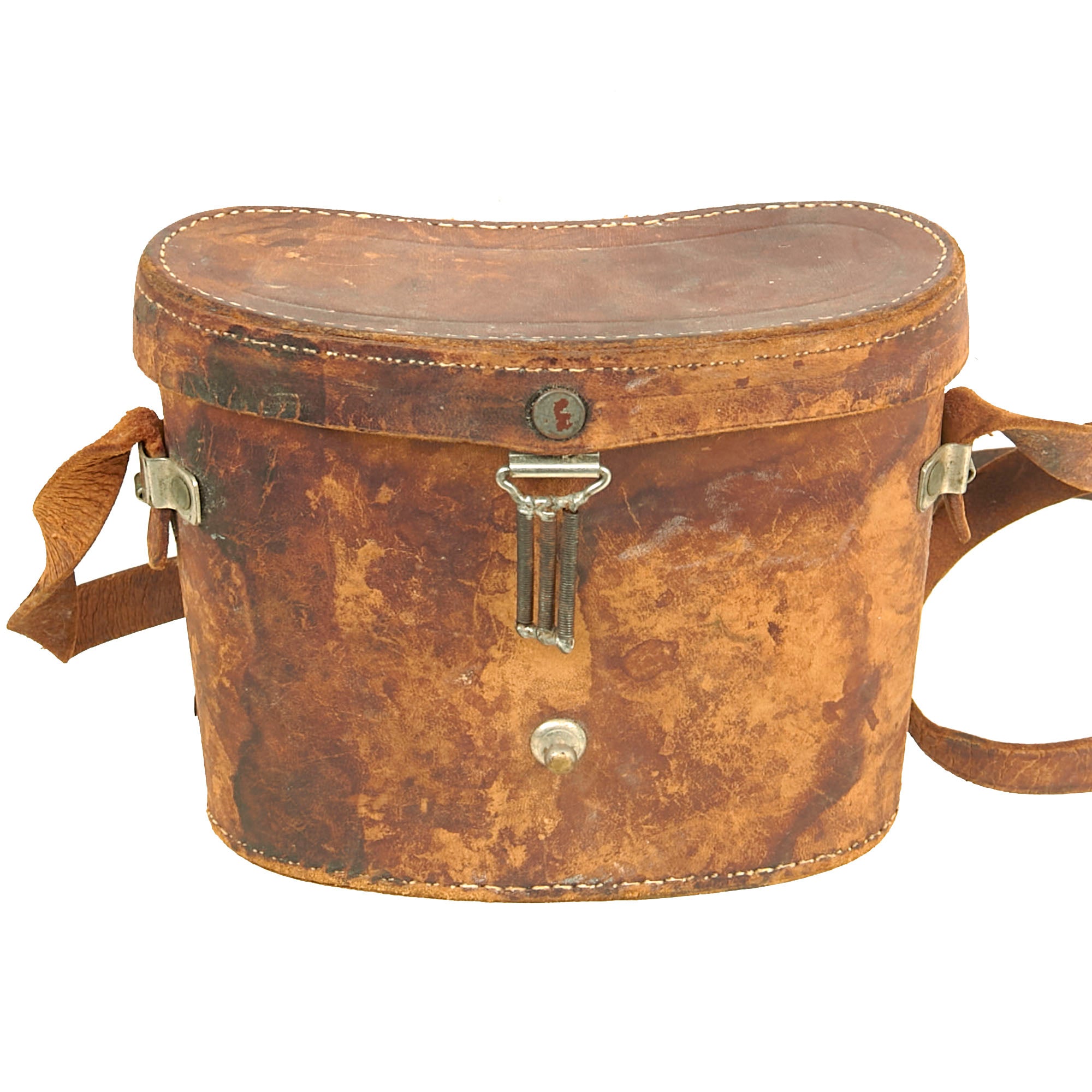 The binoculars come in their leather carrying case which is very heavily worn, but the original carrying strap is mostly intact. The closure is broken.