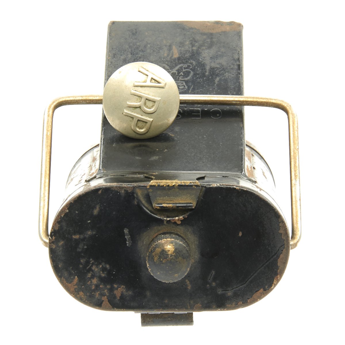 Comes with wire folding carry handle and spring steel belt clip to rear. Included and mounted on the carry handle is a ARP Tunic button marked ARP with Maker's name of CHENEY / B'HAM on the rear.