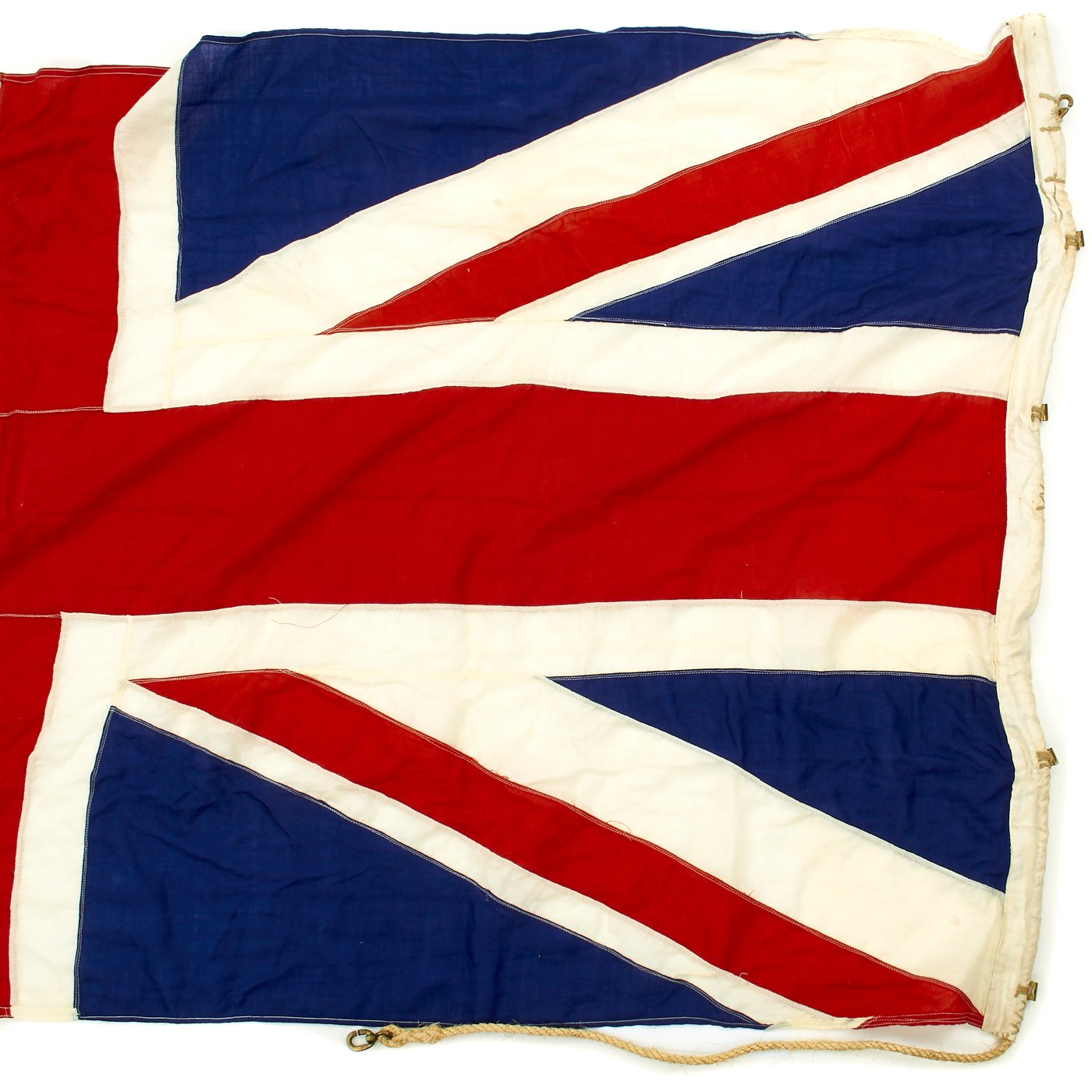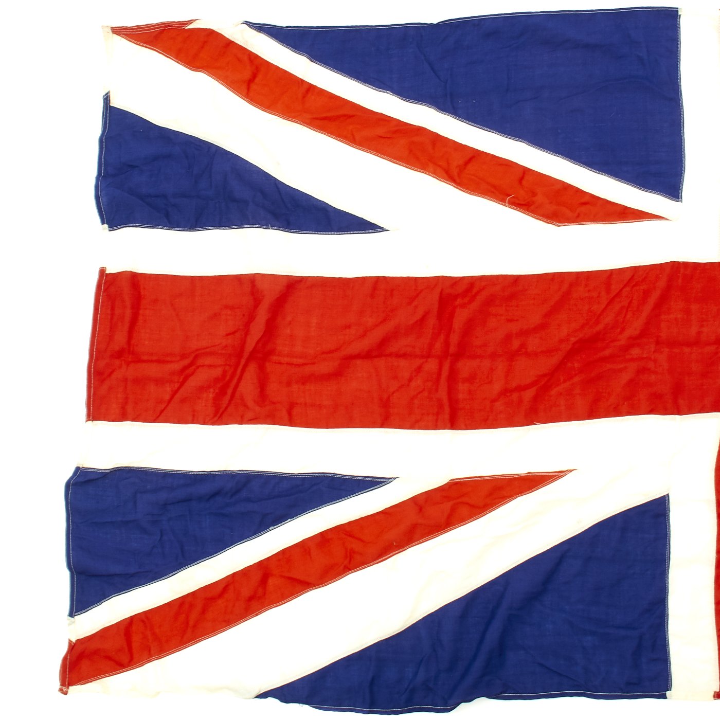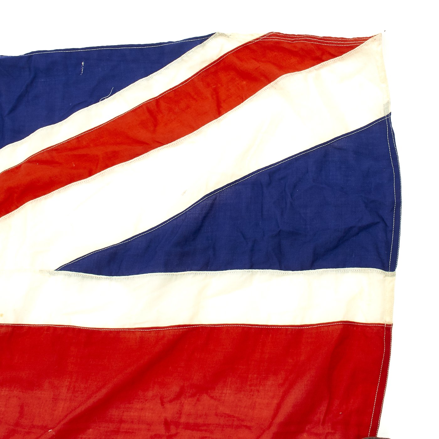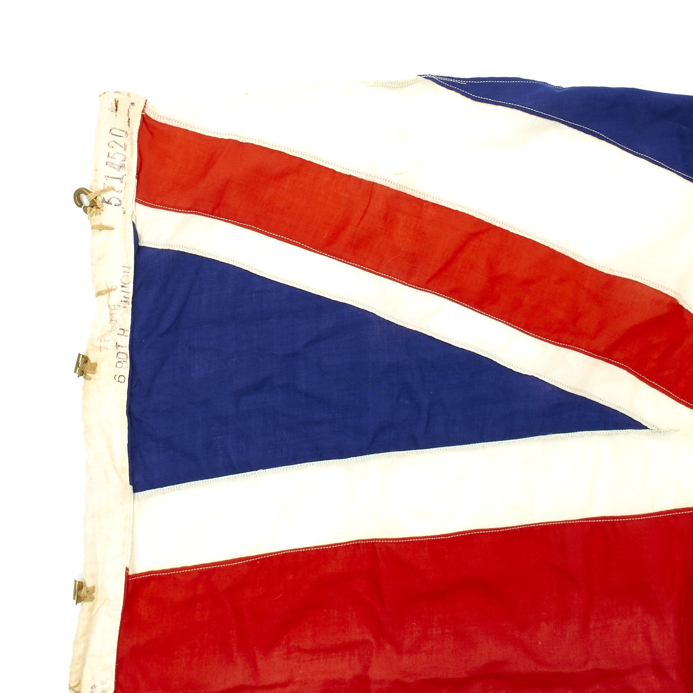 - Original Item: Only One Available. This is a very nice Original British World War Two or Post War Union Jack Flag, measuring approximately 52" x 108". The flag is free of moth and other damage thought it is flecked with some small nips and minor staining which is consistent with age and use. It is constructed of wool bunting. The wool flag in red, white, and blue, with brass clips up the luff, the luff stenciled Union 5714520 and 6 BOT H. The flag weighted at end of luff. A great display piece for an empty wall!