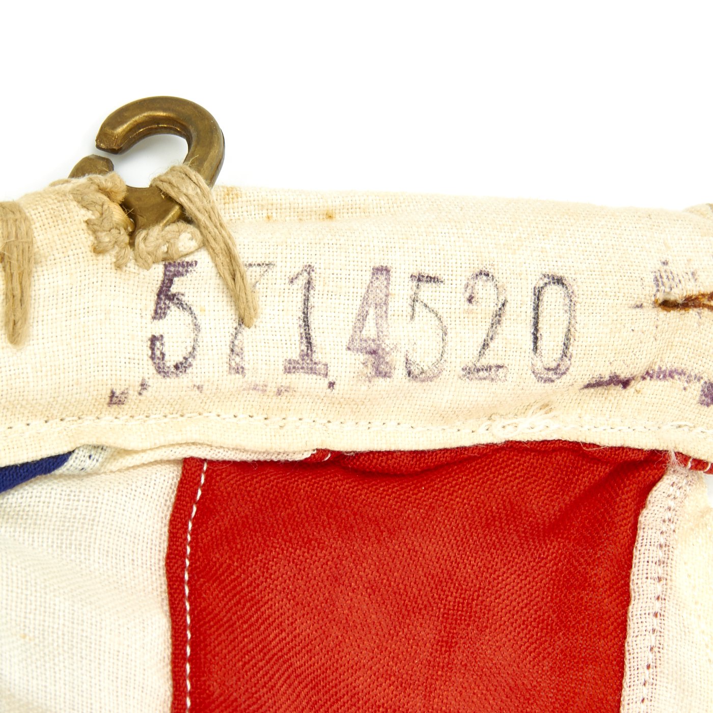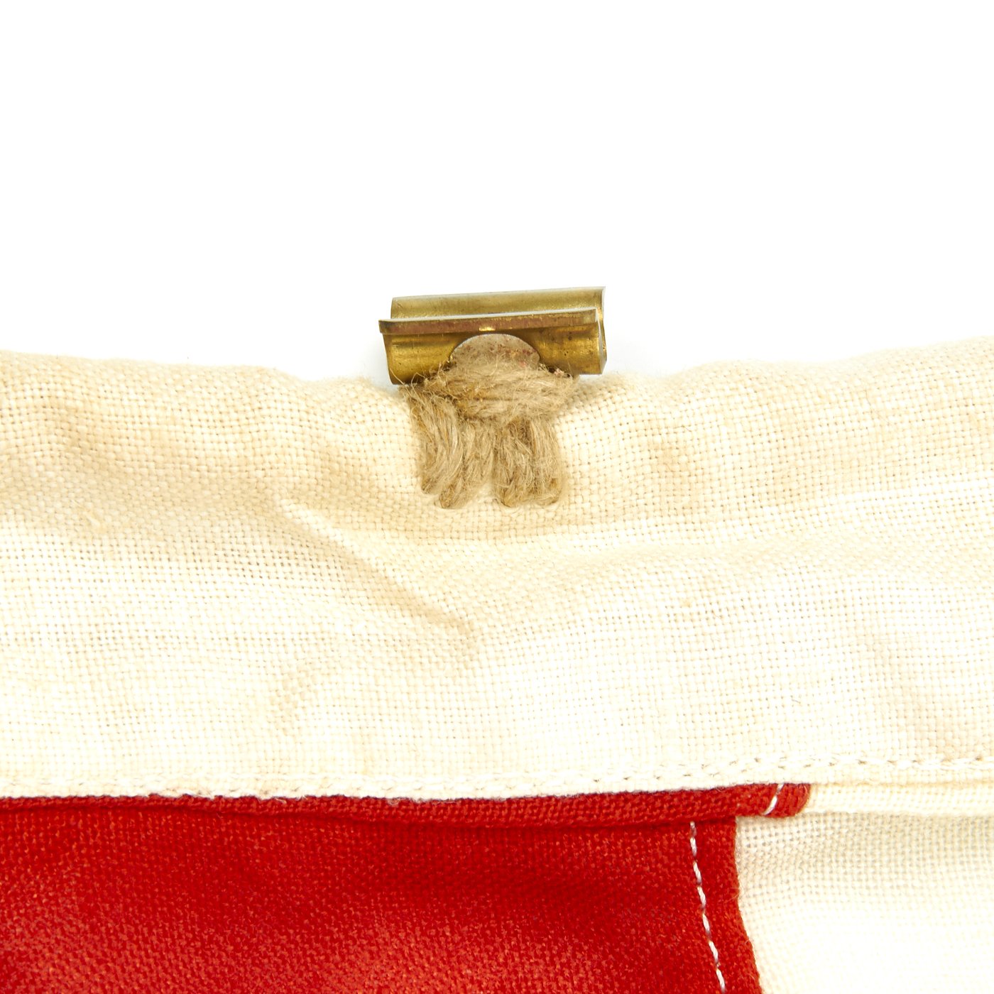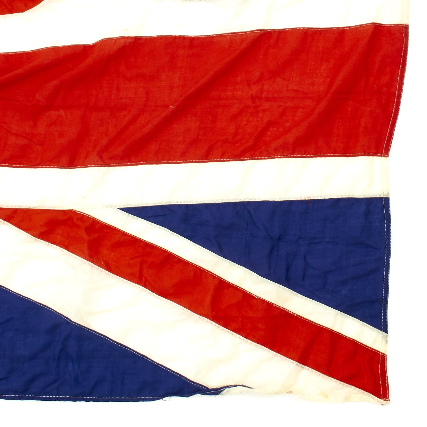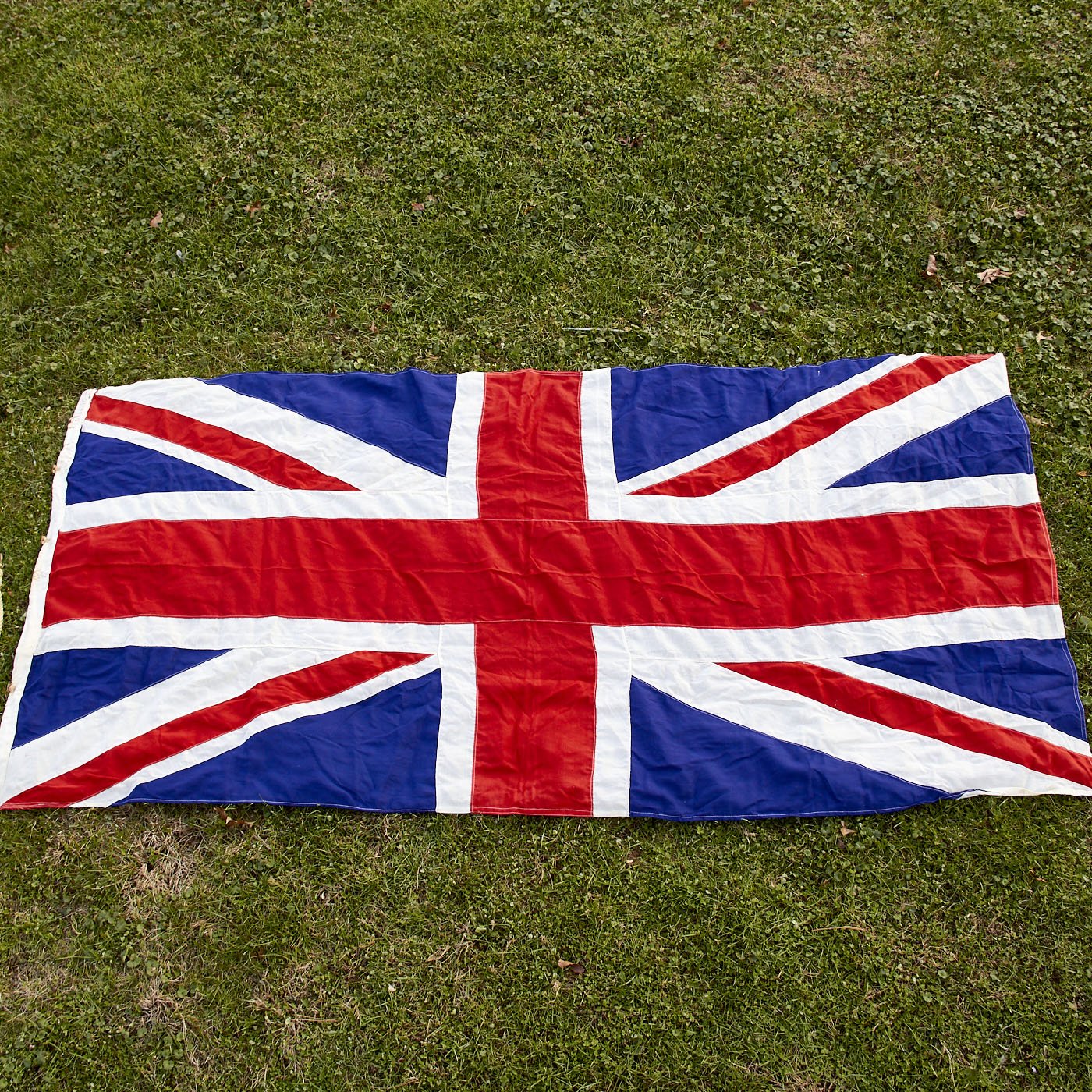 - Original Item: Only One Available. This is a very nice Original British World War Two or Post War Union Jack Flag, measuring approximately 52" x 108". The flag is free of moth and other damage thought it is flecked with some small nips and minor staining which is consistent with age and use. It is constructed of wool bunting. The wool flag in red, white, and blue, with brass clips up the luff, the luff stenciled Union 5714520 and 6 BOT H. The flag weighted at end of luff. A great display piece for an empty wall!