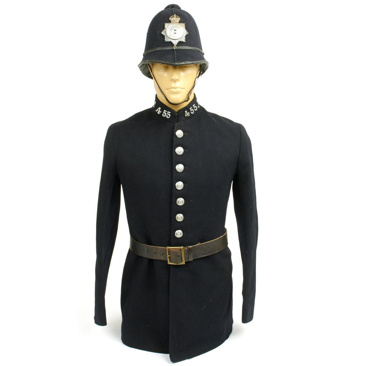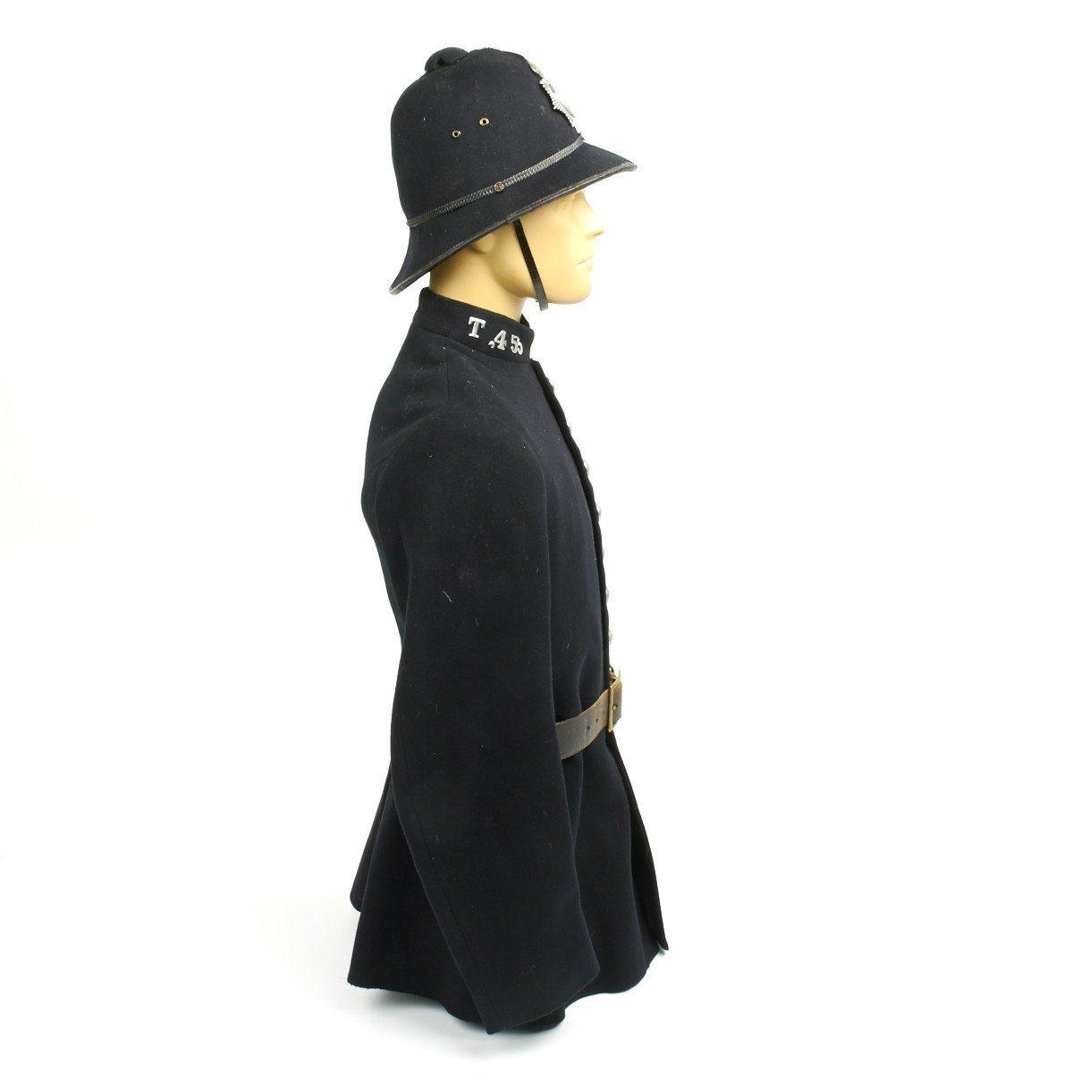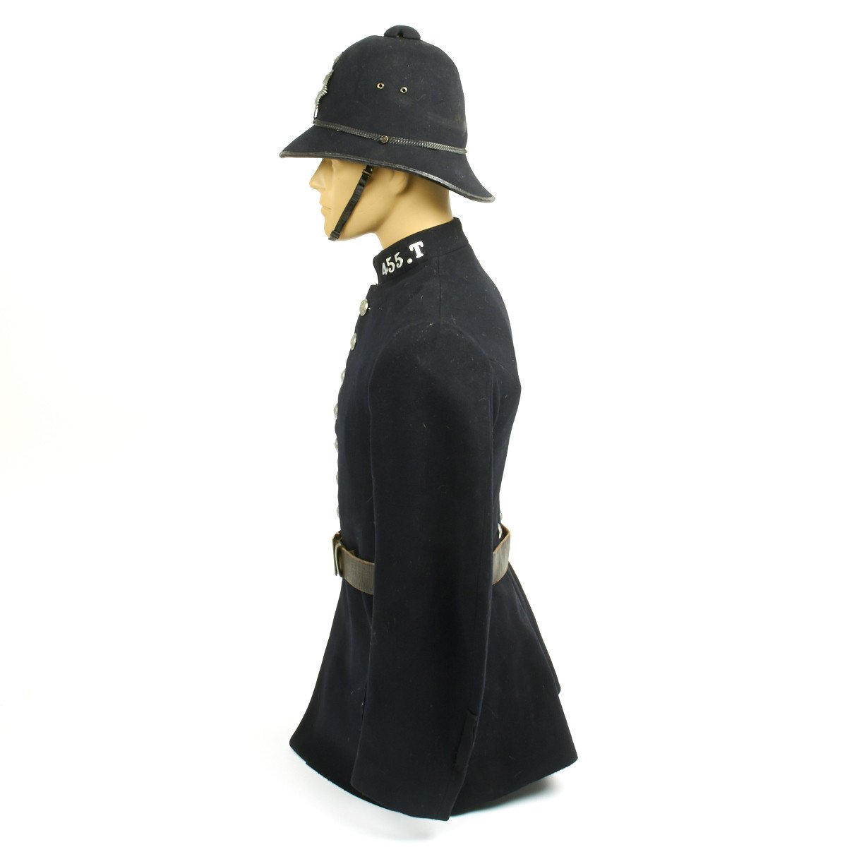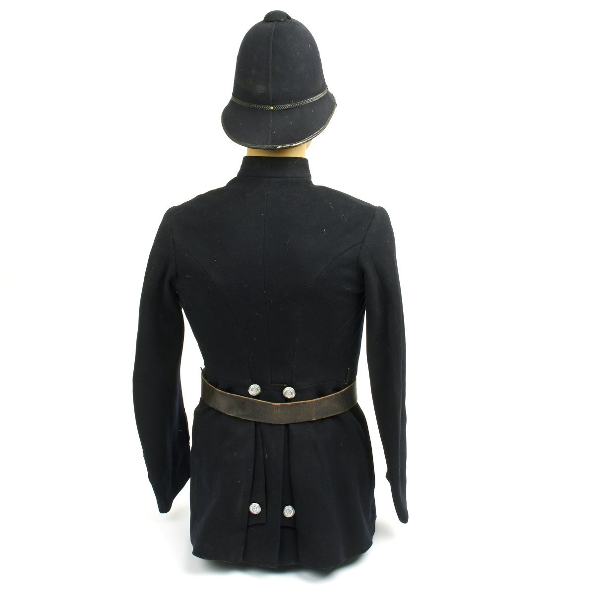 Original Items: Only One Set Available. As seen in all the BLITZ newsreel scenes this is an original British WW2 Police Bobby uniform set consisting of high collar, buttons to the throat, dark blue tunic with correct King's Crown buttons for King George VI marked "Metropolitan Police". The military high standing collar bearings the officer’s service number: T.455. Tunic comes complete with wide leather waist belt.