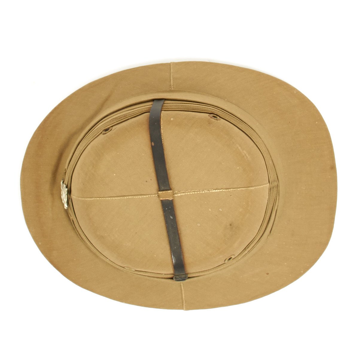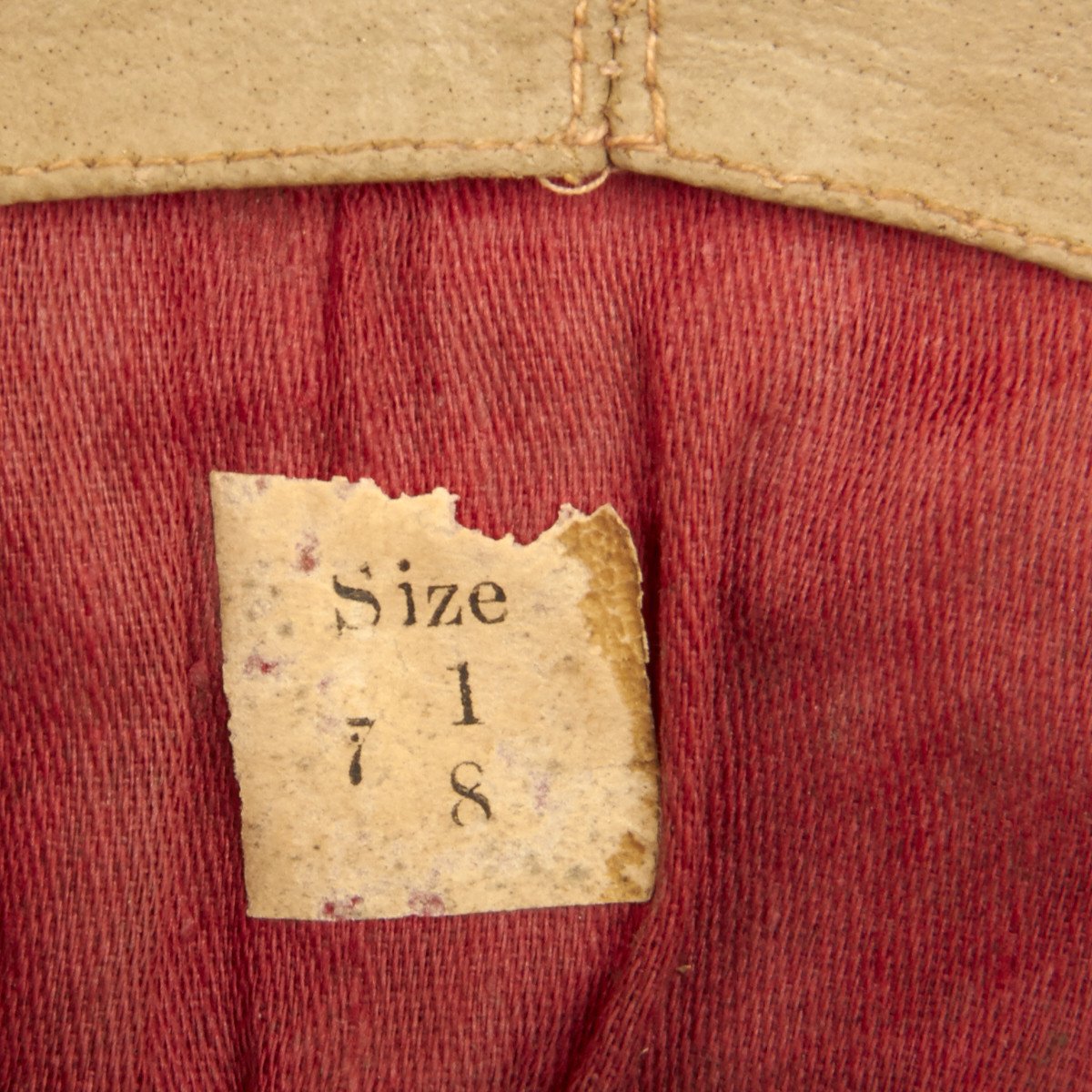 Features of note include the correct khaki color, leather headband with size tag reading 7 1/8 with pleated cotton lining.