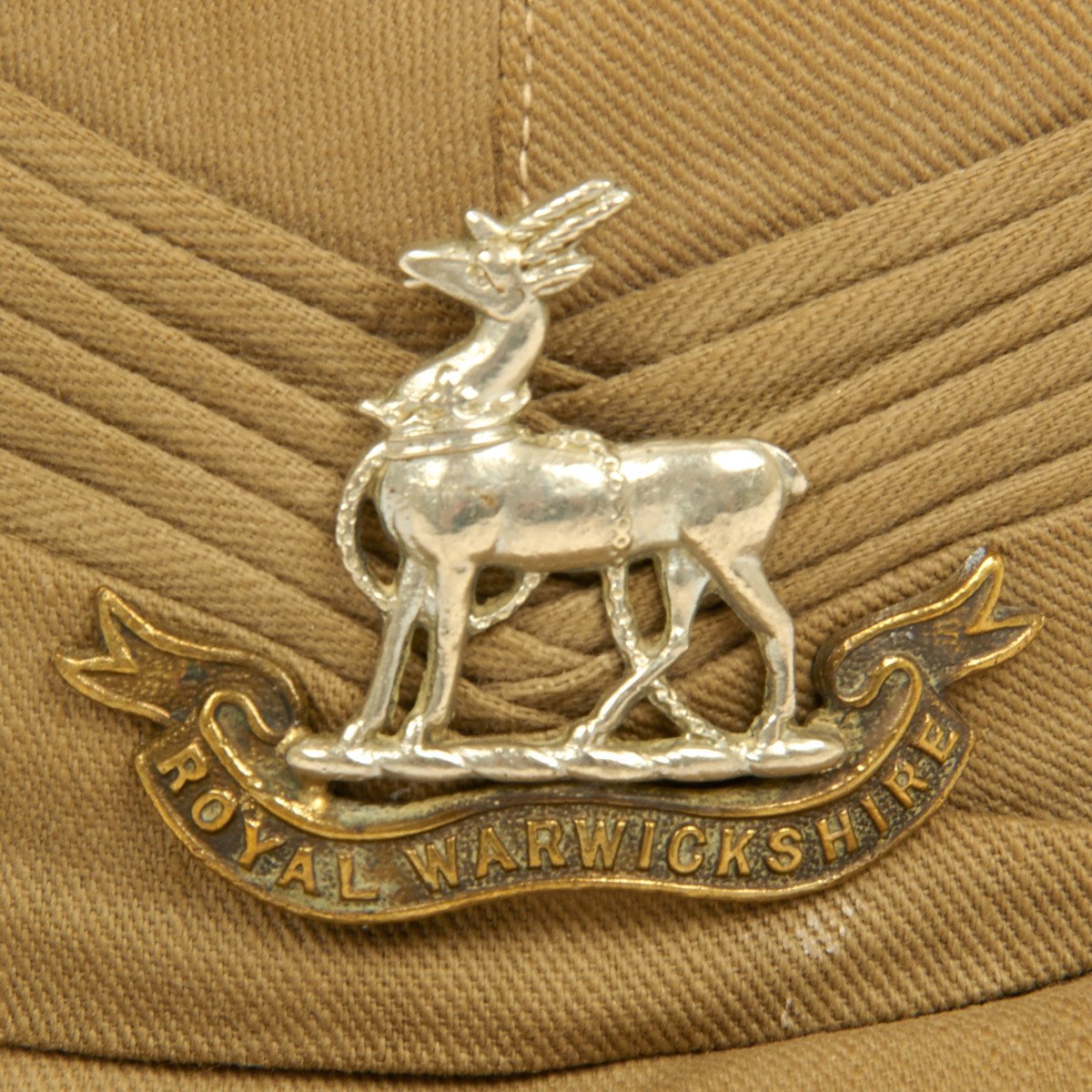 This is a completely original WWII production example with leather top strap and pugaree (crown wrap) bearing the brass helmet badge of the Royal Warwickshire Regiment. The chinstrap is absent.