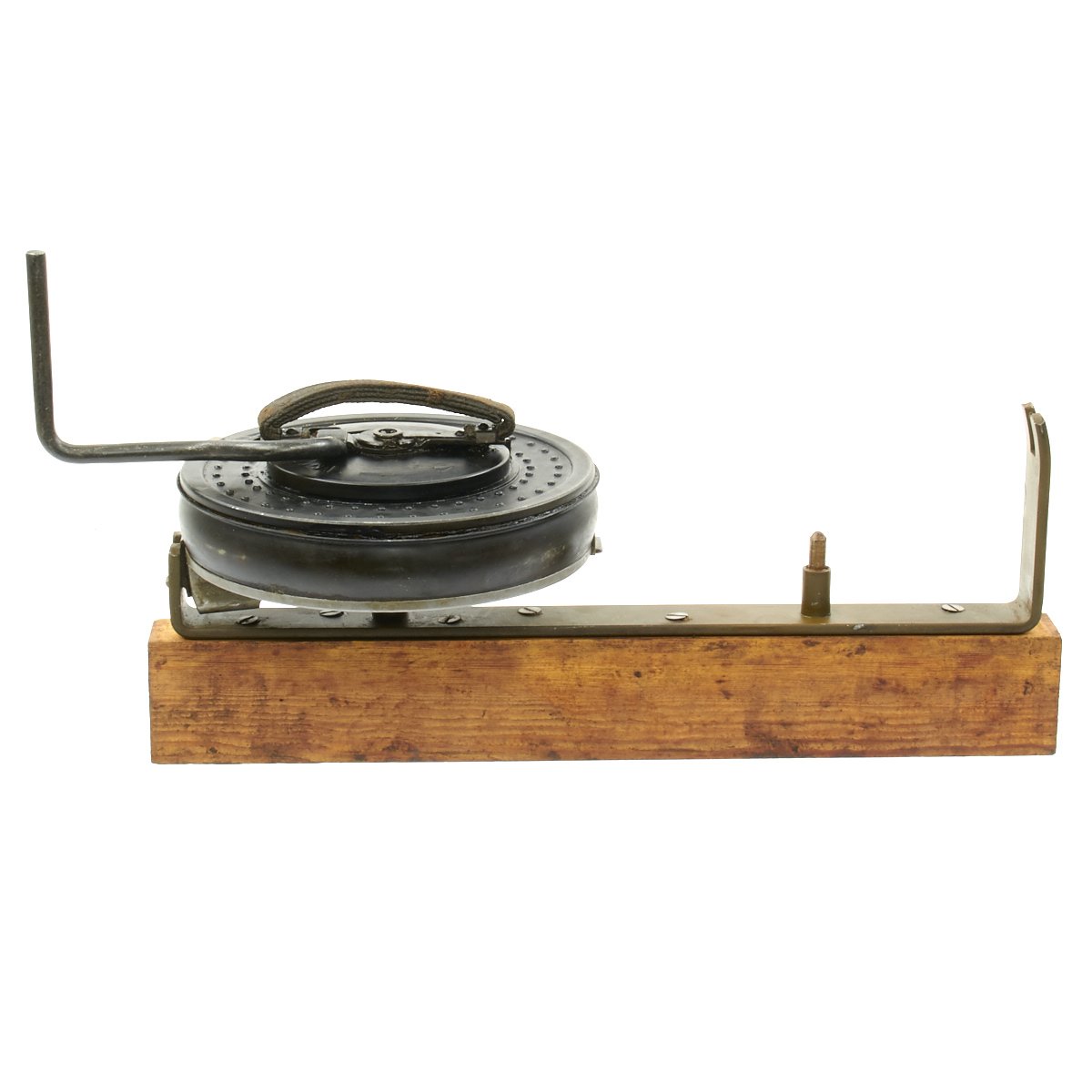 This fine MkI example is offered complete with the winder, required adapter plate for use with the Bren LMG, and with the Wooden Loading block needed to mount the drum whilst reloading. These are extremely rare, and it has been years since we have been able to offer one of these sets. The drum is in very good condition, with the expected staining on the canvas carry handle from years of storage in grease, which is still present on parts of the magazine.