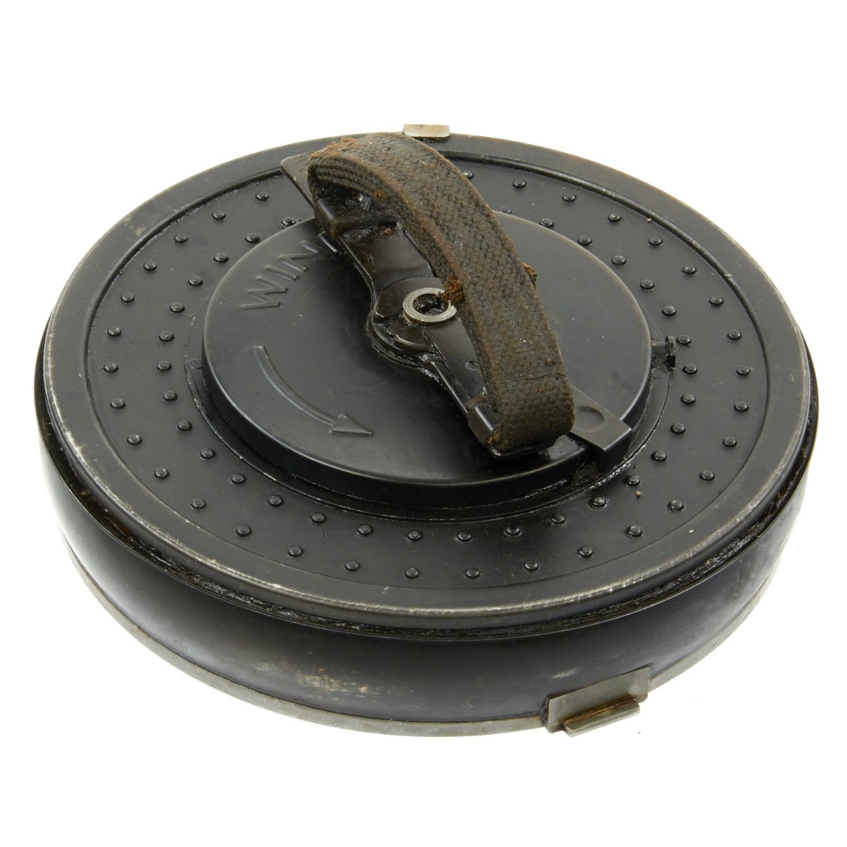 Original Item: Only One Available. A special offering for the advanced British WW2 Collector; IMA has found a lost case of these exceptionally scarce 100 drum magazines issued in WW2 for use with the Bren Light Machine Gun. They were originally intended for anti-aircraft use, where the 100 round capacity would prevent the need to reload while staying trained on the aircraft. These "Speed Drums" as they were named came in two varieties, the MkI and MkII, with the main difference being the loading/winding handle. The early model had a separate spring winder, while the MkII had the winder built into the drum, which ensured that the winder was always close at hand.