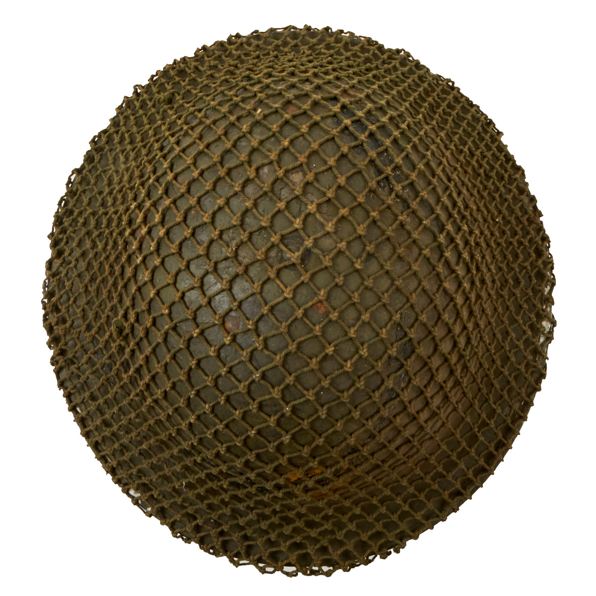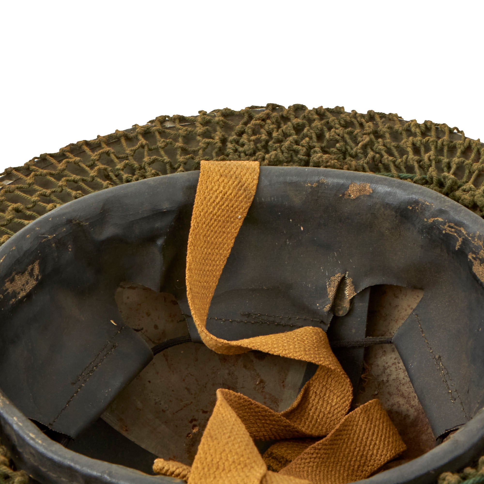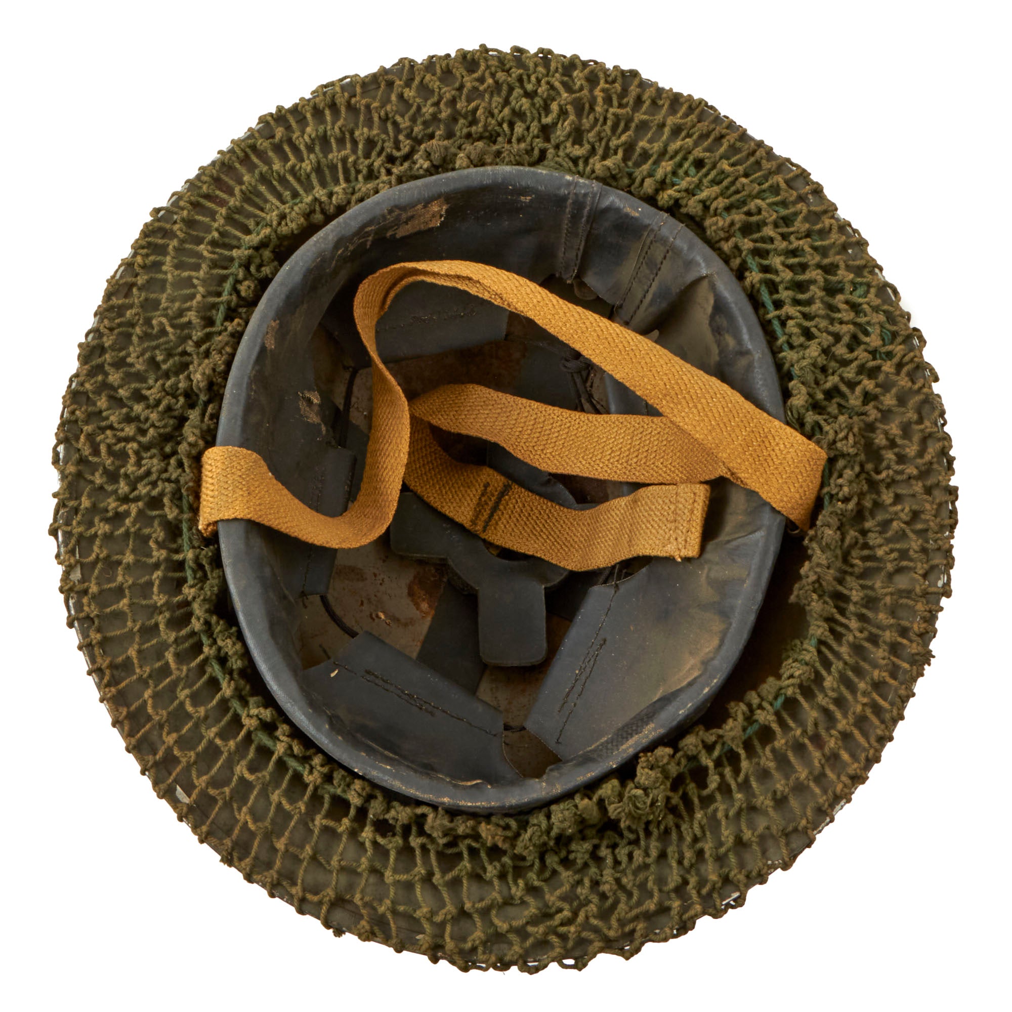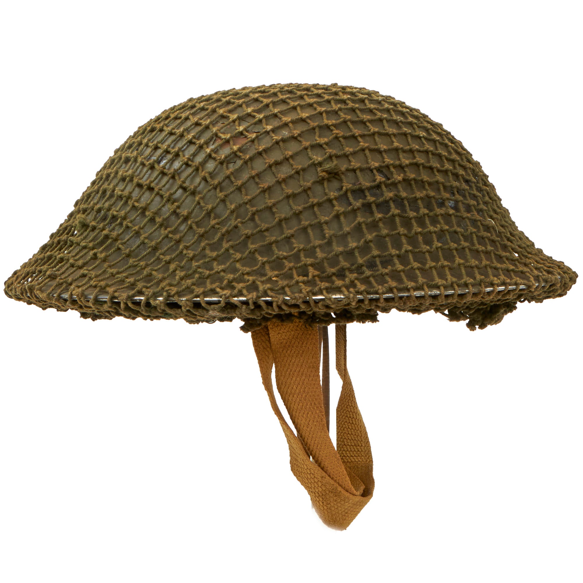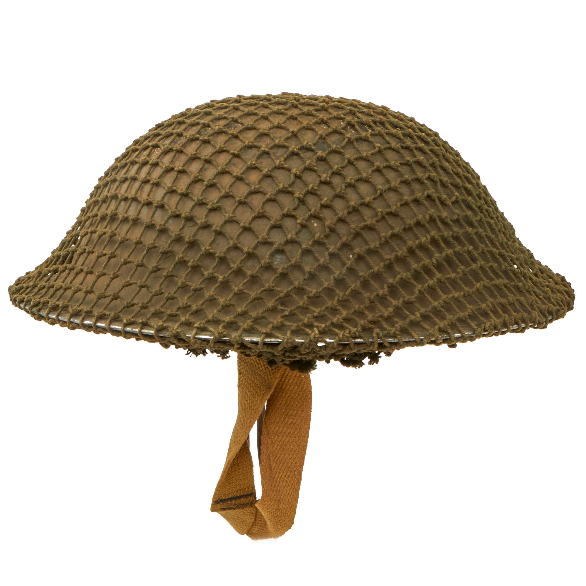 Original Item: Only One Available. This is a very good example of a genuine British -Manufactured Mark II steel helmet, complete with chinstrap and Helmet Net. It comes with the correct dark OD green paint used on British helmets, which does show some wear from service. There are some chips and dents on the top, which has allowed the steel to oxidize, and there is also some wear and oxidation on the interior. The stainless steel rim is also missing some paint, which is typical.