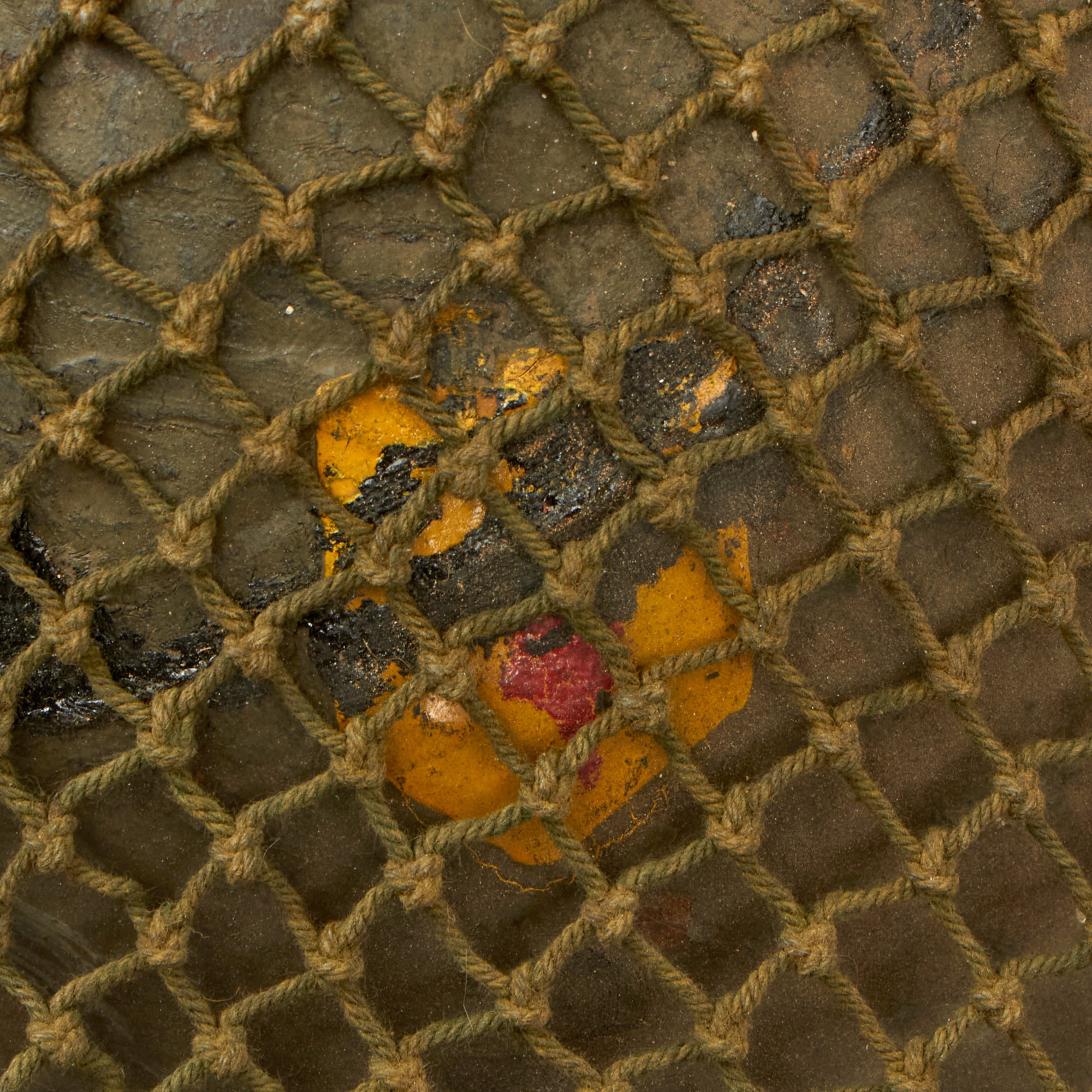 The front of the helmet has a yellow shield with a red marking inside, a tactical flash for an infantry unit. Unfortunately this helmet had been stacked with other helmets for a long time at some point, which resulted in the oil cloth leaving a black ring on the top, partially obscuring the flash.
