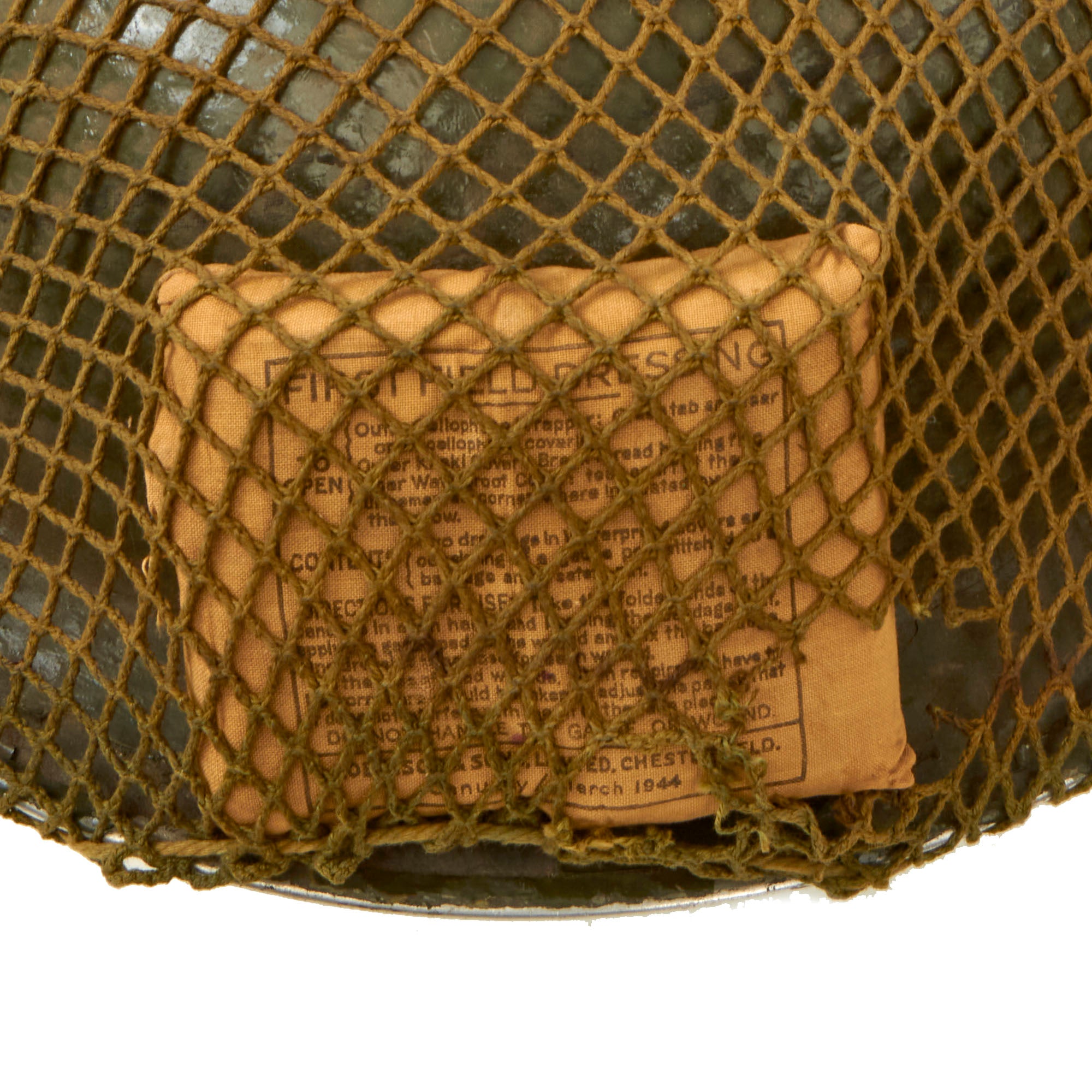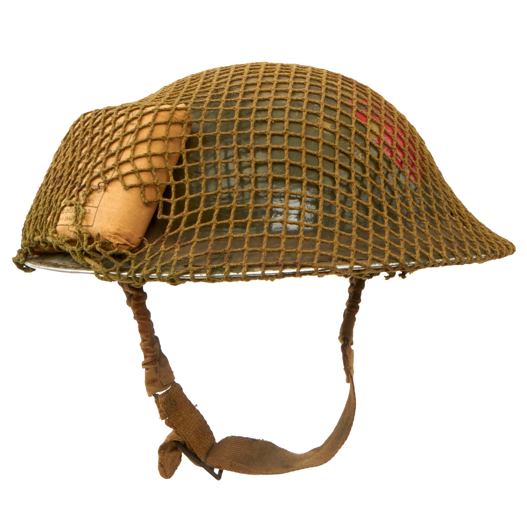 Original Item: Only One Available. This is a very good example of a genuine British -Manufactured Mark II steel helmet, complete with chinstrap, Helmet Net and First Aid Dressing. It comes with the correct dark OD green paint used on British helmets, which has only some light wear on the stainless steel rim. The front of the helmet has an inverted red shield, a tactical flash for an infantry unit.