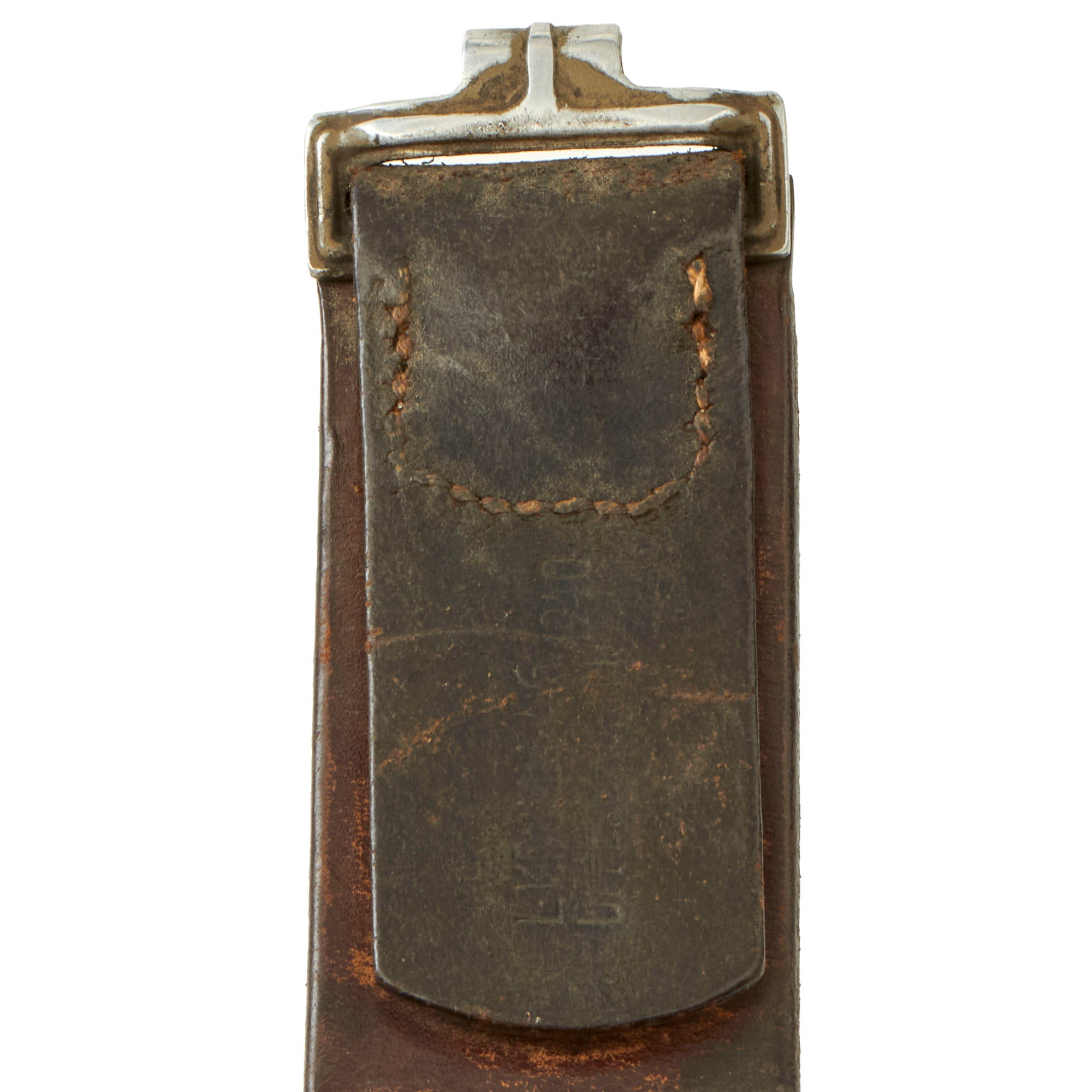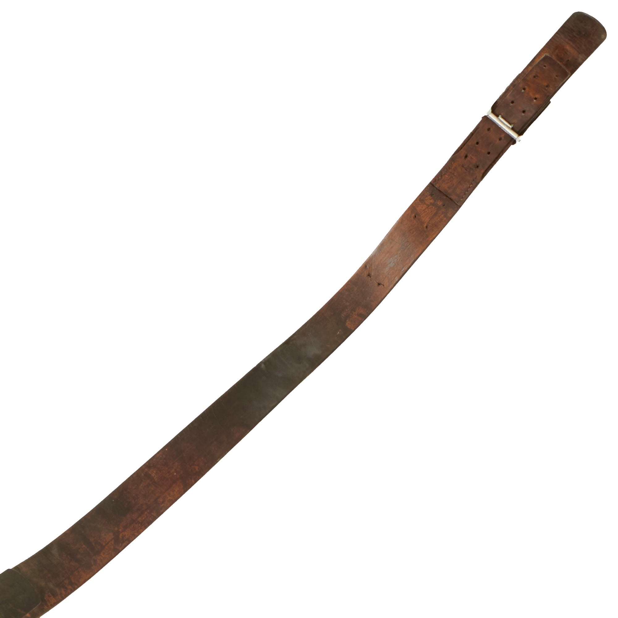 The belt itself is maker-marked E. KRUMM A.G. OFFENBACH 1940. The end piece is marked L&F. It measures roughly 40” in length and is marked Size 60.