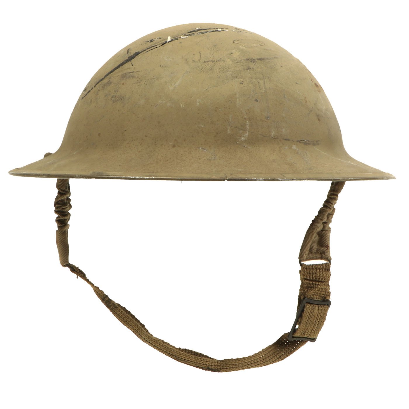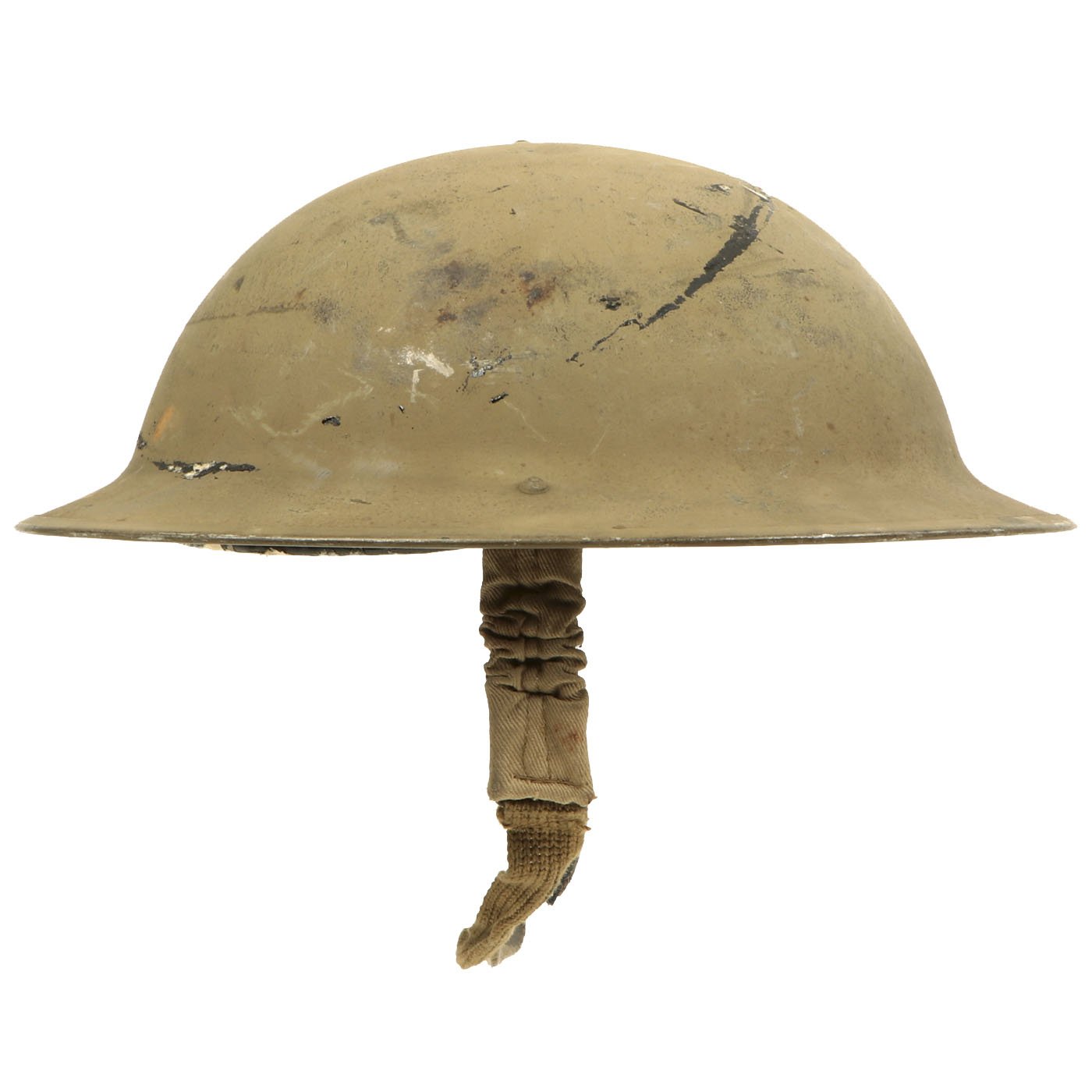 Original Item: Only One Available. This is a very good example of a genuine British -manufactured Mark II steel helmet, dated 1941 on the chin strap bales, complete with an original liner and chin strap. It comes with a correct early war "Desert Tan" paint job, as used in the Africa Campaign of the war. There is some wear around the stainless steel rim, but nothing major.