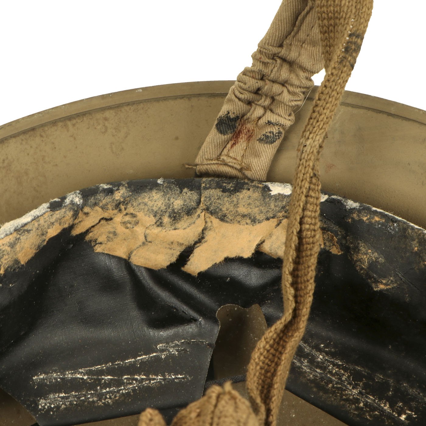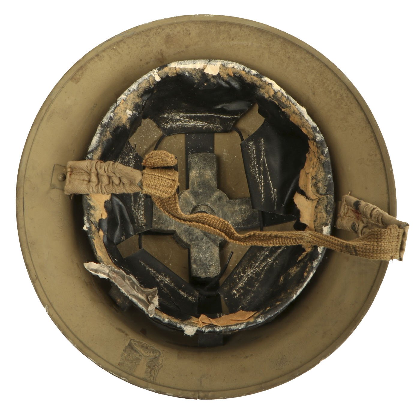 The original liner is in very good used condition, with nice oil cloth, and only light wear from service. It does have some paper stuck to the liner, which was used during post war storage to stack these helmets one atop another without sticking. This was unfortunately often not entirely successful. The original fiber support is also in great shape and reads: