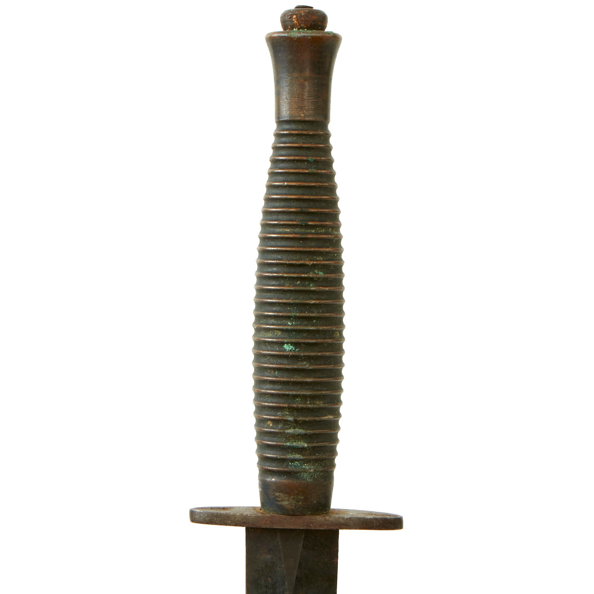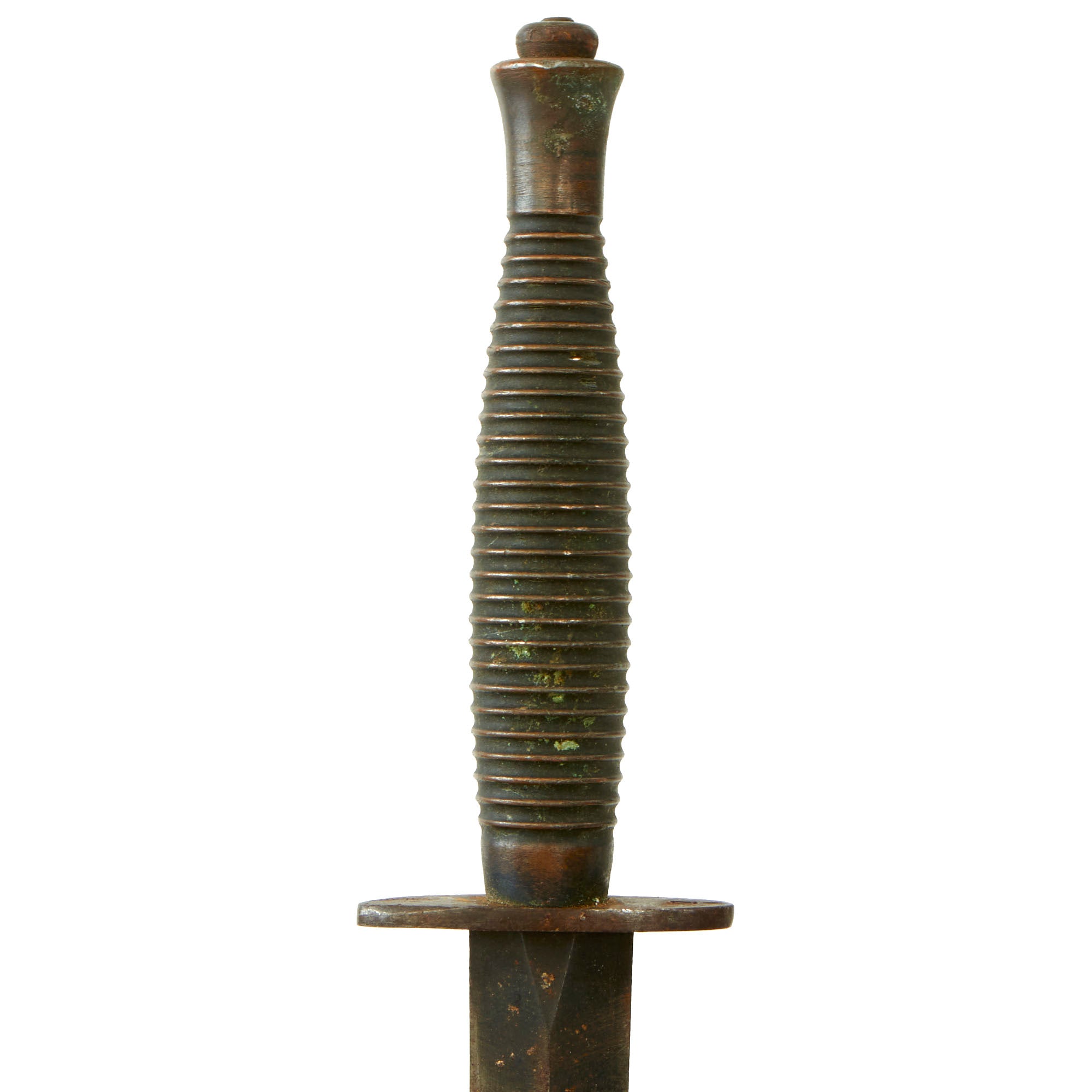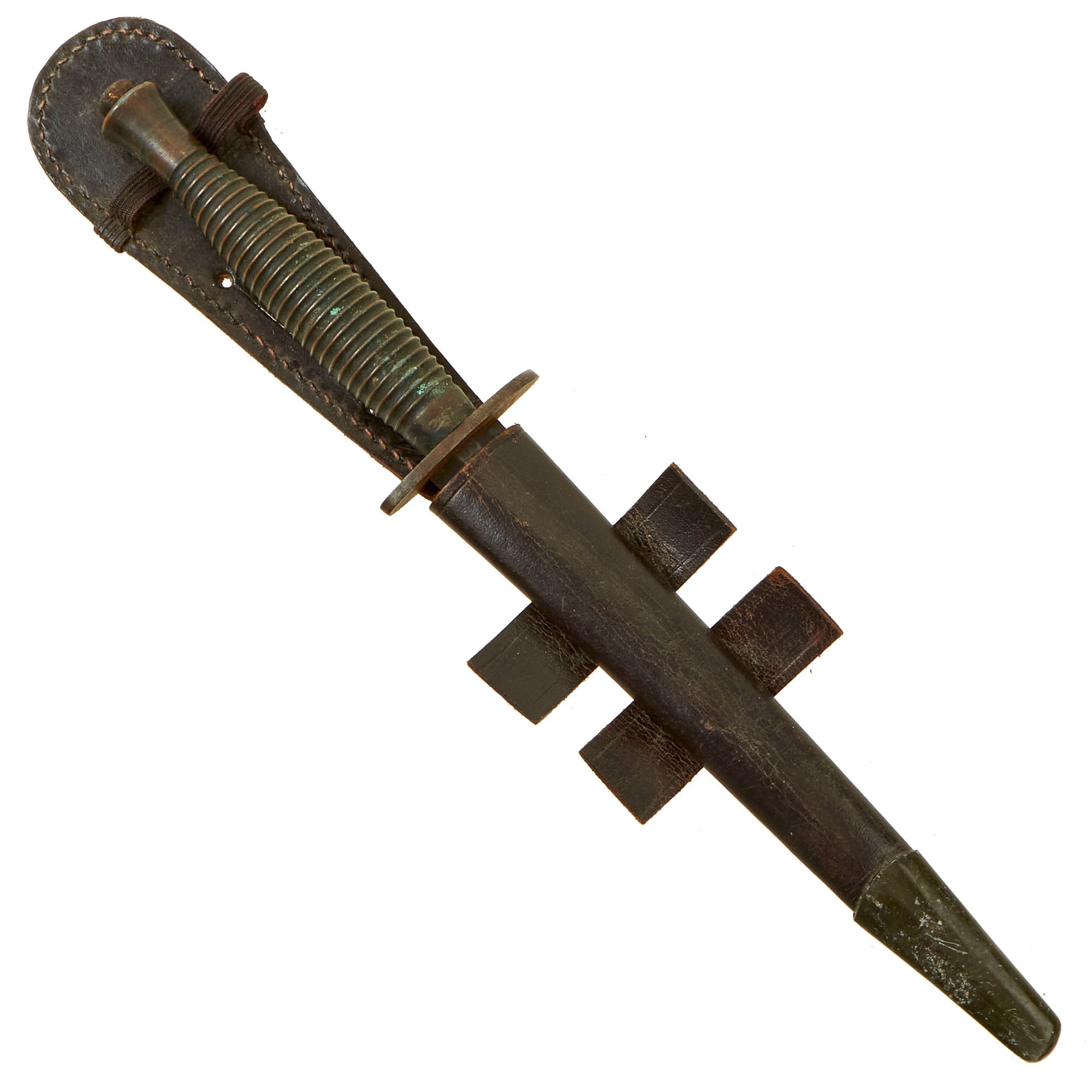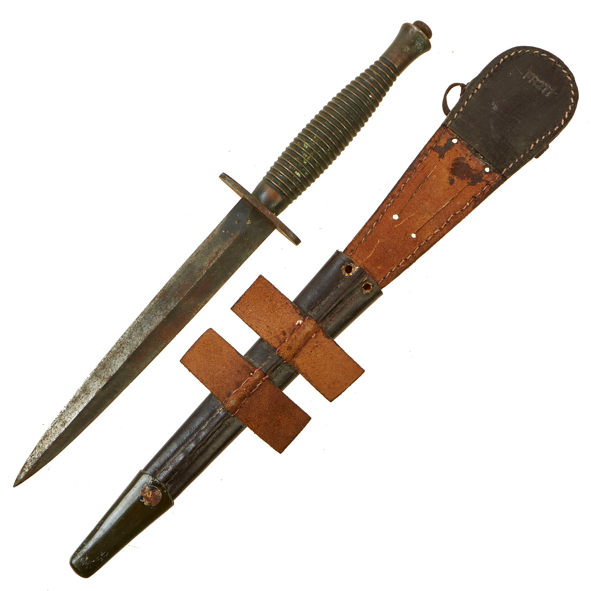 Original Item: Only One Available. This is an excellent example of an early "Third Pattern" British Fairbairn-Sykes commando dagger, with a Copper coated alloy handle and original scabbard.