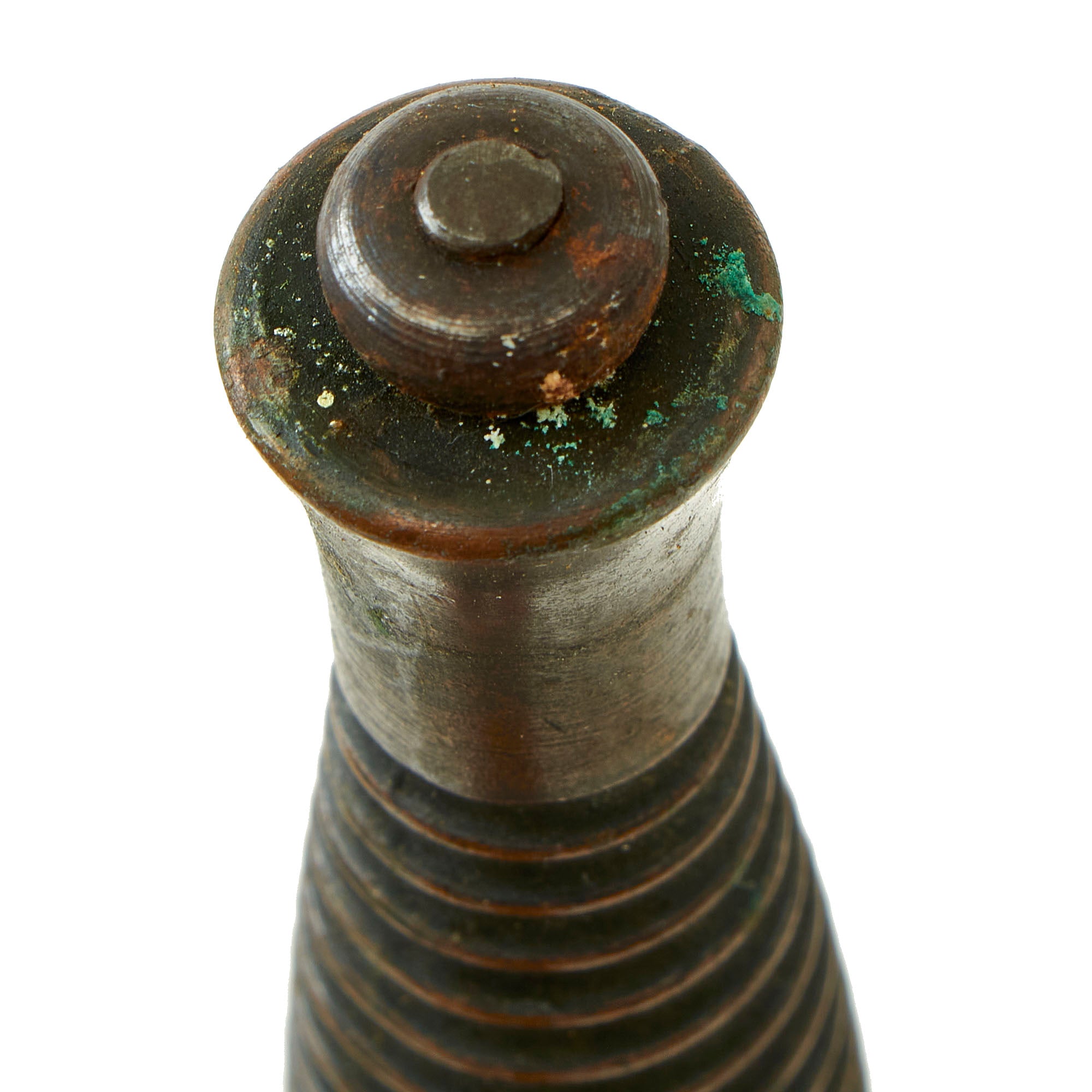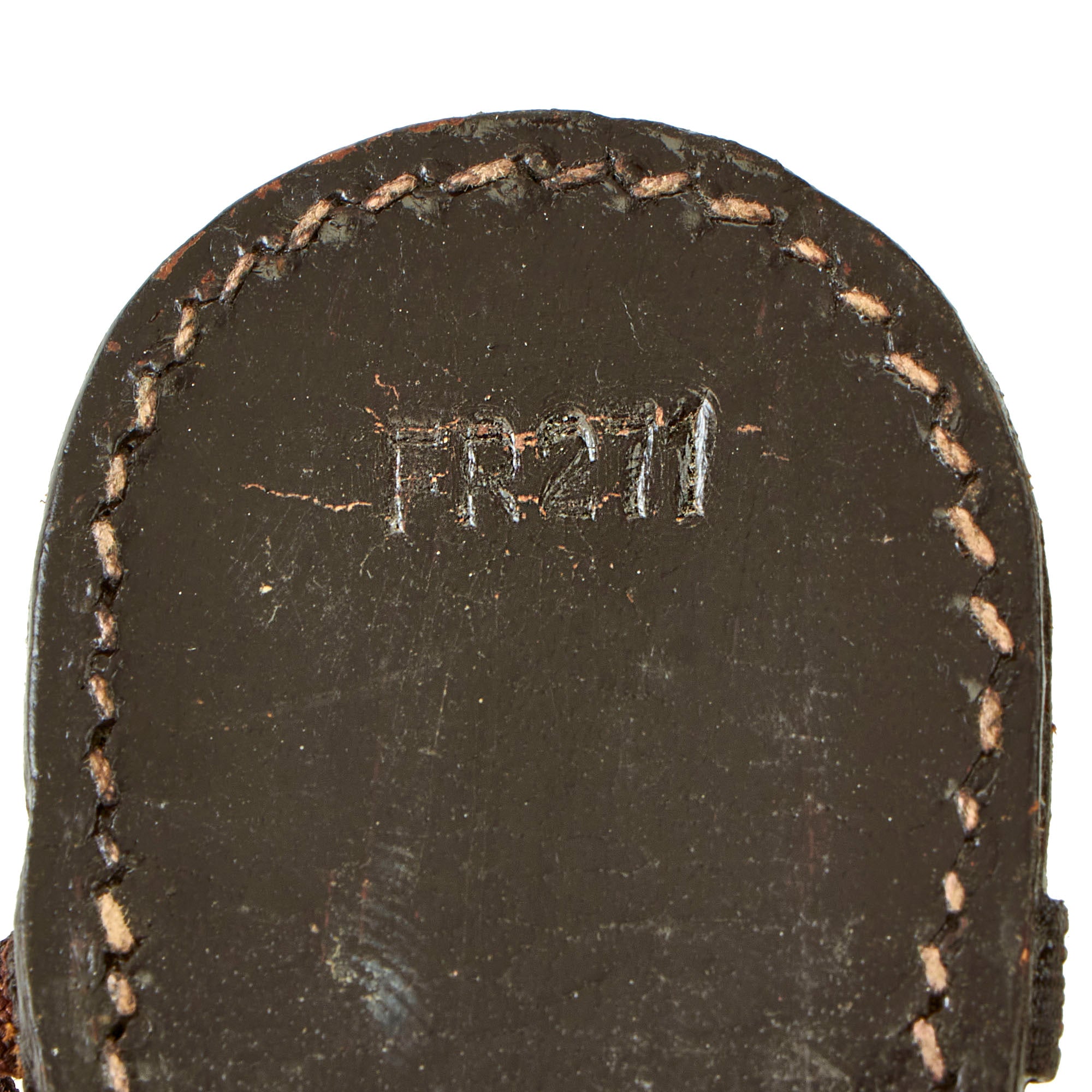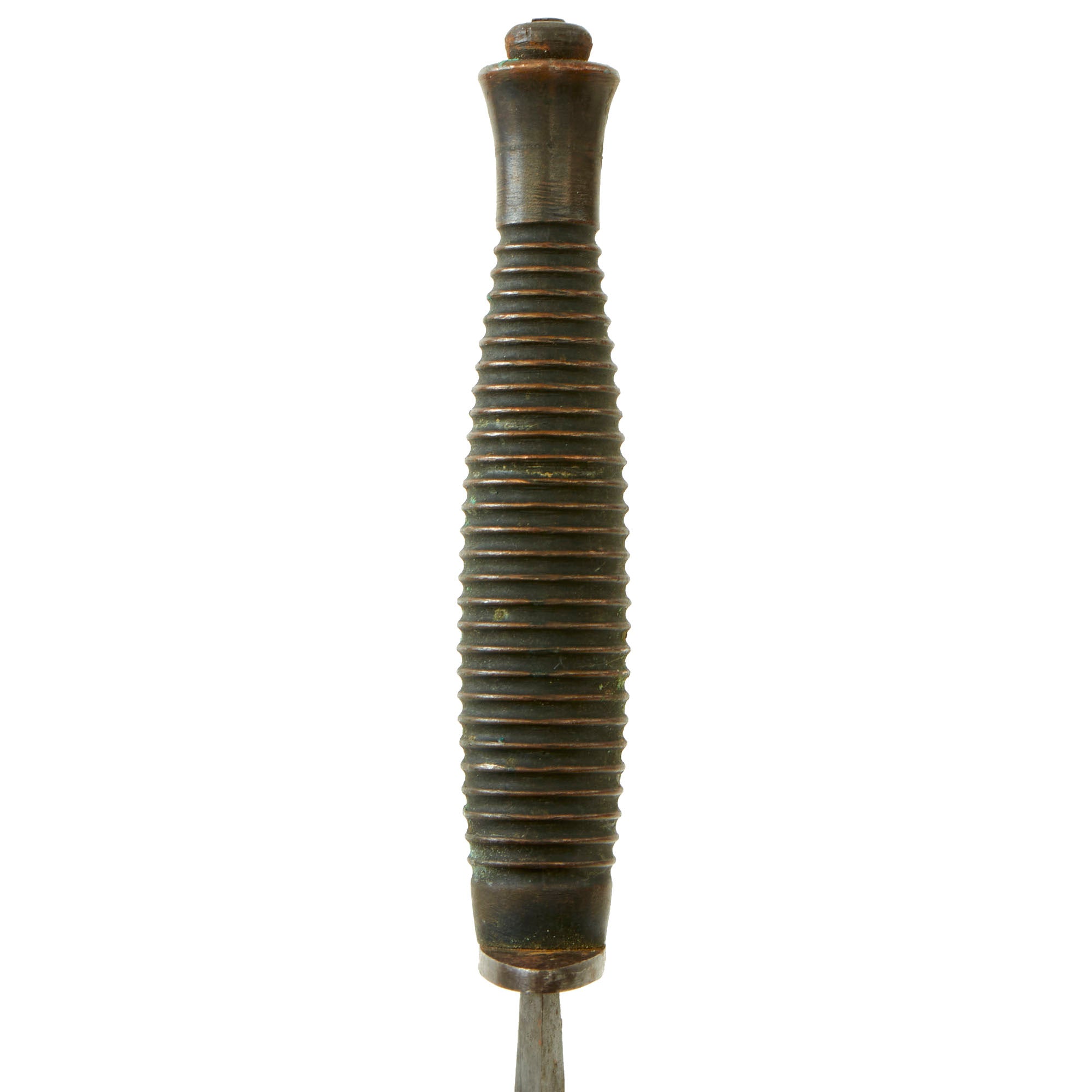 As brass was a "strategic material," only the early examples of the third pattern have brass handles, with later war produced models having alloy handles. The handle dates production to late 1943 - early 1944. The knives varied somewhat in size, and this example measures 11 5/8", with a 7 inch blade. This example comes with the original standard F/S Scabbard, with elastic at the top, though the elastic shows signs of deterioration.