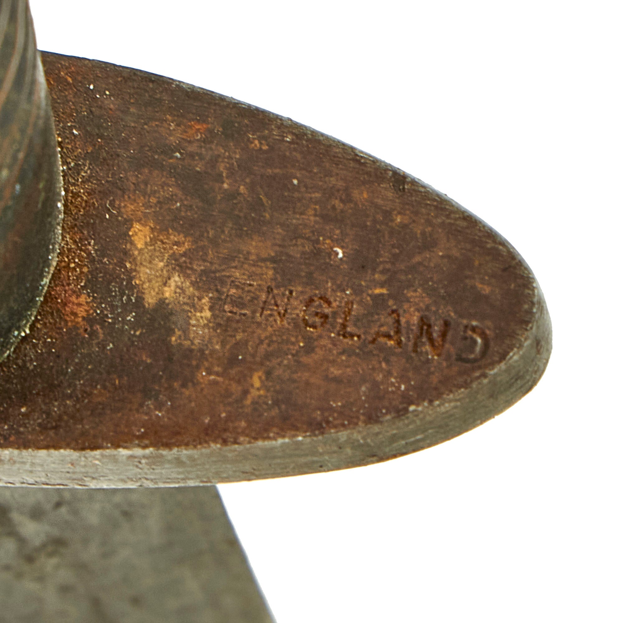 Condition of the knife is good, still with sharp edges, and almost 50 percent of the finish and a light coating of oxidation. The plain blued steel cross guard still retains some of the finish, and is marked on the underside of the grip with “ENGLAND” which was done for importation purposes. The handle is overall very good with little of the original black finish in the recesses of the grip.