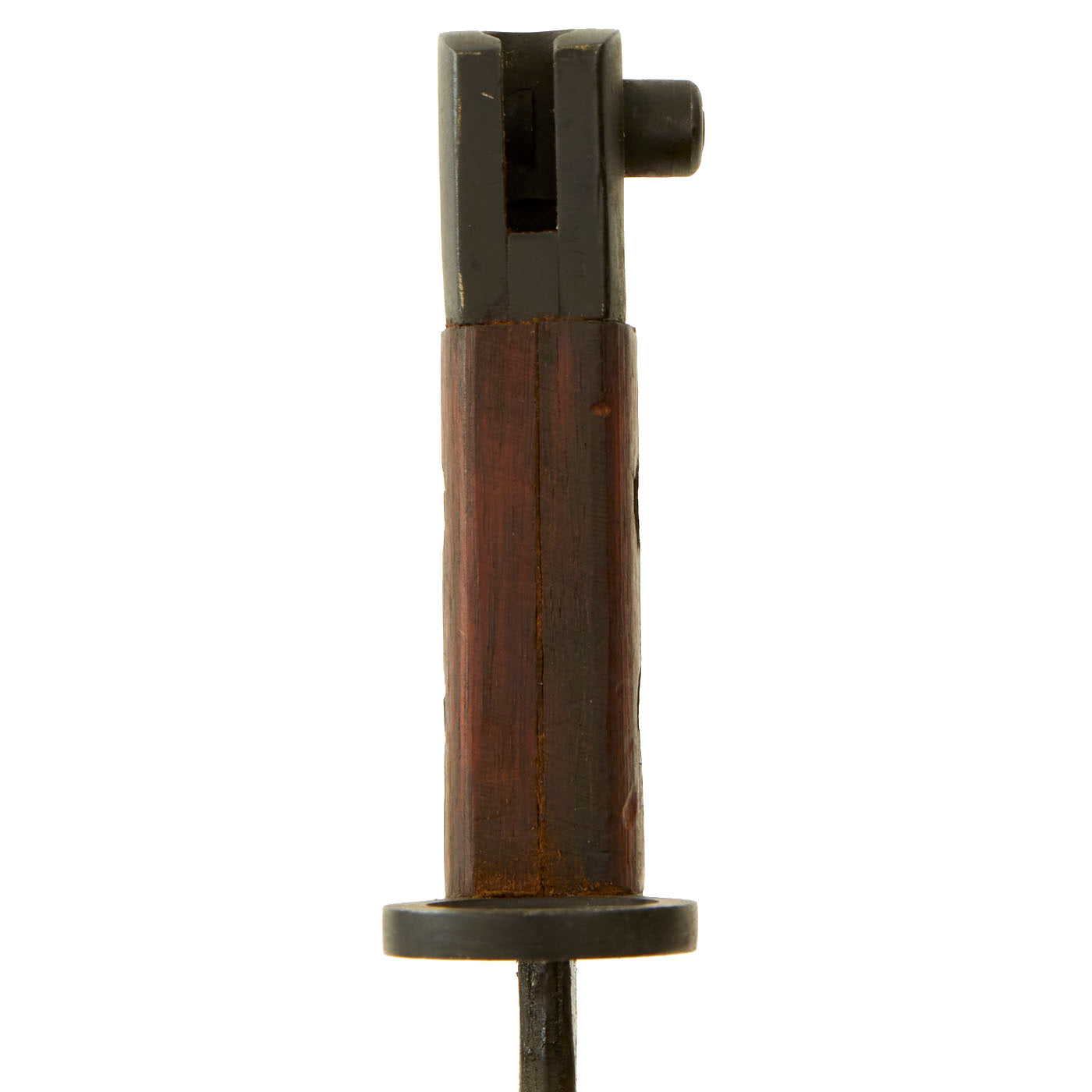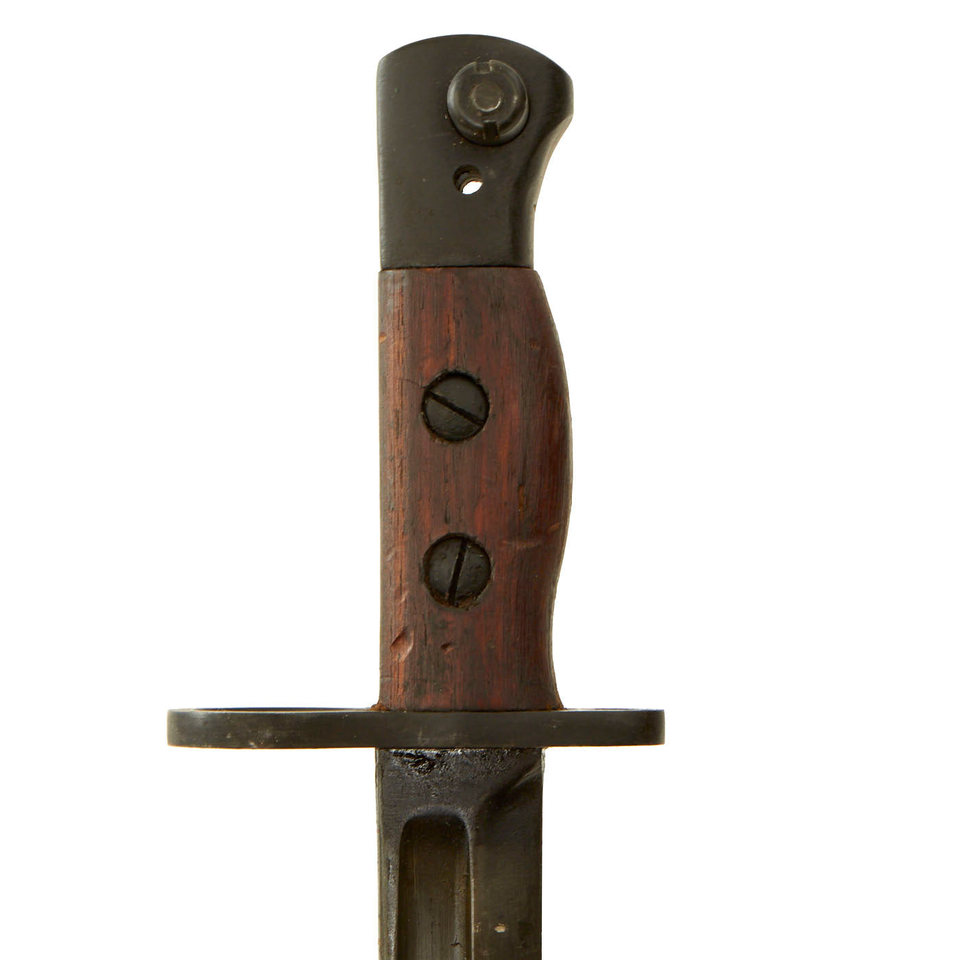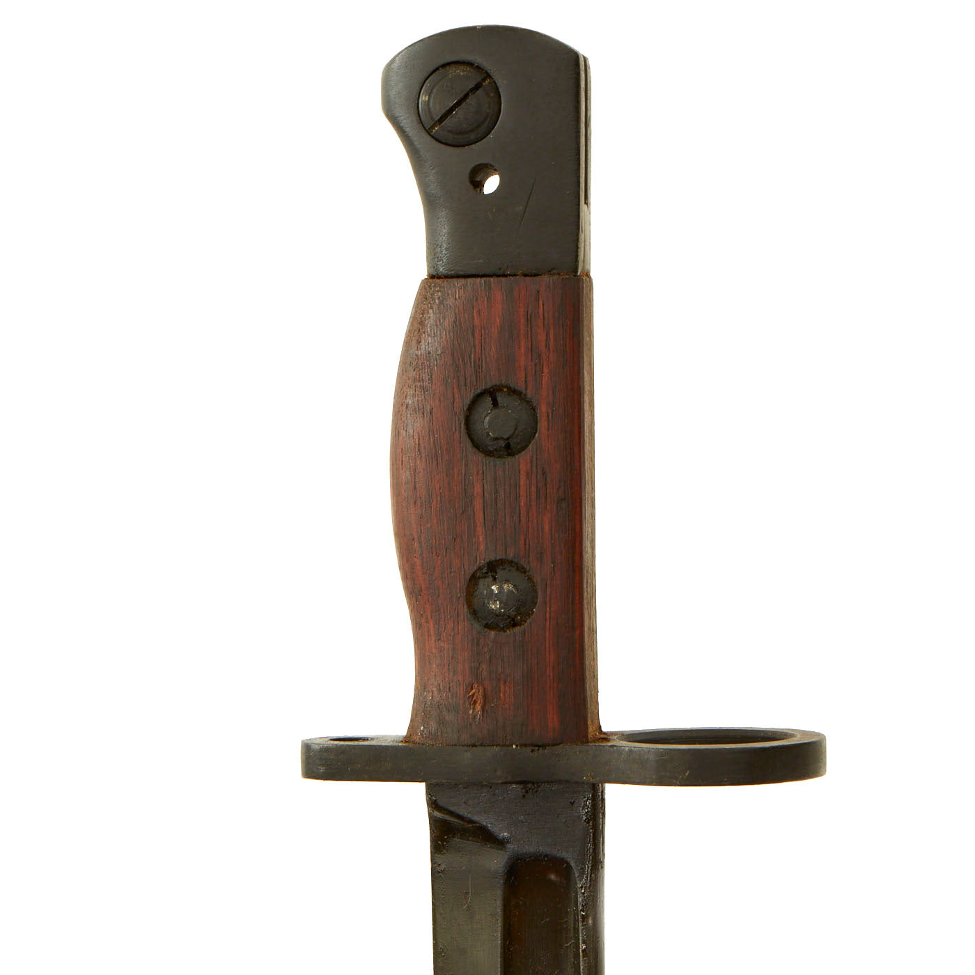 This is the second model of the No.5 Bayonet with two grip screws; the extremely rare MkI had the grip secured by a single screw and a press stud without the screw slot. The bayonet has a 7 3/4 inch "bowie" style clip-point blade, with a wide fuller running down each side, with an overall length of 12 inches. Unlike most bayonets, the wooden grip scales wrap completely around the tang. Comes complete with a correct steel-throated scabbard, painted black. Scabbards produced from the 50s onward had large brass throats.