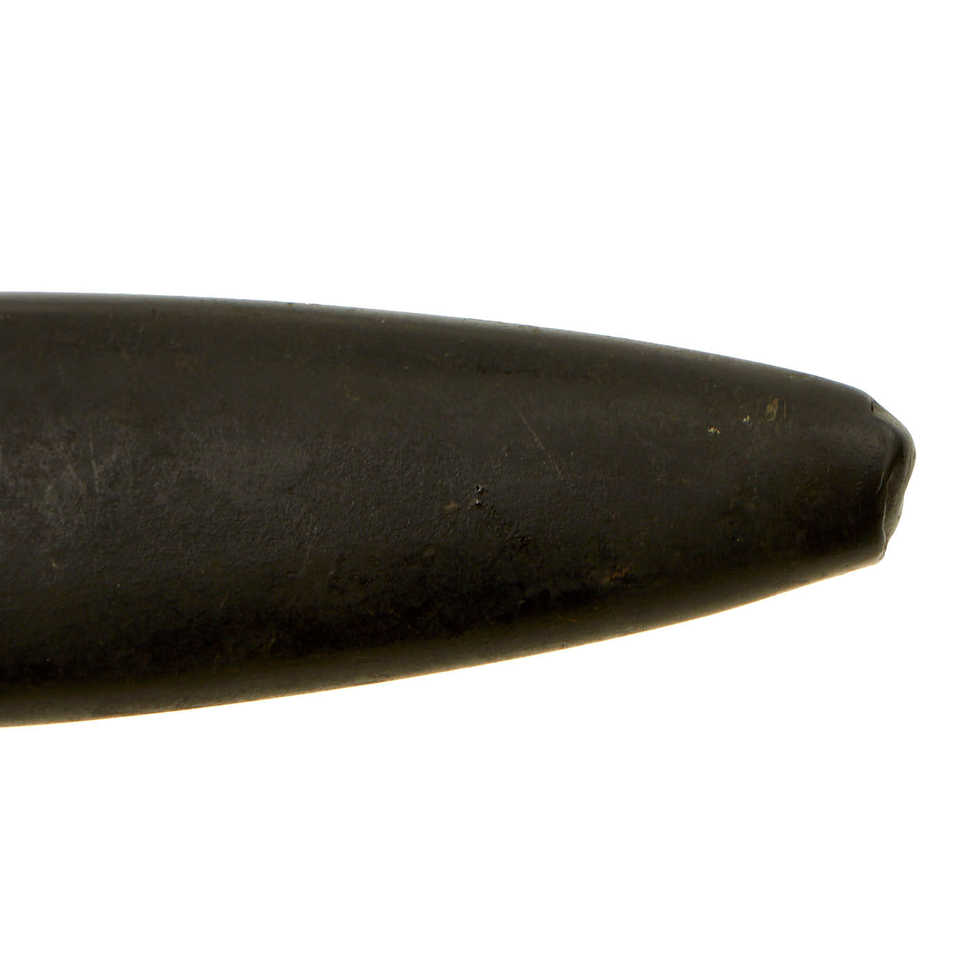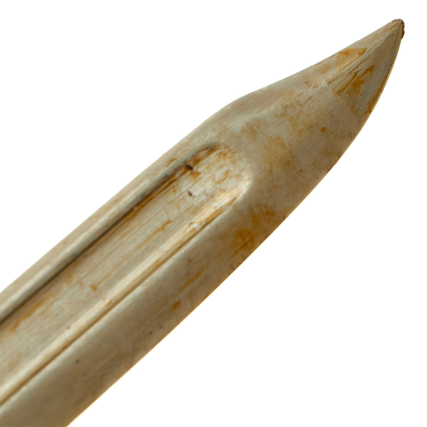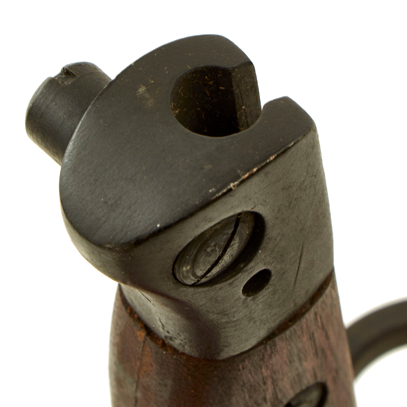 This is the second model of the No.5 Bayonet with two grip screws; the extremely rare MkI had the grip secured by a single screw and a press stud without the screw slot. The bayonet has a 7 3/4 inch "bowie" style clip-point blade, with a wide fuller running down each side, with an overall length of 12 inches. Unlike most bayonets, the wooden grip scales wrap completely around the tang. Comes complete with a correct steel-throated scabbard, painted black. Scabbards produced from the 50s onward had large brass throats.