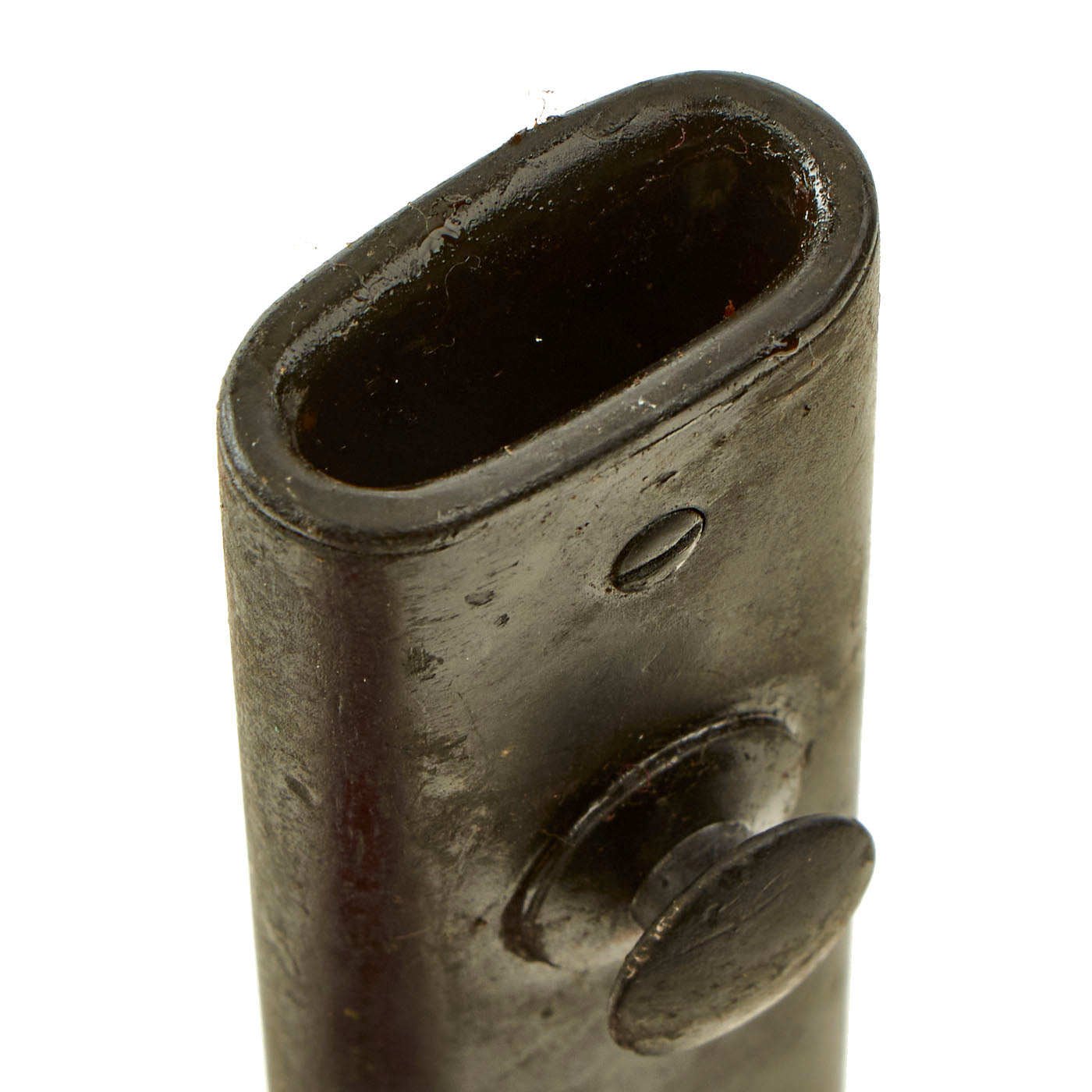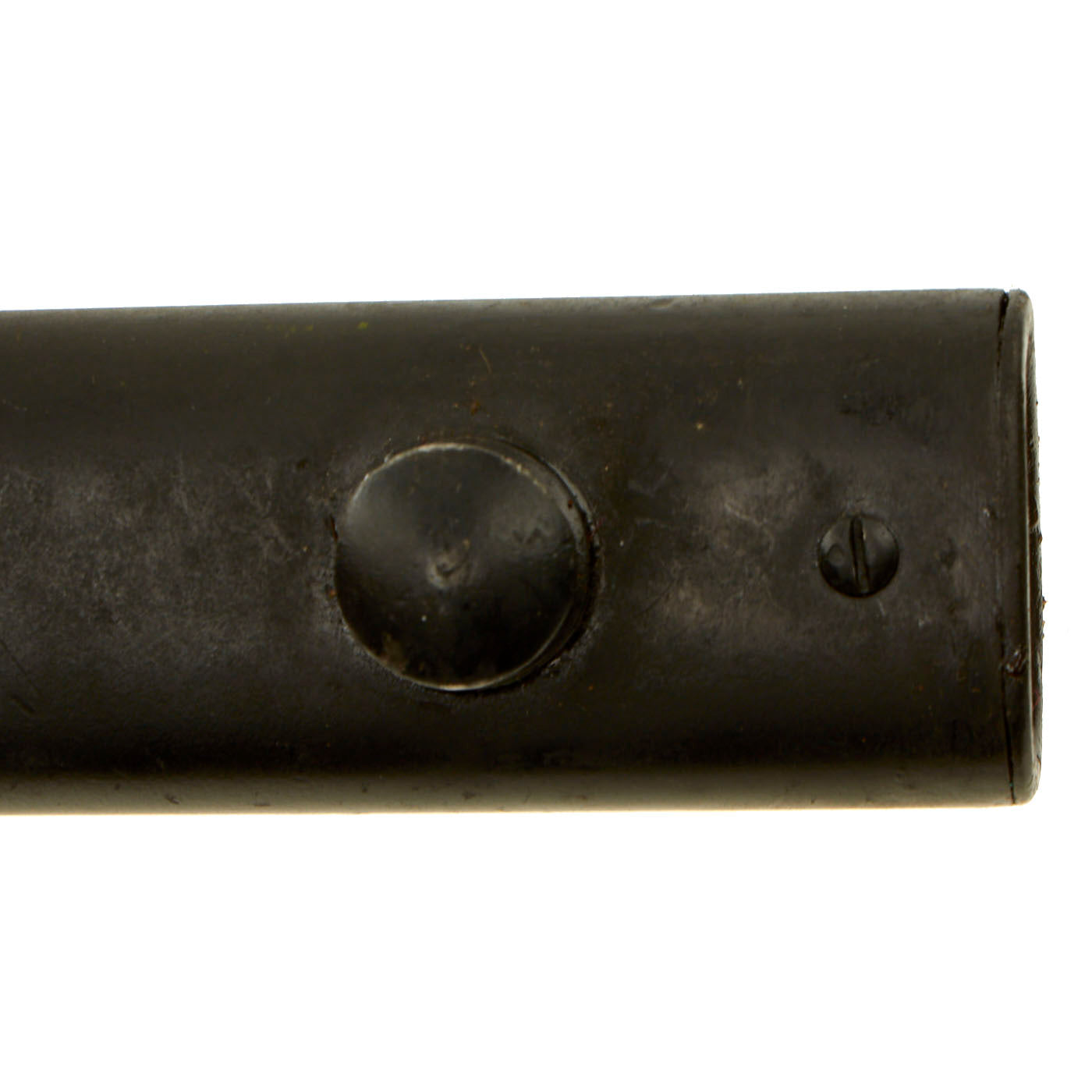 In very good condition, this bayonet still has the original bright finish on the blade, with the hilt blued. Many were refurbished post war, but this one was not, and the blade and hilt are still in great shape. The grips are a bit dark from oil and grease, but still are in very good condition. Ready to display with your No.5 Carbine!
