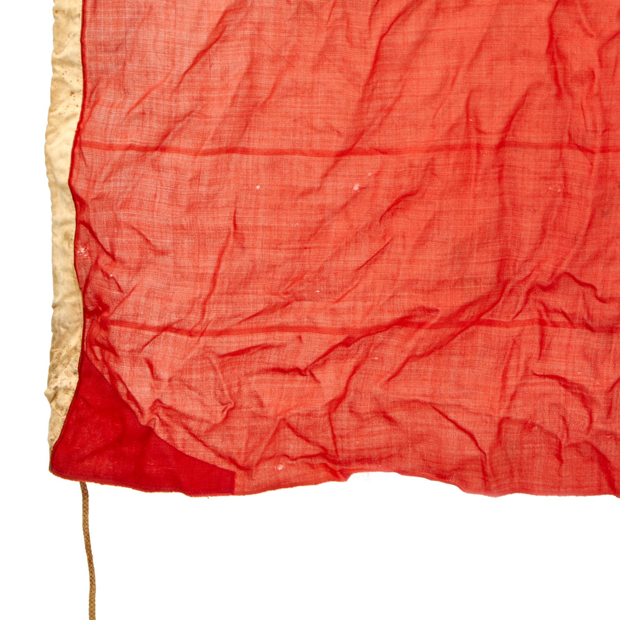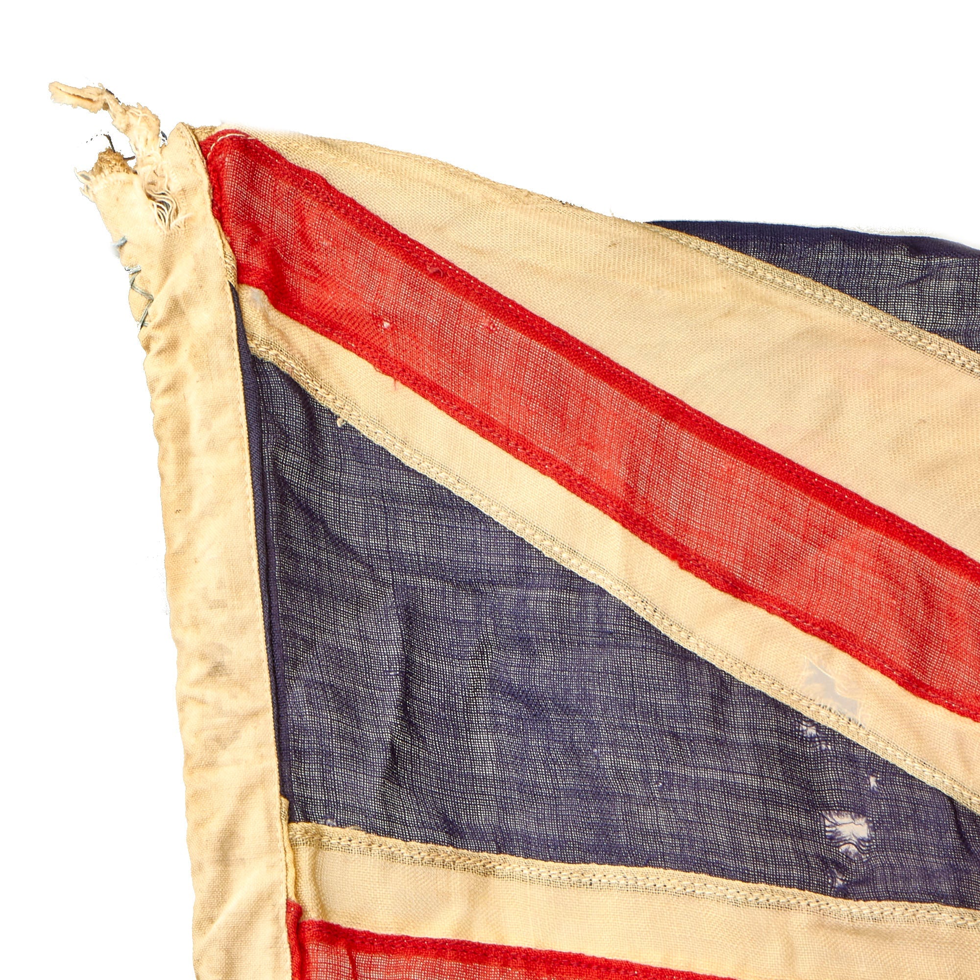 This Red Ensign measures approximately 126 inches by 52 inches and is in great, service used condition. There are holes and tearing scattered throughout, expected of a flag like this. The burlap hoist rope is still present and in good condition. This is a wonderful and genuine example of a WWII era Ensign and comes ready to display in your Empire collections!