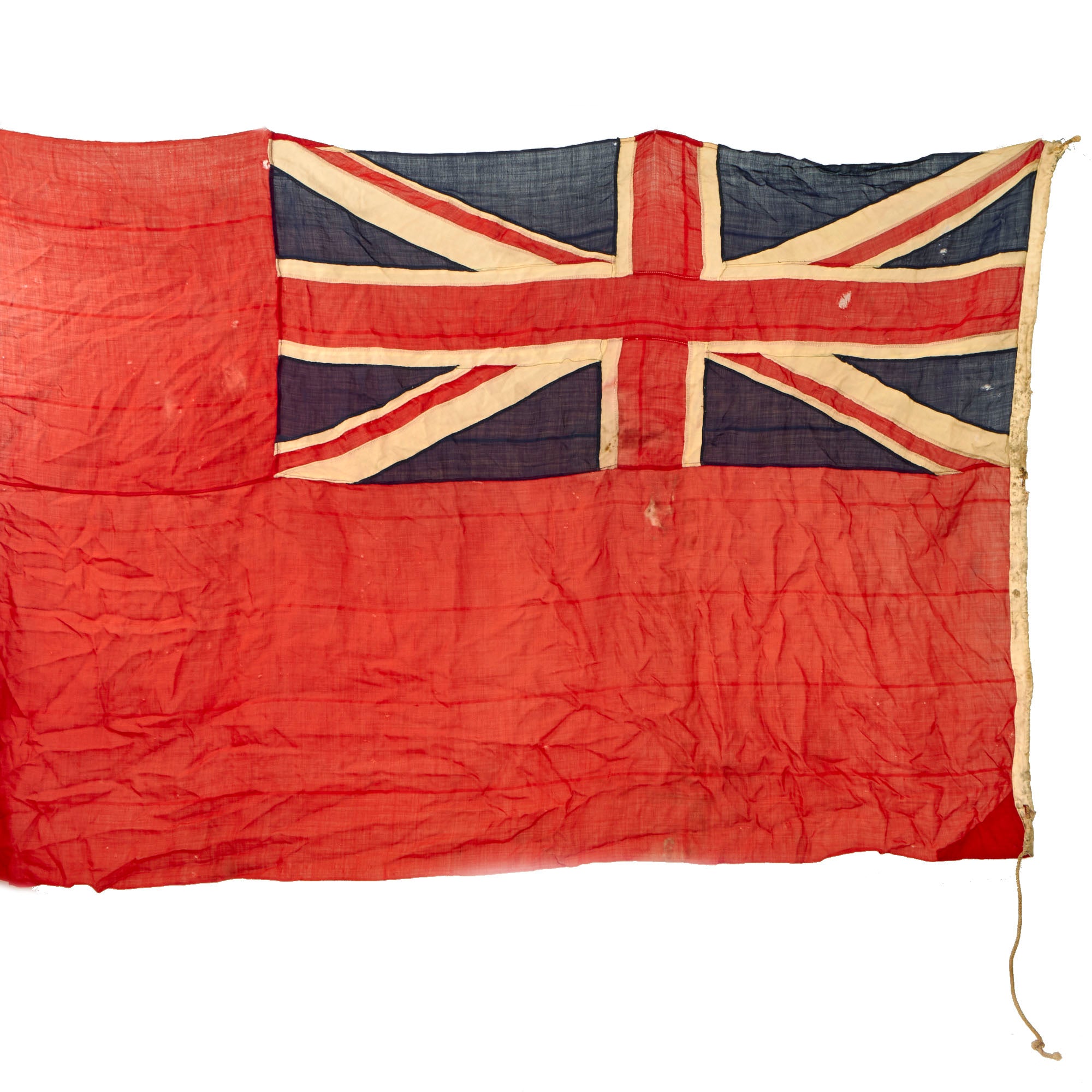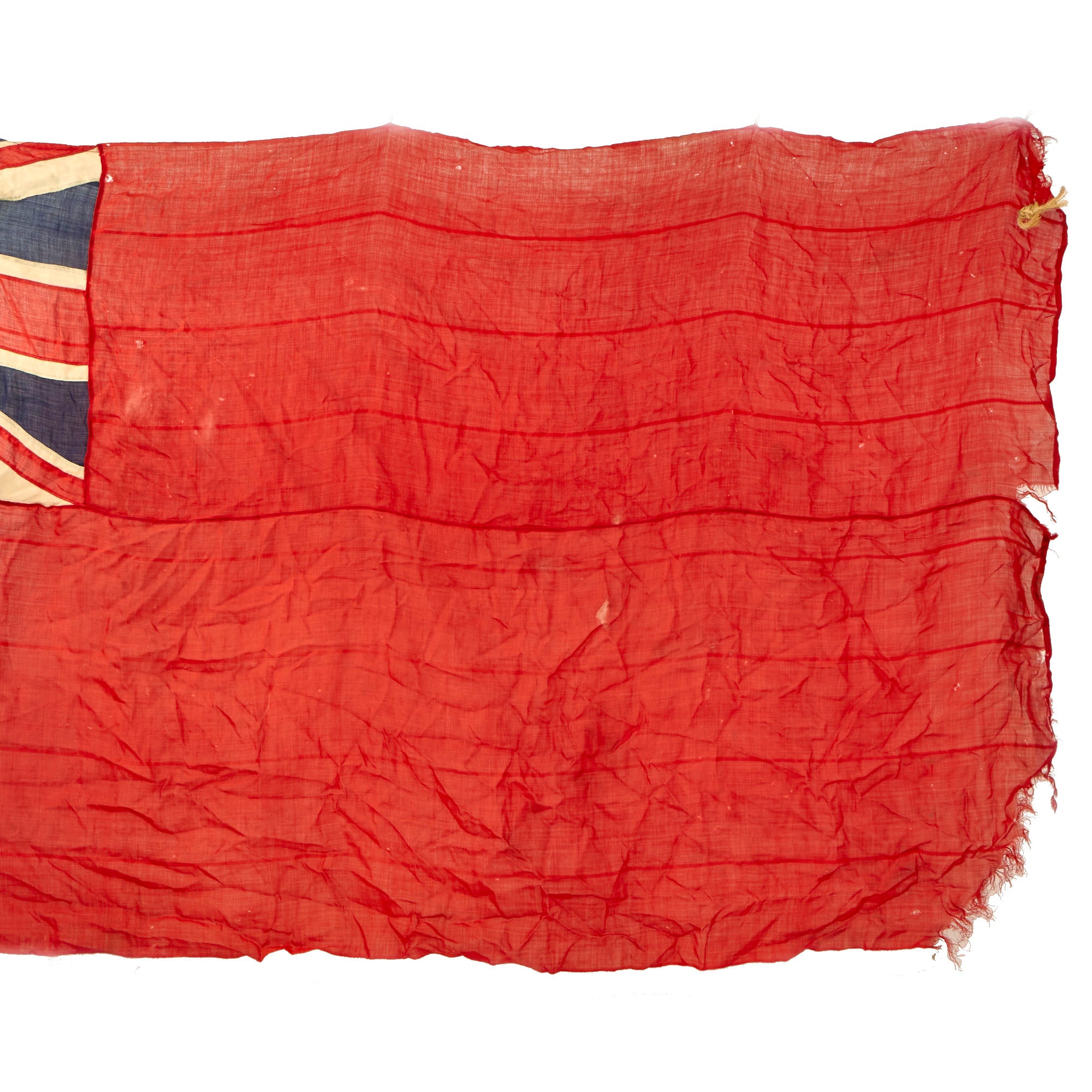 Original Item: Only One Available. This is a massive WWII era British Red Ensign which shows signs of a long life at sea! This is one of the largest of these Ensigns we have seen here at IMA. It is salty and worn, just how you like to see Naval flags.